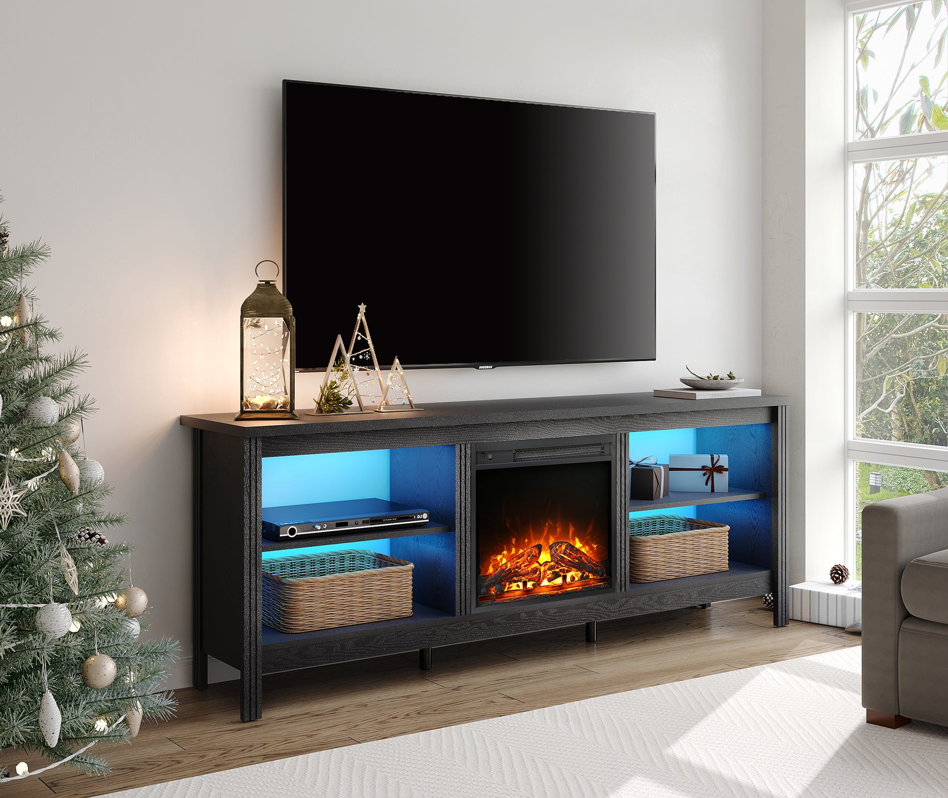 【Elegant Fireplace TV Stand】Comes with a LED light strip, creating amazing lighting effect and warm atmosphere.Featuring custom stone pattern tabletop and handmade fluted wood door, it will be an eye-catching piece of furniture in the room. 【Suitable for 75 inch TV】The led tv stand is made of premium-quality particle board material and extra thickened legs makes it more stable and sturdy. Last for years of use. The TV console can hold a flat screen TV up to 75-80 inch. 【Electric Fireplace Insert】The white fireplace TV stand with 18” electric fireplace can be used WITH or WITHOUT heat. You can put the fire place to bring warmth to the cold winter. 【Premium Material】Crafted of selected P2 MDF material without any smell and no harm to human body, the fireplace entertainment center offer a long service life.Dimension: 70”×15.6”×23.2”(L×W×H). 【Easy Assembly & 2 Packages】The television stands and fireplace insert are shipped separately, so you may receive 2 packages at different times.