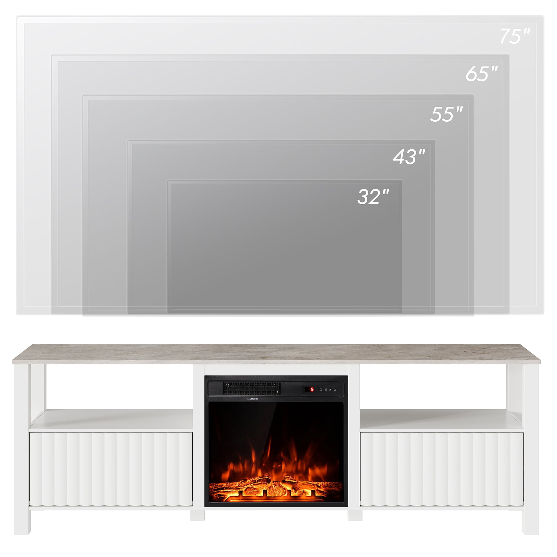 Modern and contemporary design accommodates TVs up to 75 inch Constructed of sturdy MDF and wood in a handcrafted finish Comes with a 16 color led light strip, adjustable brightness, four mode for you to choose Unique fix marble tabletop and fluted door design With 2 open shelves and 2 enclosed cabinets for ample storage space Feature a removable 18″ electric fireplace Fireplace heat coverage for 400 sq. feet and an automatic temperature cut-off for safety 1-Year Limited Warranty Included