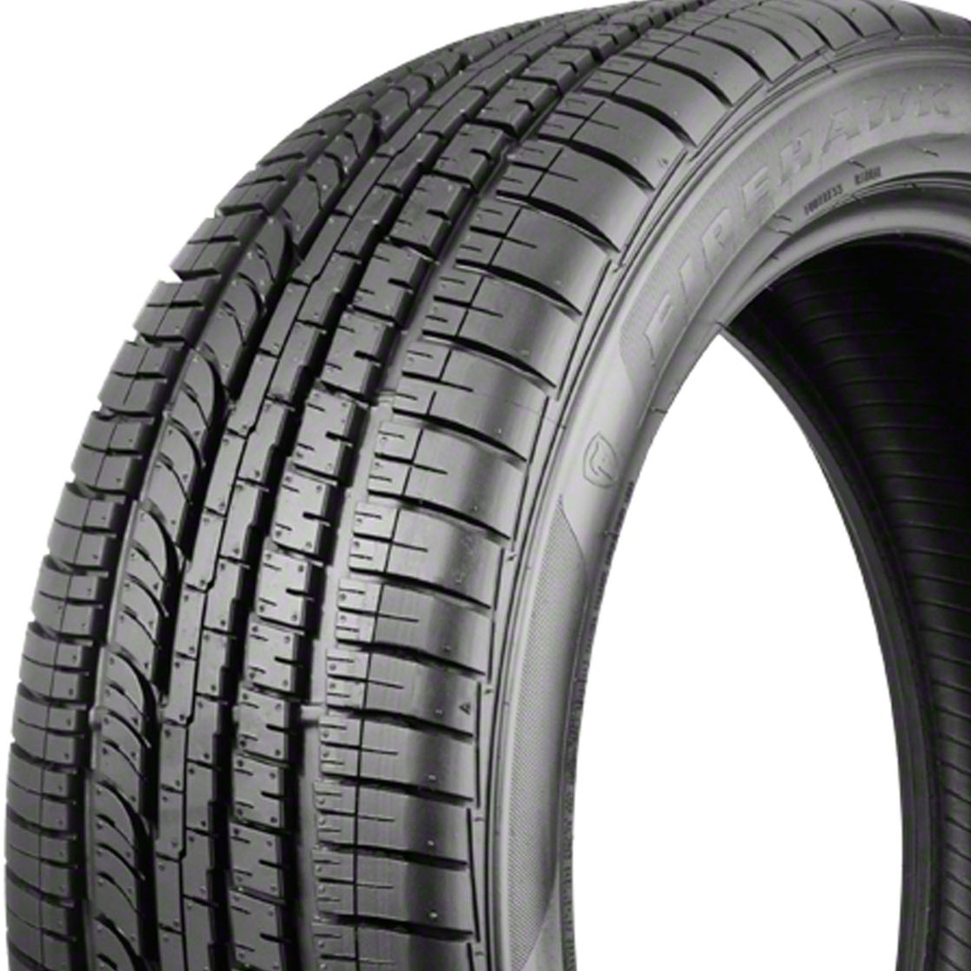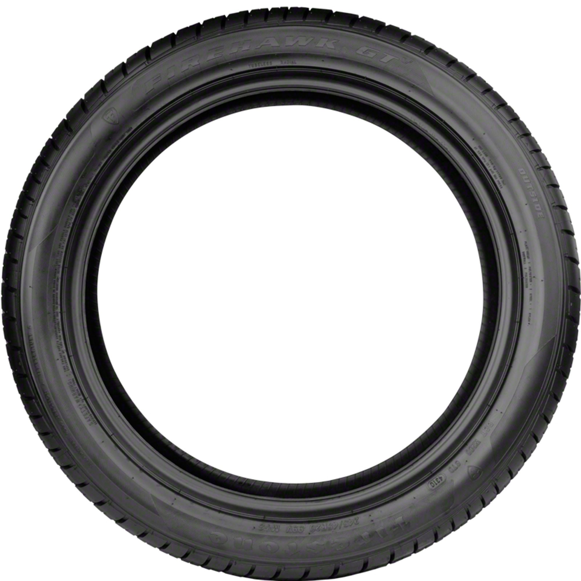 Firestone Firehawk GT FEATURES AND BENEFITS All weather traction Enhanced handling Comfortable drive High speed performance OVERVIEW The Firestone Firehawk GT is a performance and high performance, all season tire manufactured for passenger vehicles. It has some touring sizes too. Firestone offers a 50,000 mile treadwear warranty with the H and V speed rated tire sizes of this tire model. The tire promotes exceptional all weather traction. The first-rate dry, wet and winter weather road gripping ability is achieved with the silica-based tire compound and the asymmetric dual pattern tread design. The silica in the compound keeps the tread flexible in different weather conditions, while the all season asymmetric tread design incorporates different tread elements to ensure excellent dry, wet and winter weather traction. The tread’s wide circumferential and lateral grooves actively resist hydroplaning by eliminating water and slush from below the tire’s footprint. The enhances traction and hydroplaning prevention ensure a safer year round driving experience. The model’s controllability is also updated. The continuous center rib of the wider tire footprint ensures constant road contact. The better road contact enhances the steering responsiveness and the driving stability. The steering becomes quick and precise in its response to the driver’s commands, while the tire’s structure is stabilized against the driving pressure affecting it. The wider footprint guarantees constant contact with the road surface, which also increases the number of biting edges that grip the road. The higher number of biting edges promote a stronger cornering and maneuvering ability. The improved maneuvering promotes a secure drive. The special tread design and internal structure work together to ensure a comfortable driving experience. The tread design features the special Veri-Pitch technology and a continuous center rib that optimize the tread pattern to negate the road noise. It generates a sound frequency that cancels the road noise created while the tires are in motion out and ensures a road noise free drive. The tire’s internal structure features a polyester cord body plies that enables the tire to closely follow the road surface in all weather conditions. This decreases the road vibrations felt in the vehicle’s cabin by the passengers during the drive. This combination promotes a comfortable and quiet driving experience all year. The Firehawk GT has superb high speed performance. The tire maintains its optimal shape even under the high speed driving pressure and prevents deformation. The steel belted construction and the continuous spirally wrapped nylon strands stabilize the structure and ensure a safer driving experience. As the tire does not deform under the high speed driving pressure, it is capable of performing to its highest capability. Manufacturers recommend changing tires every 10 years. As long as tires are properly stored before they are sold, the year of their manufacture will not shorten their service life.
