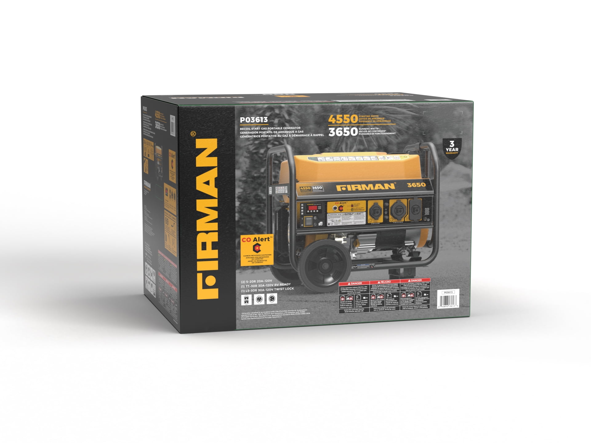 The FIRMAN P03613 Gas generator stands alone. This generator comes with new PGMA compliant CO shutoff alert system. Equipped with 3650 running watts / 4550 starting watts and runs at 67dB. The ergonomic grip makes for simple starting with the reliable recoil start. 30A plugs, 120V power California and Canada emissions certified, and RV ready with a 4-in-1 data minder measuring Volts, Hertz, Hrs and low oil indicator makes this the perfect machine. Our Max Pro Series 208cc engine runs cool and efficient thanks to the Phoenix Fat Head Block. Equipped with a 5 gallon fuel tank, the P03613 runs for 14hrs. Work. Play. Enjoy! Note: Everything you need is in the box including: oil, funnel, operator’s manual, and spark plug wrench.