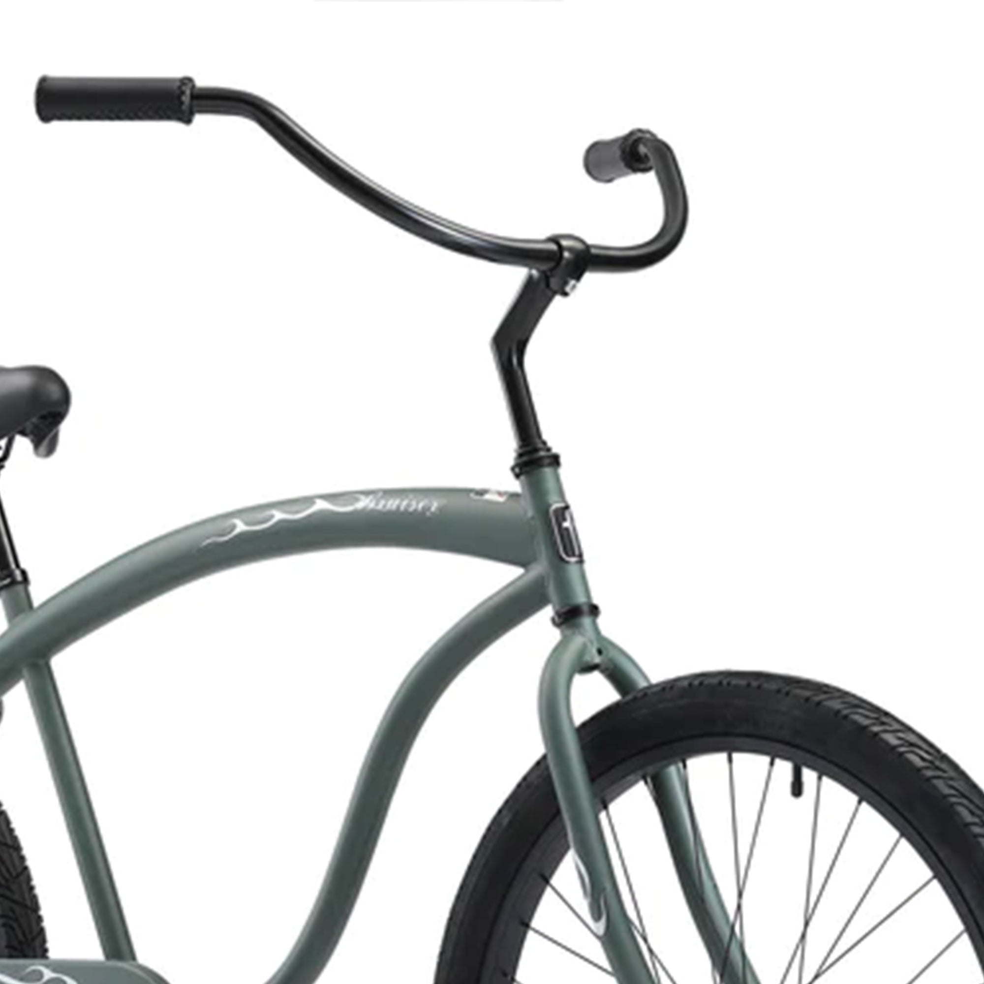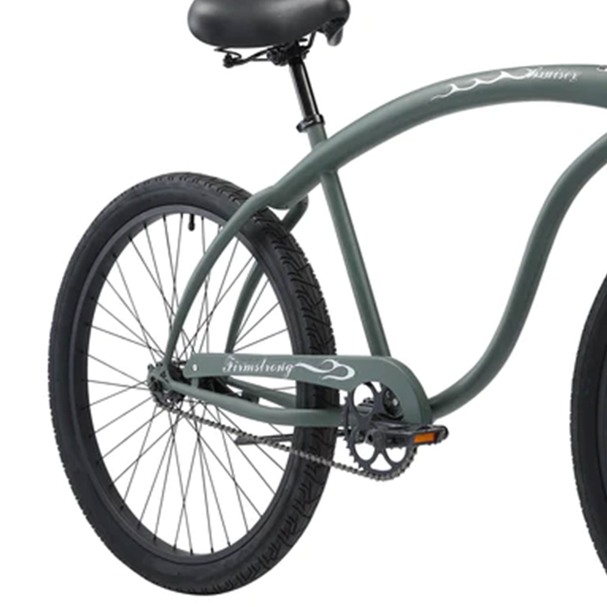 Great recreational riding bike that fits most men 5.5 to 6.2 feet tall; 19-inch extended frame creates more space between rider and handlebars Single-speed bike features a pedal-backward coaster brake for easy pedaling and smooth braking All black 2.125-inch wide tires provide a cushioned, relaxed ride for easy rolling Painted black 28.5-inch wide handlebars with synthetic leather black grips add a stylish touch Classic padded single-coil spring saddle seat and handlebar height and tilt can be adjusted to fit the rider properly Pedals: Resin block Chain: KMC Z-410 Crankset: Forged one piece, 40T chain wheel Material: Steel Color: Matte army green Dimensions (L x W x H): 72.00 x 28.00 x 45.00 inches Weight: 36.00 pounds Manufacturer warranty: 1-year warranty