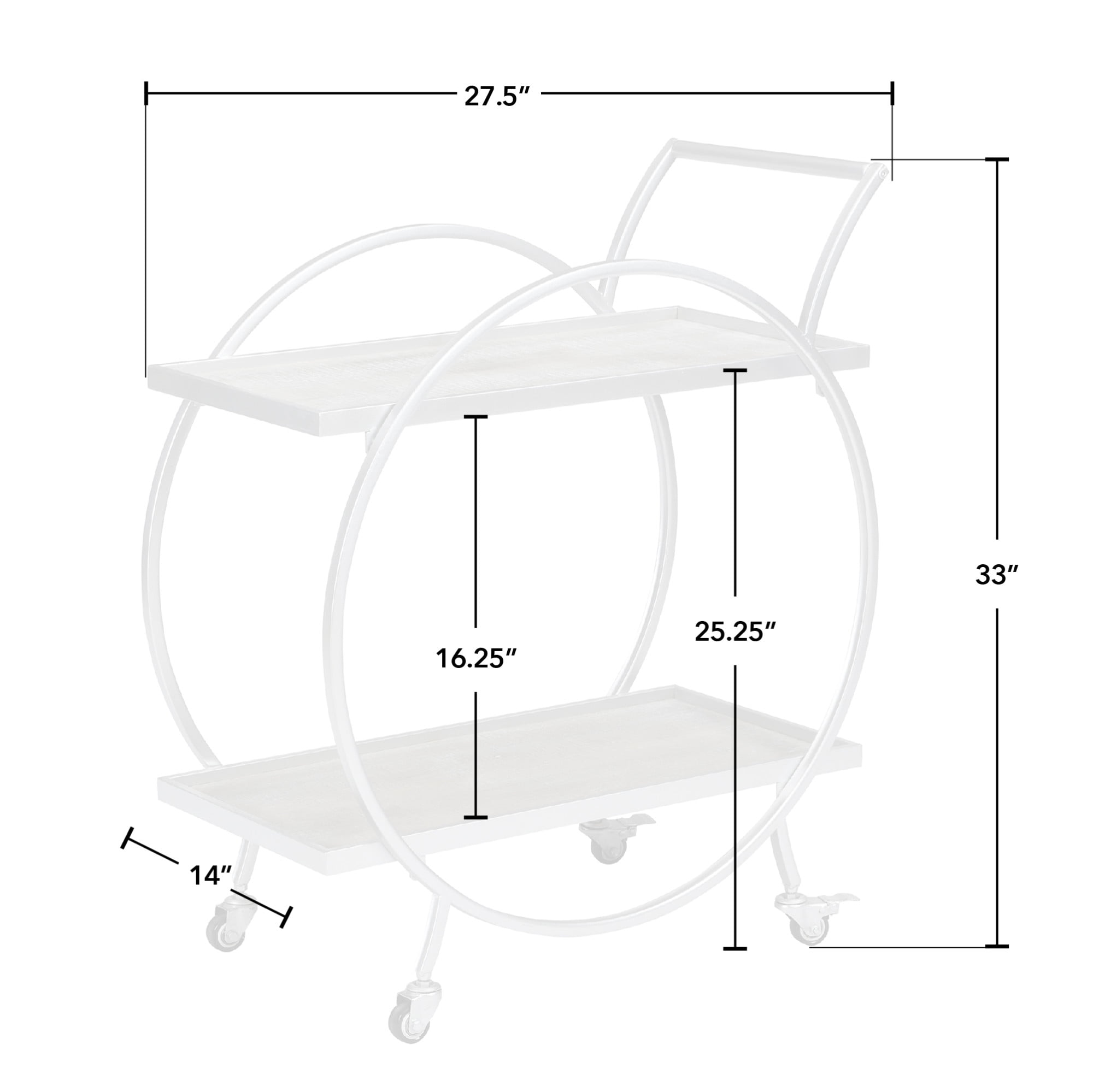 SIZE MATTERS – Our FirsTime & Co.® Silver And Gray Odessa Bar Cart has a 33″ height, 27.5″ width and 14″ depth, allowing it enough room to hold your drinks and snacks as well as making it convenient enough to place in any room. The height from the floor to the top shelf is 25.25″ IT’S IN THE DETAILS – This silver bar cart is a versatile piece with a silver metal frame and 2 wooden shelves. The open design allows you to set drinks and snacks on each level, and it comes with four metal wheels for easy maneuvering. MORE THAN IT SEEMS – This bar cart can also work as a coffee cart, dining storage, or even as an end table. THE PERFECT TOUCH – Our FirsTime & Co.® Silver and Gray Odessa Bar Cart is a gorgeous, functional accent piece for any kitchen or bar. Full assembly required with step-by-step instructions included INDUSTRIAL STYLE – Whether moving into a new home or looking for a gift, make an accent statement in your entryway, kitchen, living room or bathroom with a stylish and decorative Industrial and Modern piece from FirsTime & Co.