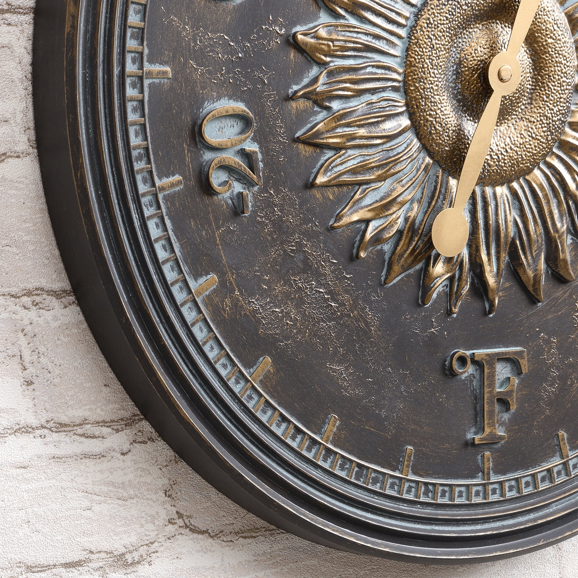 SIZE MATTERS – Our FirsTime & Co. Verdigris Calisto Sunflower Indoor Outdoor Clock and Thermometer 2-Piece Set each has a 16″ height, 1.12″ depth, and 16″ length making them the perfect size for any outdoor space including covered patios, gardens, and pool areas IT’S IN THE DETAILS – Our round FirsTime & Co. Verdigris Calisto Sunflower Indoor Outdoor Clock and Thermometer 2-Piece Set has an antiqued bronze finish and is made of plastic FASHIONABLE AND FUNCTIONAL – This beautiful matching clock and thermometer set feature a sculpted sunflower accent and an antique face with gold and teal patina, making it perfect for decks, patios and pool-side areas HANG IN THERE – This clock is designed to be hung on the wall indoors or outdoors under a covered area, away from exposed elements like extreme heat, cold and rain. It includes 1 wide slot on each piece for easy installation. Hanging hardware is not included. It requires 1 AA battery for operation, not included RUSTIC STYLE – Whether moving into a new home or looking for a gift, make an accent statement in any room with a stylish and decorative rustic and farmhouse piece from FirsTime & Co.