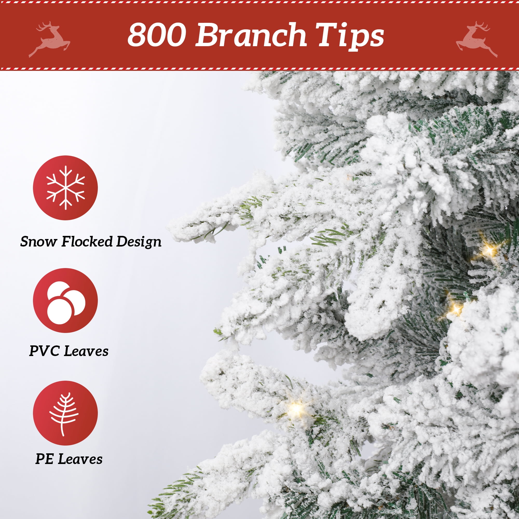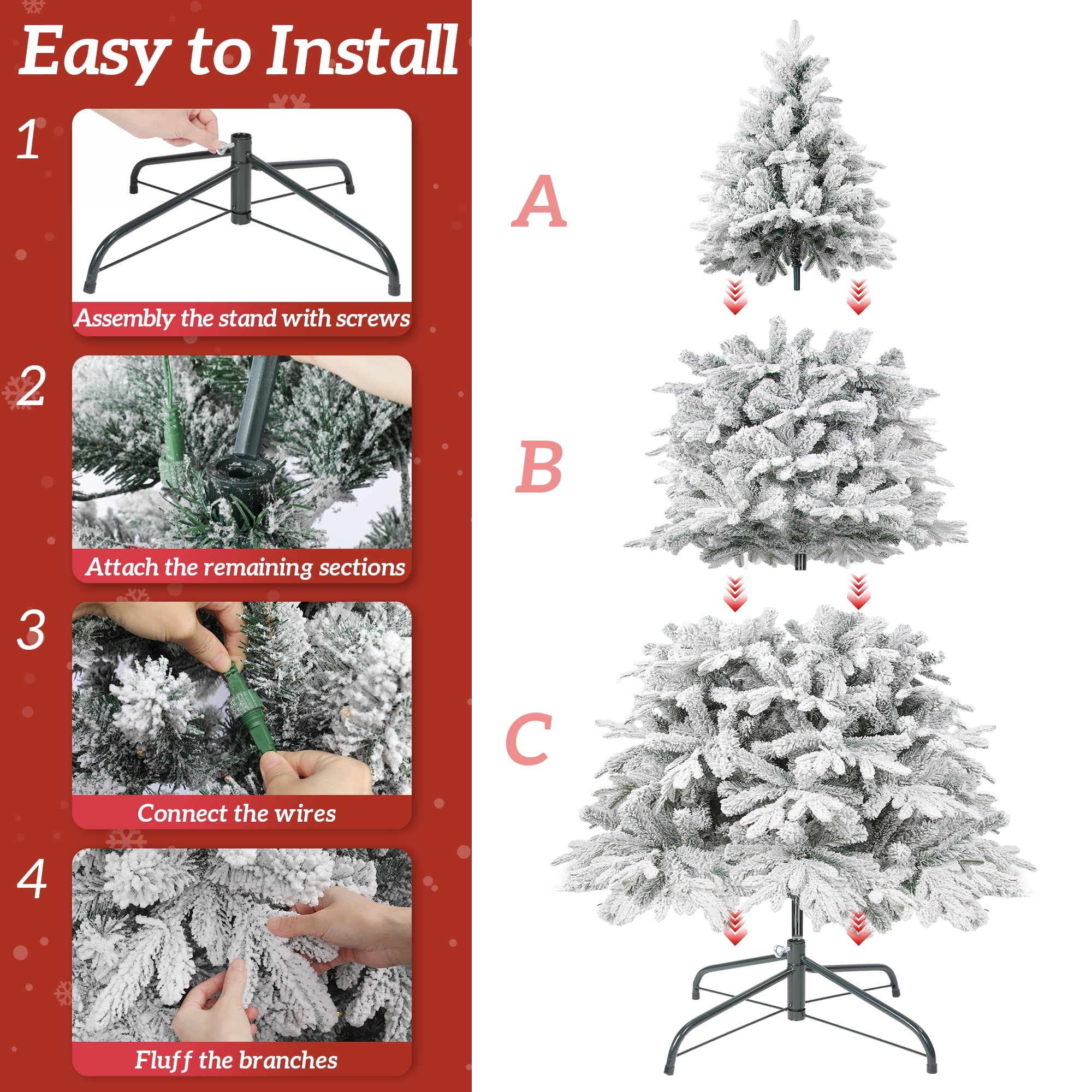 Tree branches are covered with white snowflakes, just like a real snow scene in nature, adding winter charm to your home. All branches and tree tips are made of high-quality PE+PVC, while the trunk and brackets are made of sturdy metal. The 1000 branches are strong enough to carry additional decorations. The premium materials and sturdy construction will ensure long-lasting use every winter. This artificial christmas tree comes with 300 resin warm light bulbs and 8 functional lighting effects, allowing it to shine all night in the indoor/mall during the holidays worth celebrating. No need to add additional lights to create a warm and charming atmosphere. The 6-foot tree body is divided into 3 parts, which is very simple to install. All lights are pre-installed and no additional connection is required. The bottom bracket can also be easily screwed to the tree body. We come with gold ribbons and snowflake decorations to create a more exquisite and festive atmosphere for the whole tree. Decorating this plump and natural Christmas tree with your family and loved ones will surely create beautiful memories. Main material: PE+PVC, Iron Number of Lights (6ft/7.5ft/9ft): 300/600/900 Lights Number of Branch Tips (6ft/7.5ft/9ft): 1000/1500/1800 Tips Assembled Product Size (6ft/7.5ft/9ft): 3.2×3.2x6ft/3.7×3.7×7.5ft/4.4×4.4x9ft 1x Pre-Lit Christmas Tree 10x 2in Pink Snowflake 10x 2in Gold Snowflake 10x 2in Red Snowflake 1x 16.4ft Gold Ribbon