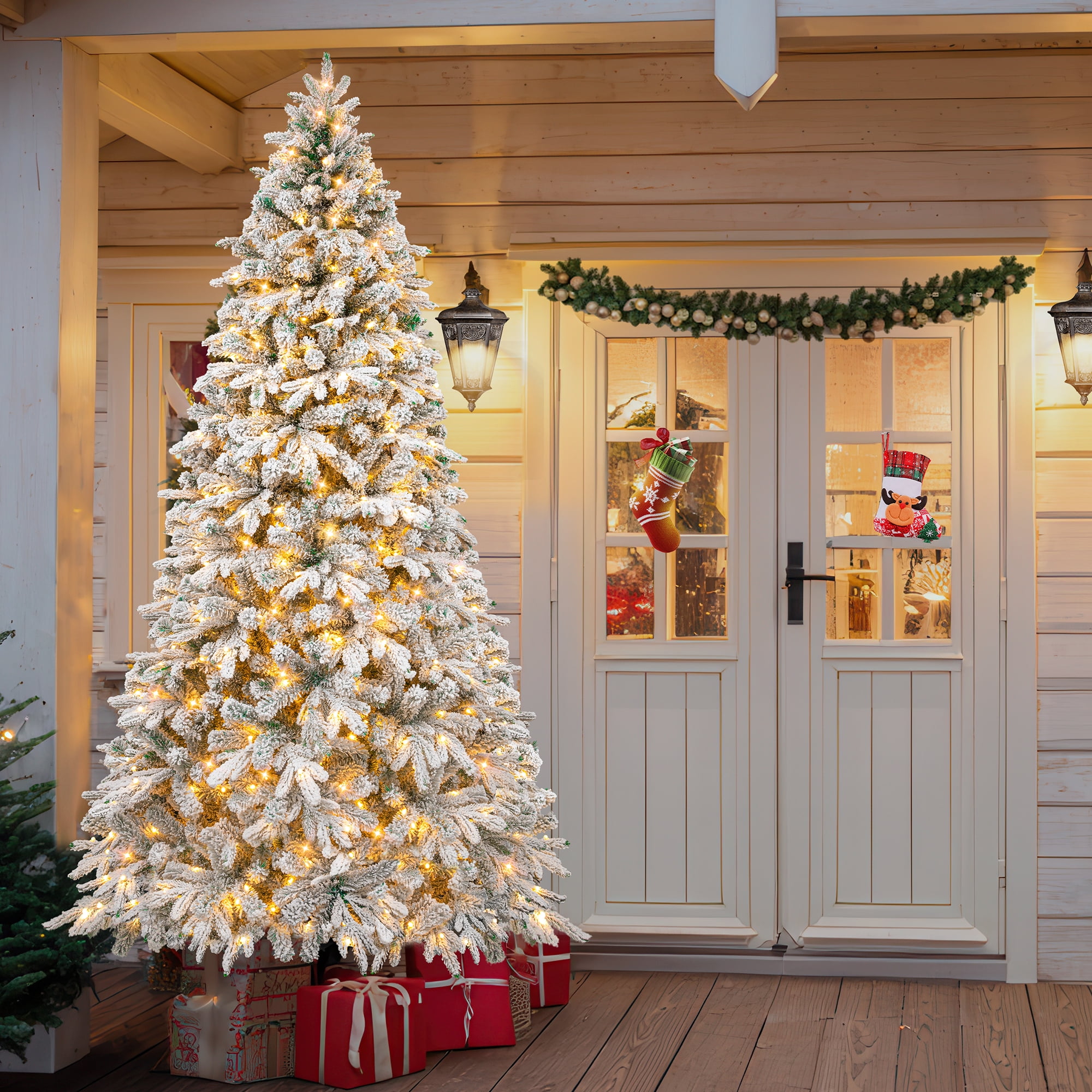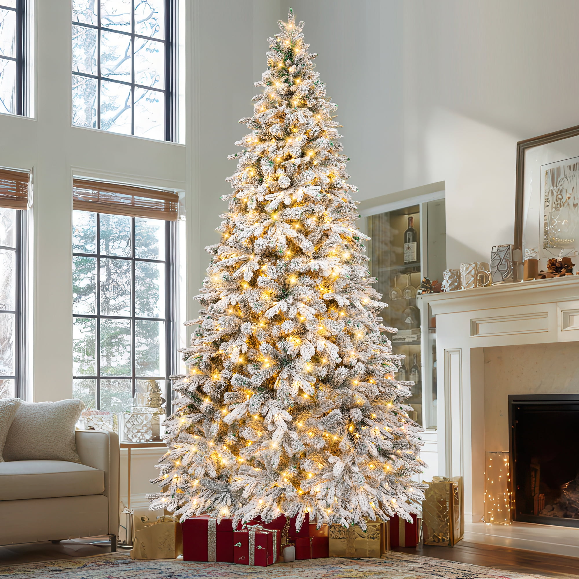 Firstness 6ft Pre-Lit Snow Flocked Artificial Christmas Tree with 1000 Branch Tips 300 Warm Lights. It comes with gold ribbons and snowflake decorations that add a touch of elegance and warmth to your holiday season, creating a fantastic winter atmosphere.