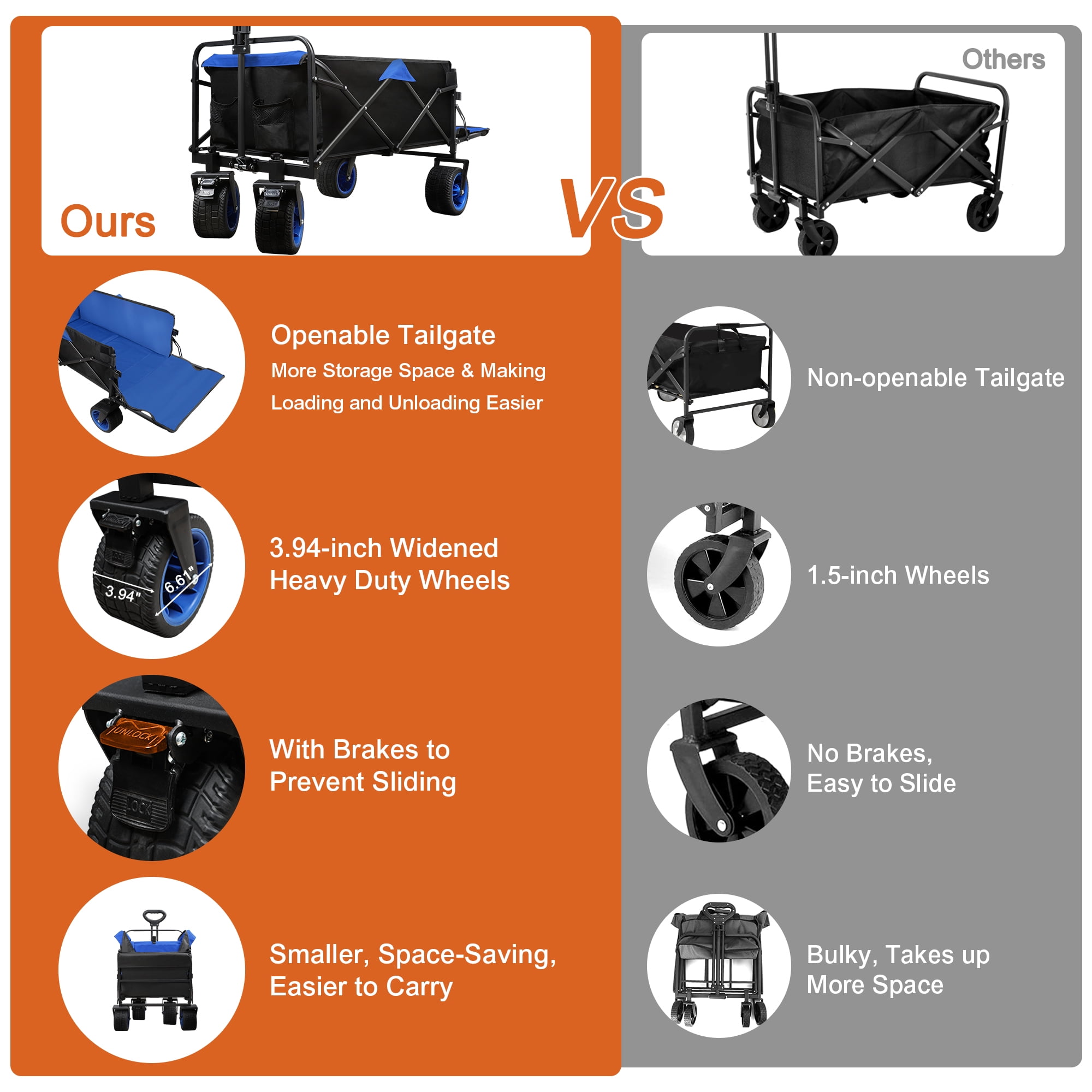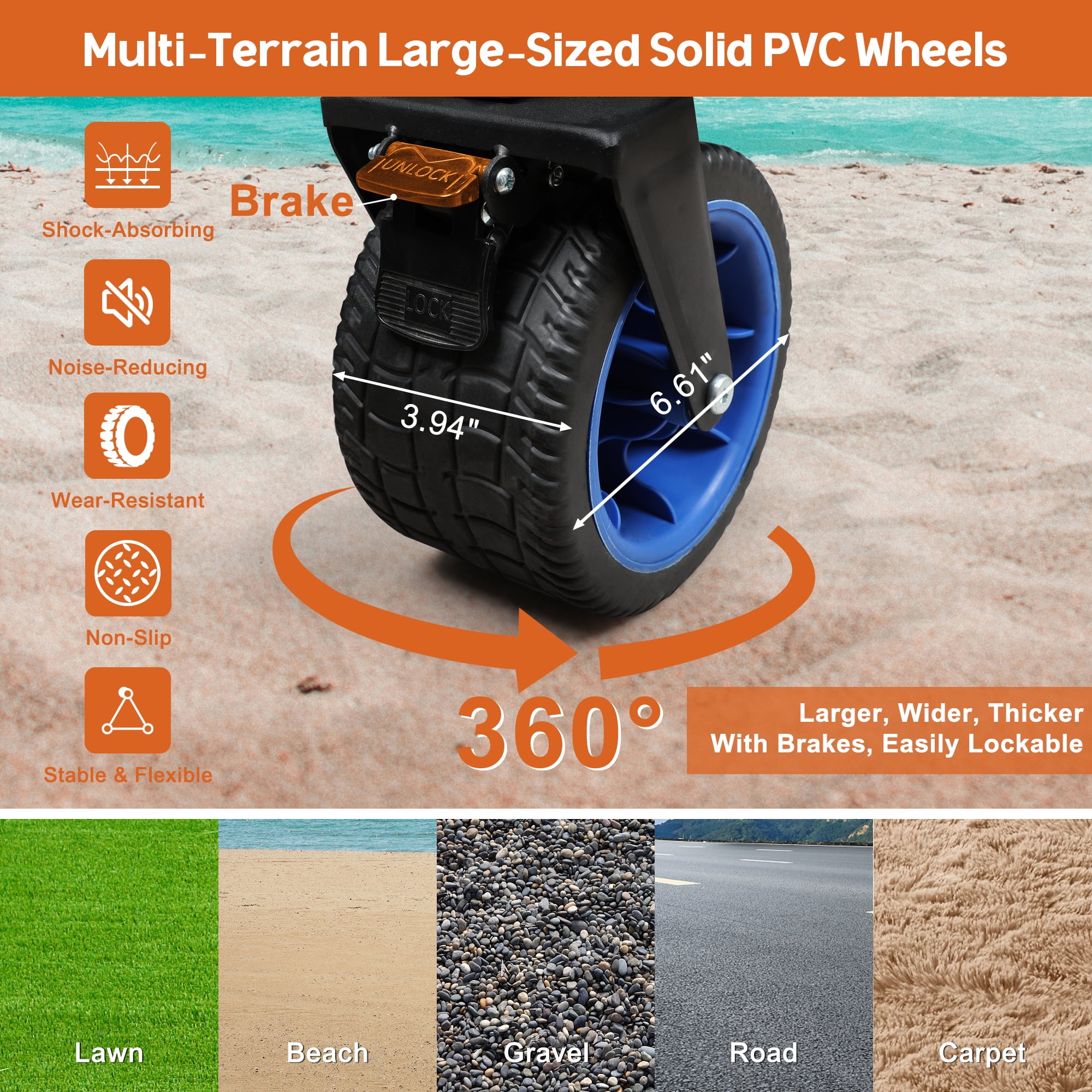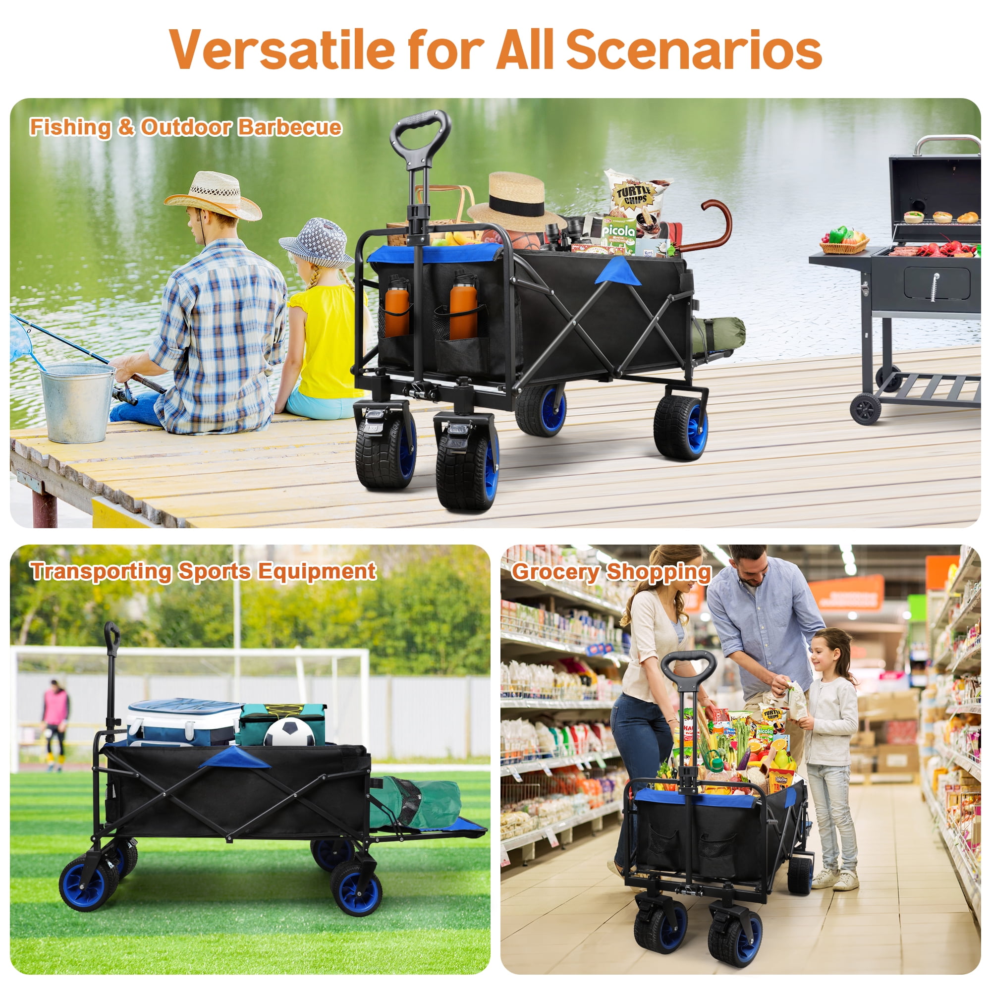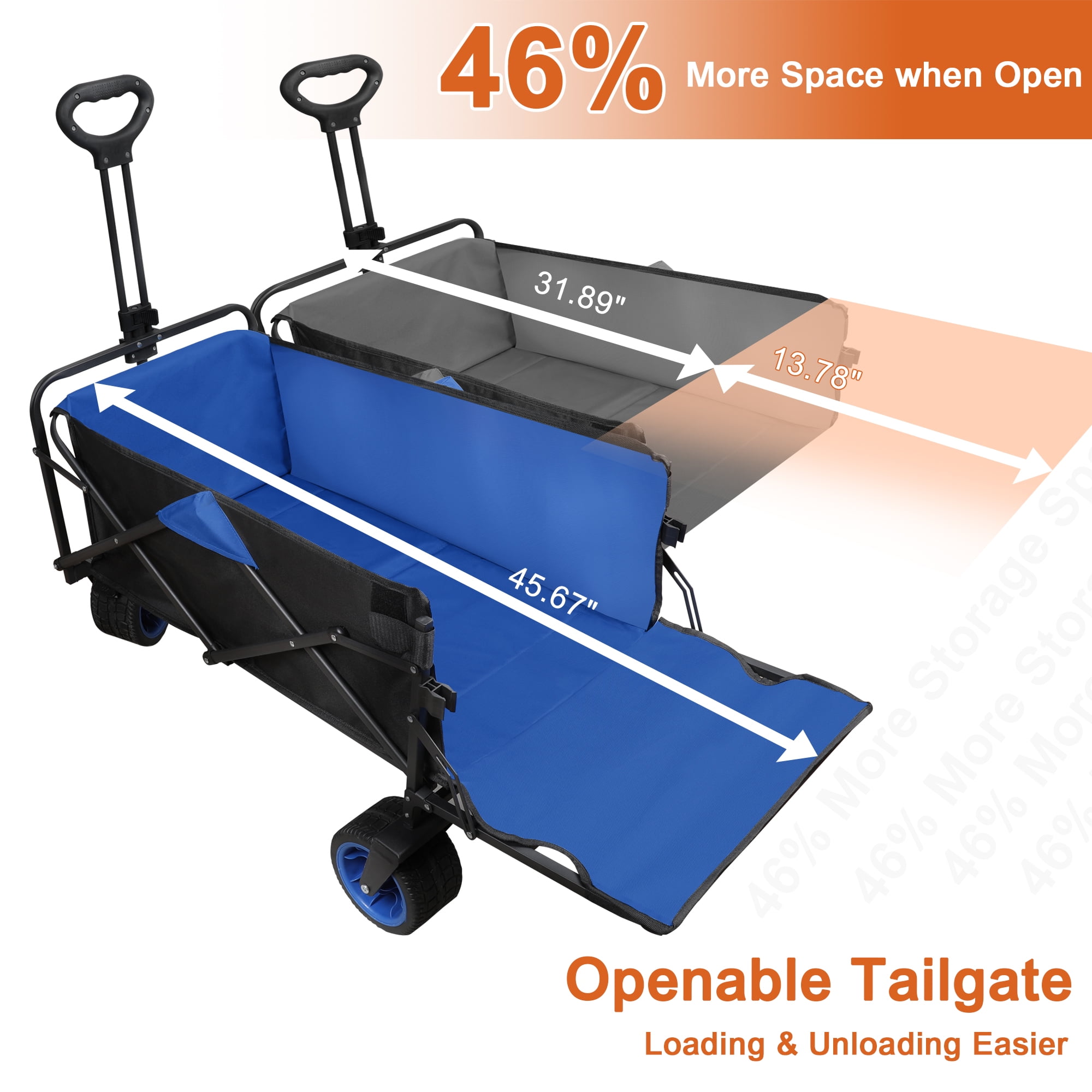 ✅ 【Durable PVC Wheels: Smooth Ride, Secure Steering】Bigger wheels for smoother rides on any surface. Tough PVC material for durability and slip-resistance. Front wheels rotate 360 degrees for easy steering, with a lock option for stability on slopes. ✅ 【Convenient Openable Tailgate】Unlock the tailgate for more storage space. Makes loading and unloading heavy items a breeze. ✅ 【Robust Wagon Holds 400 Pounds】Firstness wagon boasts a strong rust-resistant metal frame and tear-resistant double-layered Oxford fabric. With a 400lbs capacity, it carries lots at once, saving you from multiple trips. ✅ 【Easy to Fold and Store】Fold this wagon in seconds for convenient portability and space-saving storage. Fits perfectly in car trunks, garages, or cabinets. Convenience at its finest! ✅ 【Comfortable Extendable Handle】Enjoy a comfy grip with our ergonomically designed handle, reducing hand fatigue. Effortlessly push or pull with adjustable length and angle to suit any height. Comfort and convenience combined! ✅ 【No installation required】User-friendly, ready to use out of the box. Package Includes: Outer Box×1, Fully Equipped Wagon Cart×1, User Manual×1 Capacity: 400L ⭐ Applicable Scenarios 【Outdoor Events】Perfect for camping, picnics, and outdoor barbecues. Easily haul gear, food, and supplies without the hassle. 【Shopping】Say goodbye to heavy grocery bags! Conveniently transport groceries from the store to your car or home. 【Moving】Make moving a breeze! Transport furniture, appliances, and boxes with ease during relocation. 【Gardening】Ideal for gardening enthusiasts. Easily move soil, pots, and tools around your yard or garden. 【Commercial Use】Boost efficiency in delivery services, janitorial tasks, and warehouse operations. 【Travel】Streamline travel experiences at airports, train stations, or hotels by effortlessly carrying luggage. 【Everyday Home Use】Simplify daily tasks like hauling laundry, recycling, or storing seasonal items.