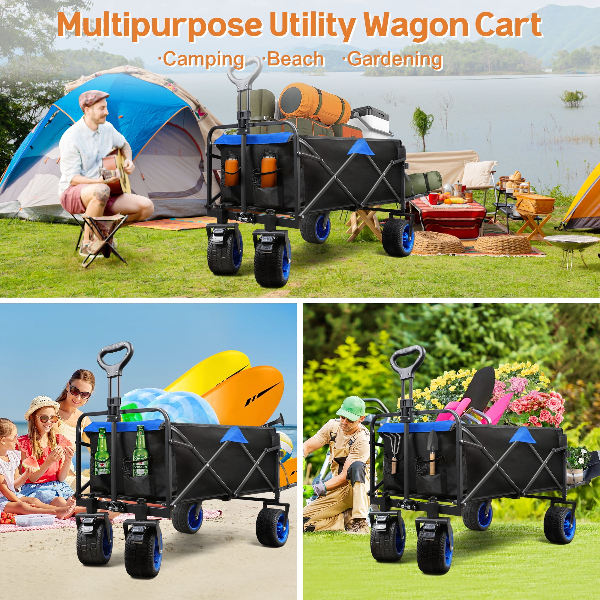 Tripland Heavy Duty Folding Wagon Cart, Multipurpose Collapsible Utility Wagon with Openable Tailgate for Beach Camping Picnic Garden Grocery Shopping Laundry (Black & Blue)