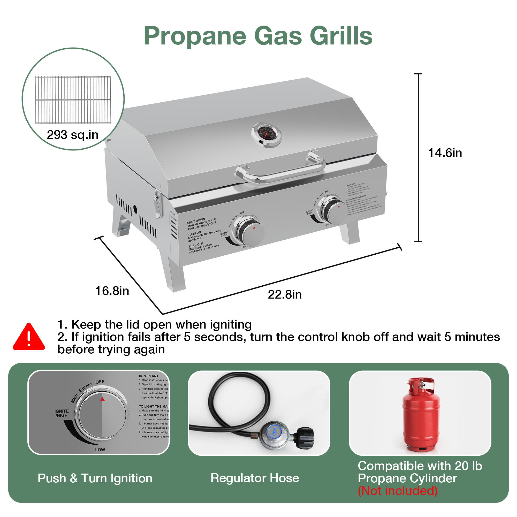 Firstness Propane Gas Grills, 30,000BTU Portable Gas Grill for Outdoor Camping BBQ Picnics Tailgating, 2 Burners, Stainless Steel Sliver