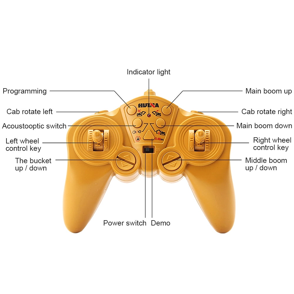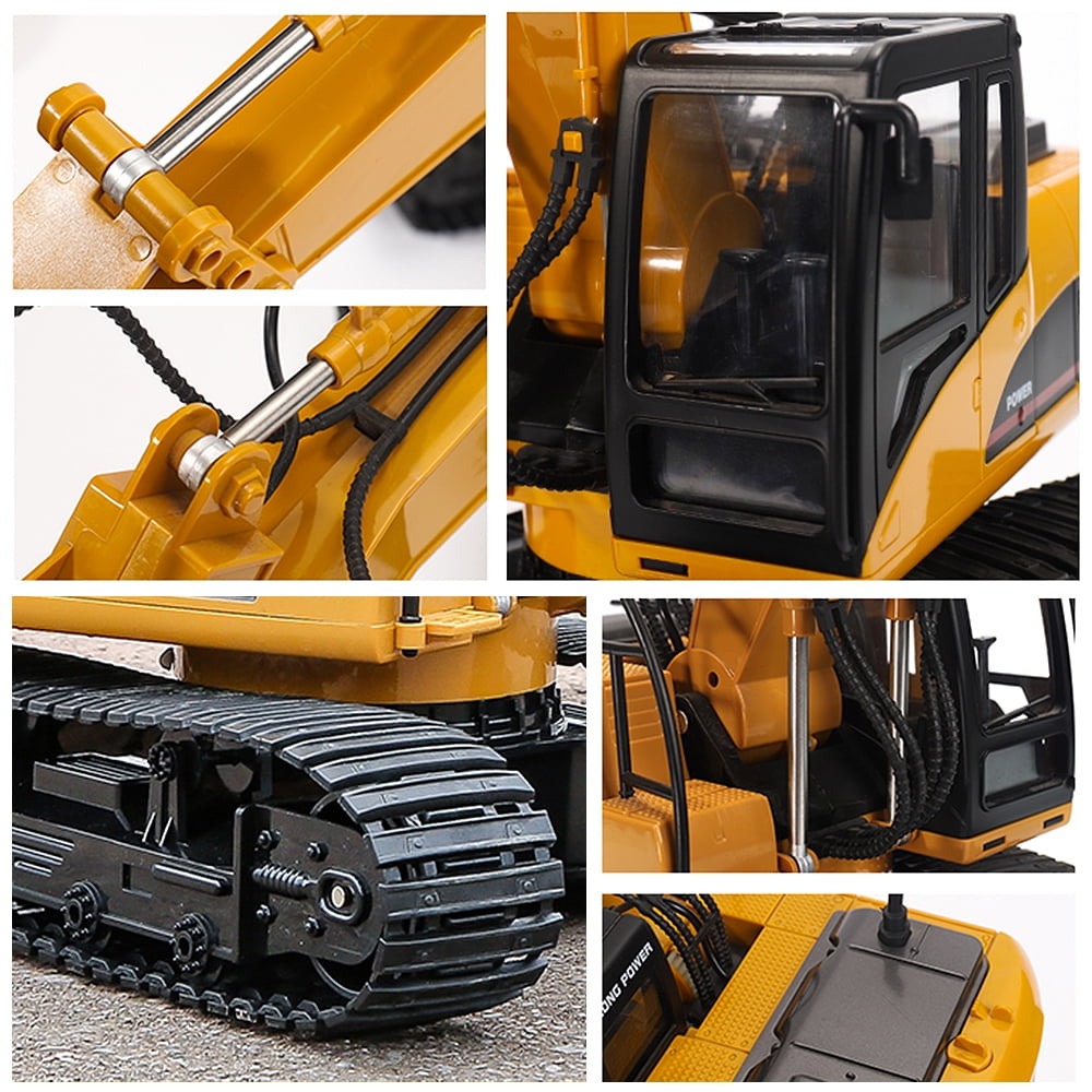 Fisca 1/14 Remote Control Excavator Digging Toys: High detailed yellow appearance like cab and window 15 channel full function: go forward or backward, turn right or left, digging, automatic demo, lights and sound 680° rotate platform 110° swing up and down bucket 100° swing up and down boom 70° bend stick (arm) Powerful enough motor to lift itself by bucket Thickened tracks durable enough for conquering different terrains 2.4Ghz anti-interference remote control for multiple trucks playing at the same time Kids wonderful construction toy trucks 7.2V/400mAh rechargeable battery Control range: 10-100m Product size: 17″ x 6.7″ x 11.4″ Item weight: 3.1 pounds Material: plastic, rubber, electronics Playing time: 15-20 minutes 2 AA batteries required for remote not included For kids ages 8 years and up