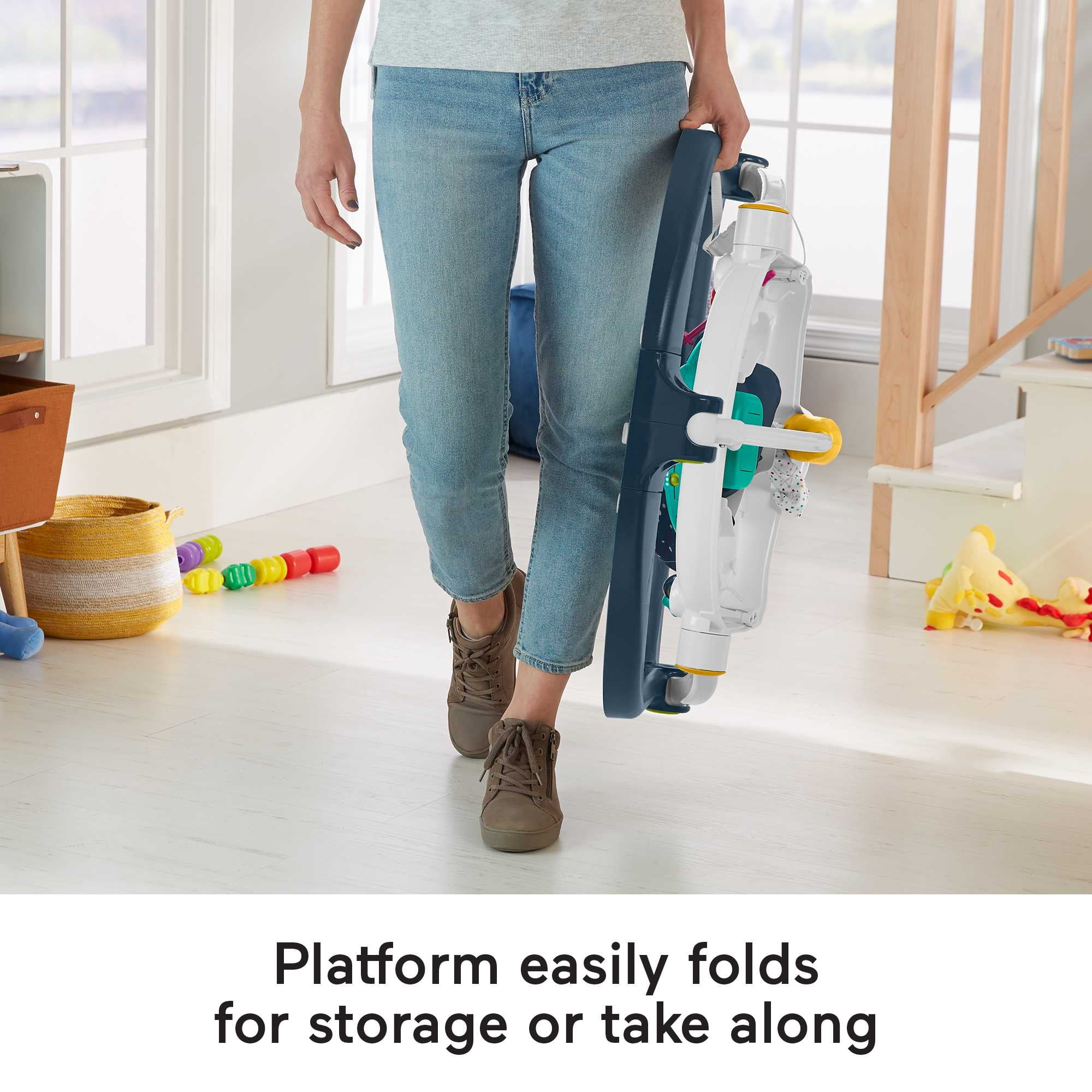 Infant activity center with music, sounds, lights, and toys, including teether, clicker, and light-up ‘command center’ Sturdy, free-standing frame lets baby jump safely no doorway required Playtime grows along with your astronaut: Conveniently adjusts to four different heights as your baby grows Space-saving frame: Easily folds for storage and travel Soft seat pad is removable and machine washable