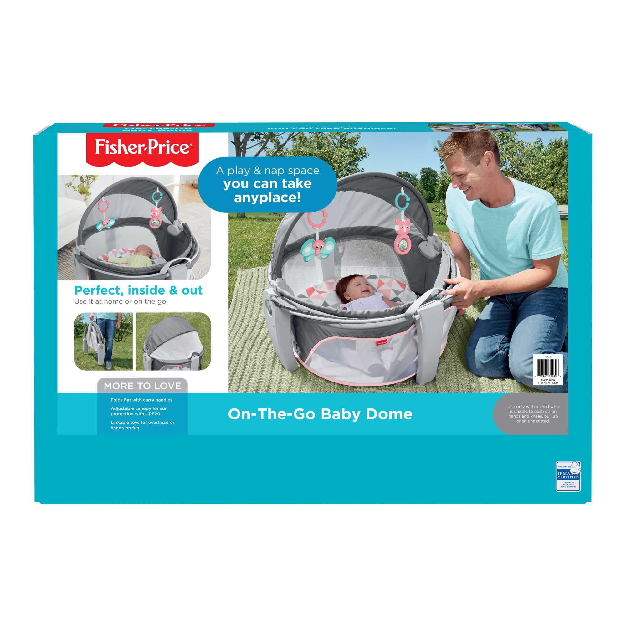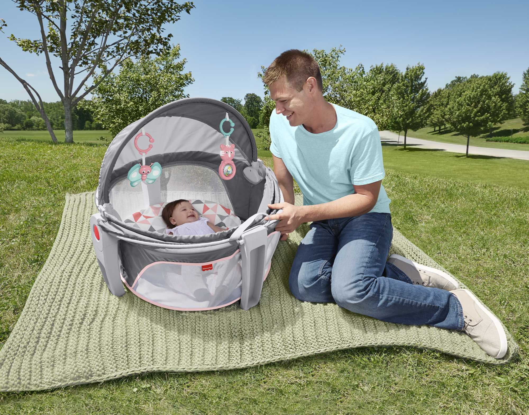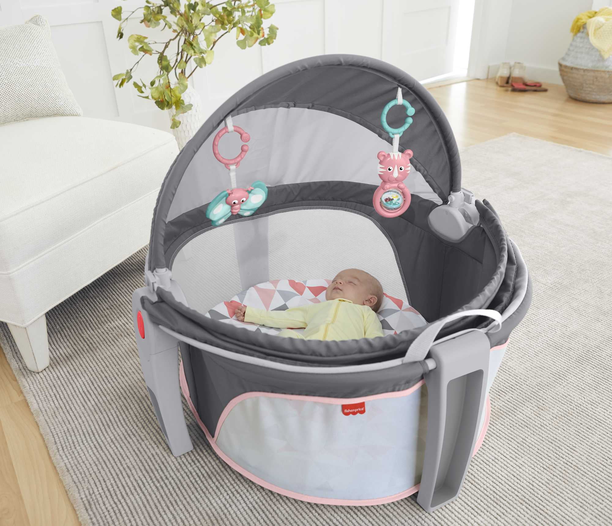 Fisher-Price Bassinet On-The-Go Infant Dome Portable Bassinet and Play Space with Toys, Rosy Windmill, Unisex