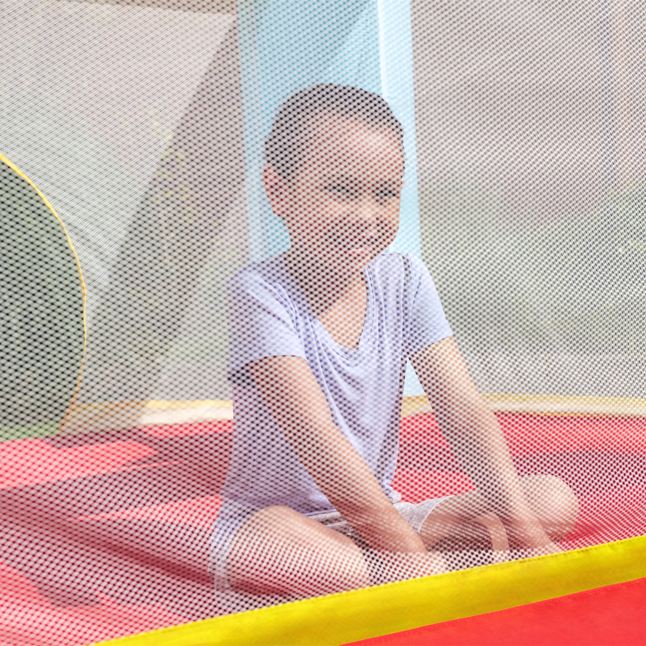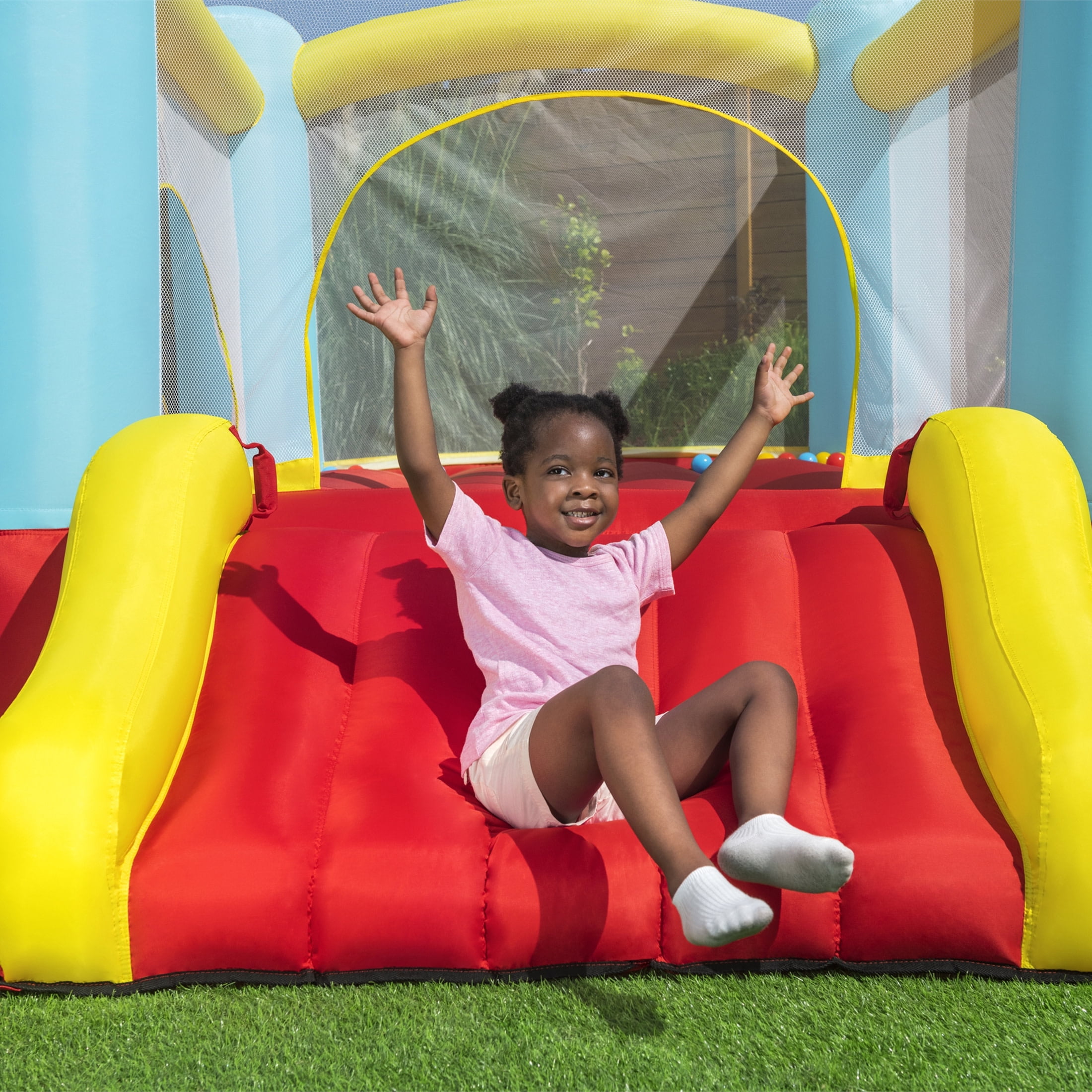 Size: 12 ft. x 10 ft. 6 in. x 6 ft. (3.66 m x 3.2 m x 1.83 m) User Capacity: 3 Weight capacity: 250 lbs (113 kg) Perfect for ages: 3+ 110-120V~ blower inflates in less than 2 minutes Extra-wide slide for quick, fun in-and-out access Ball pit with 50 play balls included Mesh safety walls for parent visibility Designed for outdoor and indoor use Contents: 1 bouncer, 1 blower (stakes included), 1 repair kit (multiple assorted patches), 1 storage bag, 11 bouncer stakes, 50 play balls