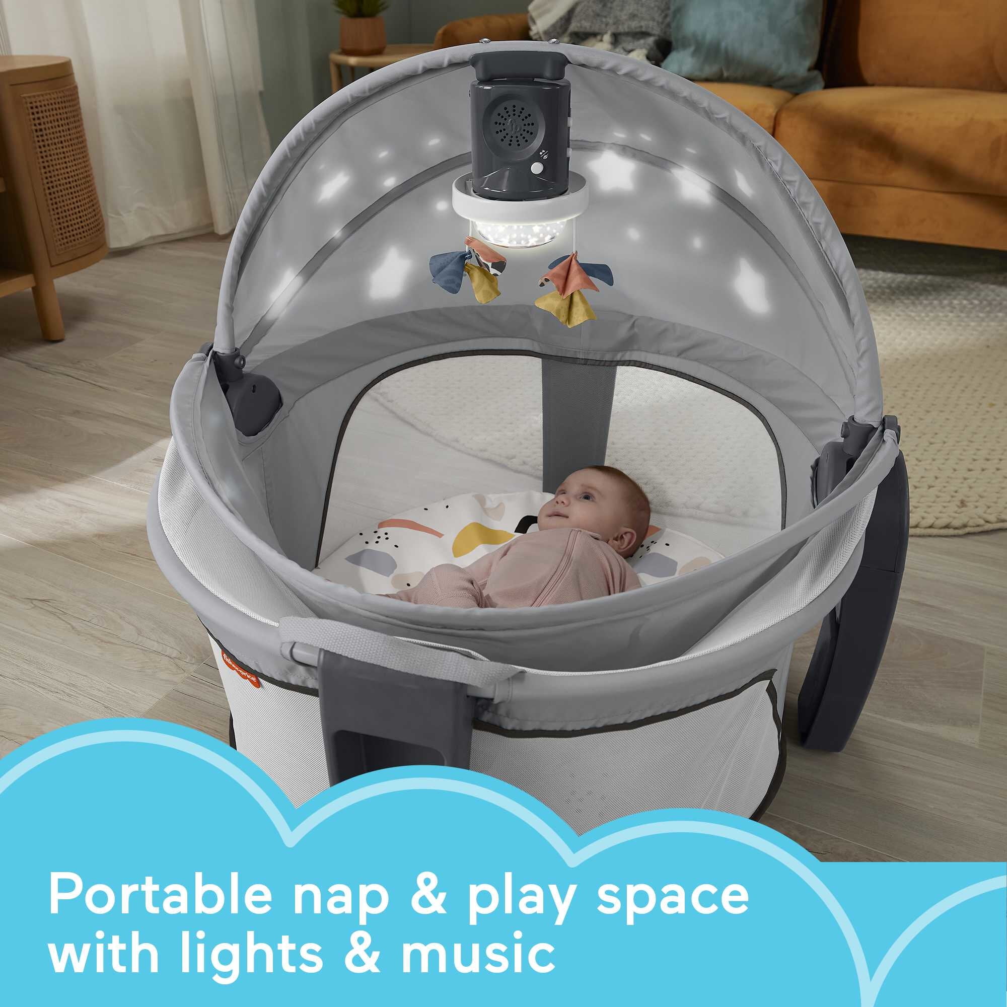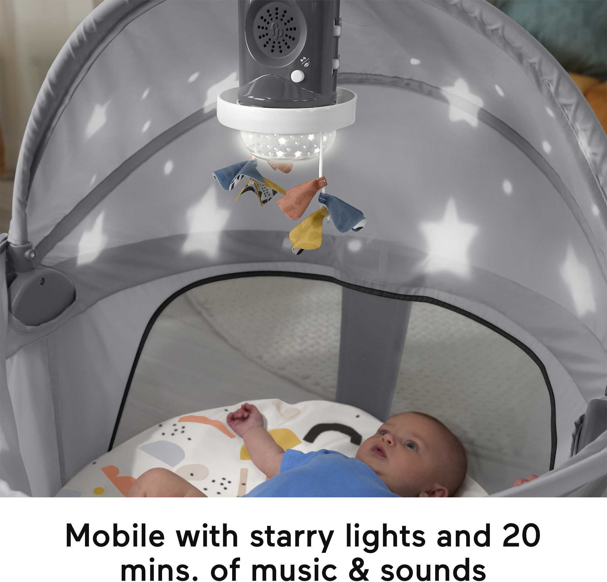Portable nap and play space with lights, music and sounds that can be used indoors or outdoors, at home or while traveling Soothe them to sleep: The motorized mobile plays up to 20 minutes of music and sounds plus enchanting starlight projection Explore the great outdoors: The overhead canopy features UPF20 sun protection and helps keep out bugs, while breezy mesh sides give you a clear view of your baby Easy to stow & go: The lightweight frame folds flat with convenient carry handles Helps provide a sense of security while encouraging eye-tracking for newborns and infants