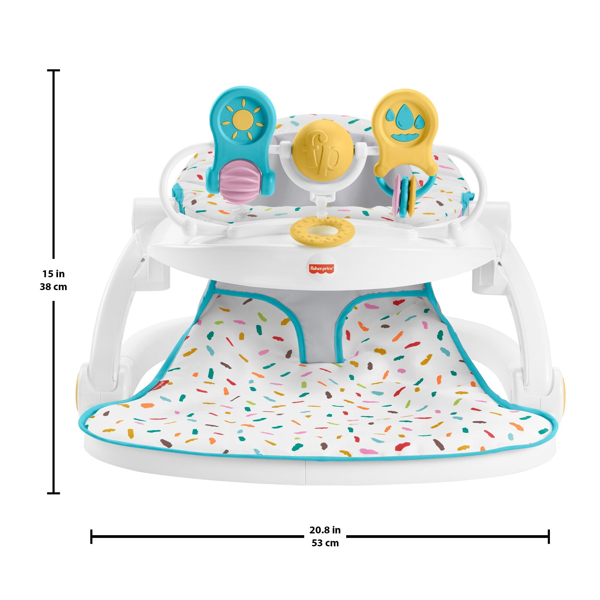 Your baby can enjoy playing and snack time in one comfy spot with the deluxe sit-me-up floor seat from Fisher-Price. The infant seat’s soft fabrics and wide, sturdy base give your baby the extra support they need to sit up and snack on the removable tray. When it’s time to play, place the toy bar insert into the tray for bat-at fun. The seat also folds flat, making it easy to store or take with you as you travel. Use only with a child who can hold their head up unassisted and who is not able to climb out or walk. ?Item arrives in frustration-free, easy-to-open packaging that’s 100% recyclable.Portable infant seat that helps your baby sit up, snack, and play? The removable tray is dishwasher-safe and great for snack time toy bar with a spinner, teether, rollerball, and clackers for playtime? Folds flat for space-saving storage or travel, plus the soft seat pad is removable and machine washable.