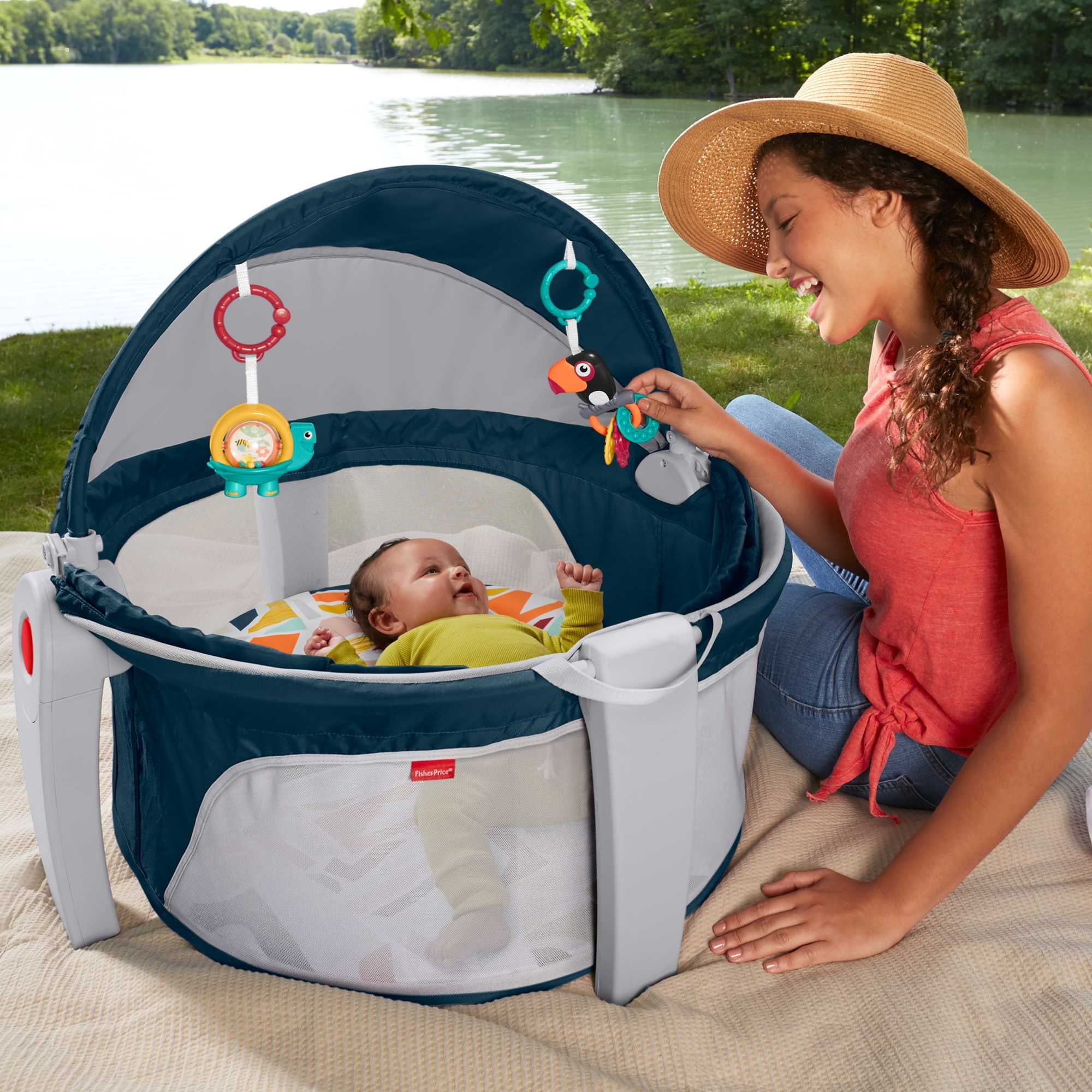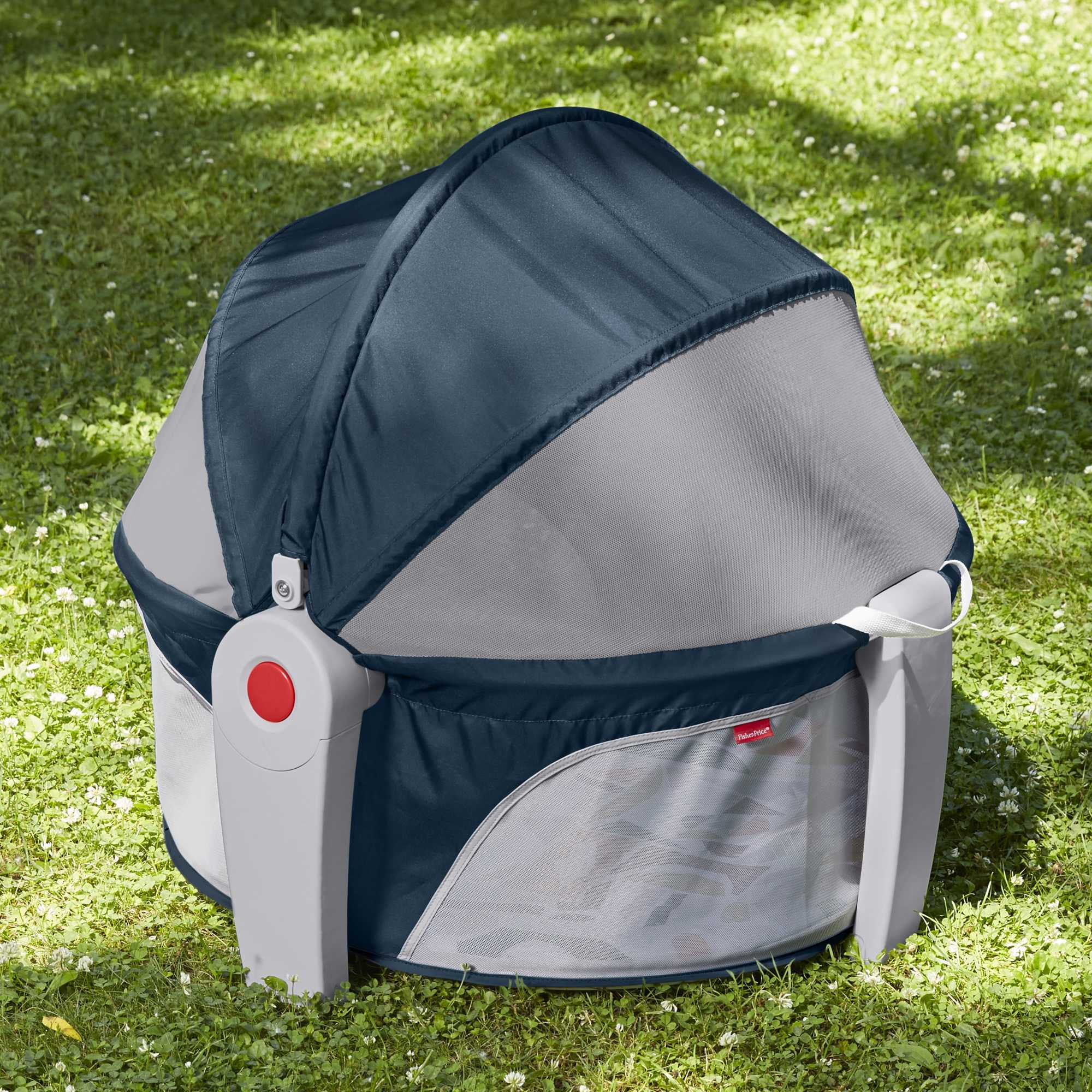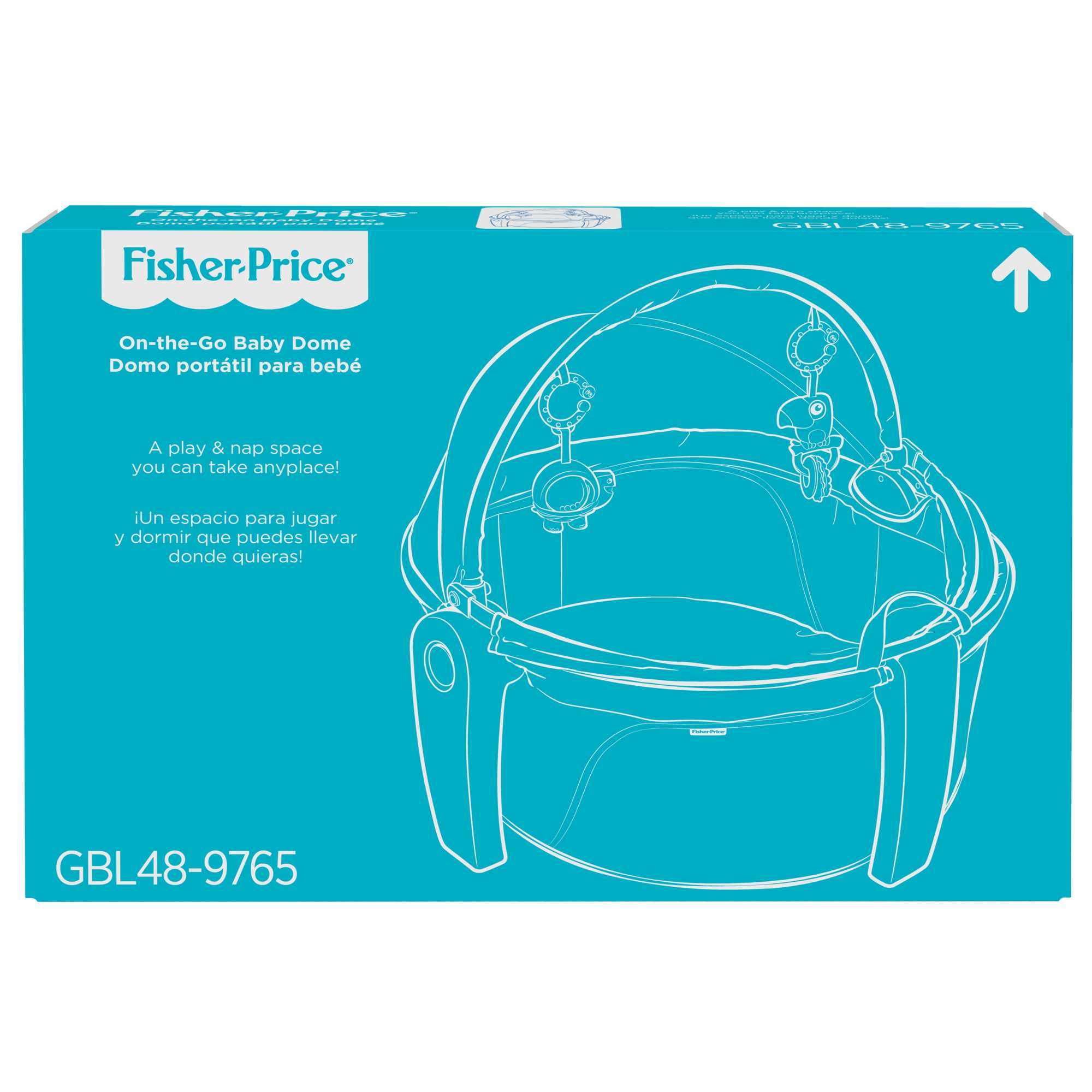 Your baby will feel right at home in the Fisher-Price On-the-Go Baby Dome. It features a comfy pad for your baby to nap or play on and a canopy that protects against pesky bugs and the sun’s bright rays. Two colorful toys dangle overhead, which can be removed and placed within your baby’s reach for play time. And when you’re heading out with your favorite copilot, simply fold the dome and you’re ready for the next adventure! Where development comes into play Security & Happiness: The dome’s soft padding and sun-blocking canopy help your baby feel secure when away from home. Sensory: The linkable toys overhead grab your baby’s attention and encourage eye tracking. Fine Motor Skills: Move the toys within your baby’s reach and watch those little hands grasp and explore all the fun textures, helping to strengthen their dexterity.