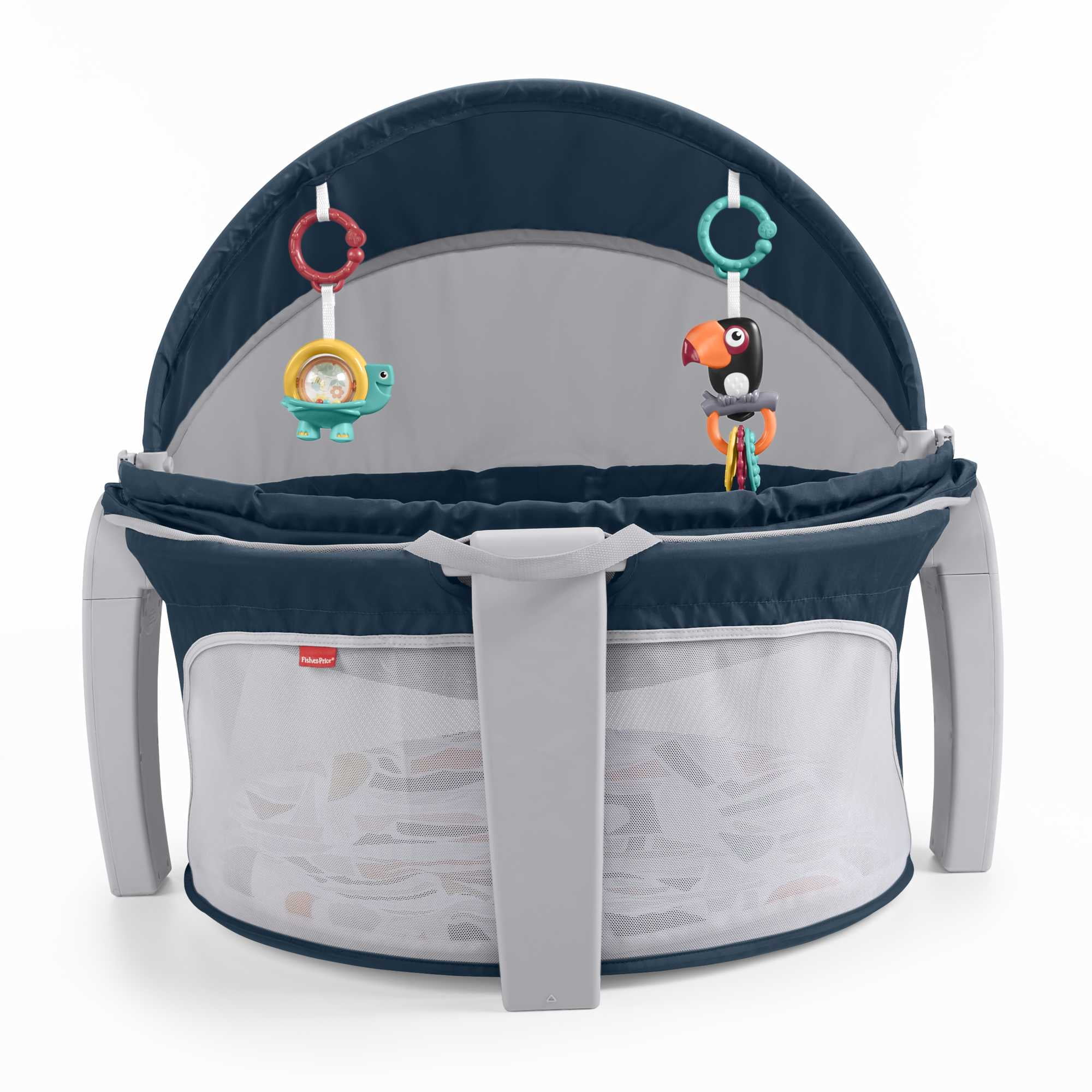 2-in-1 portable infant play space and napping spot, perfect for at home or on the go Can be used indoor or outdoors Canopy protects your baby from the sun’s rays (UPF 20) and bugs 2 removable toys for engaging play Folds flat with convenient handles for easy take-along