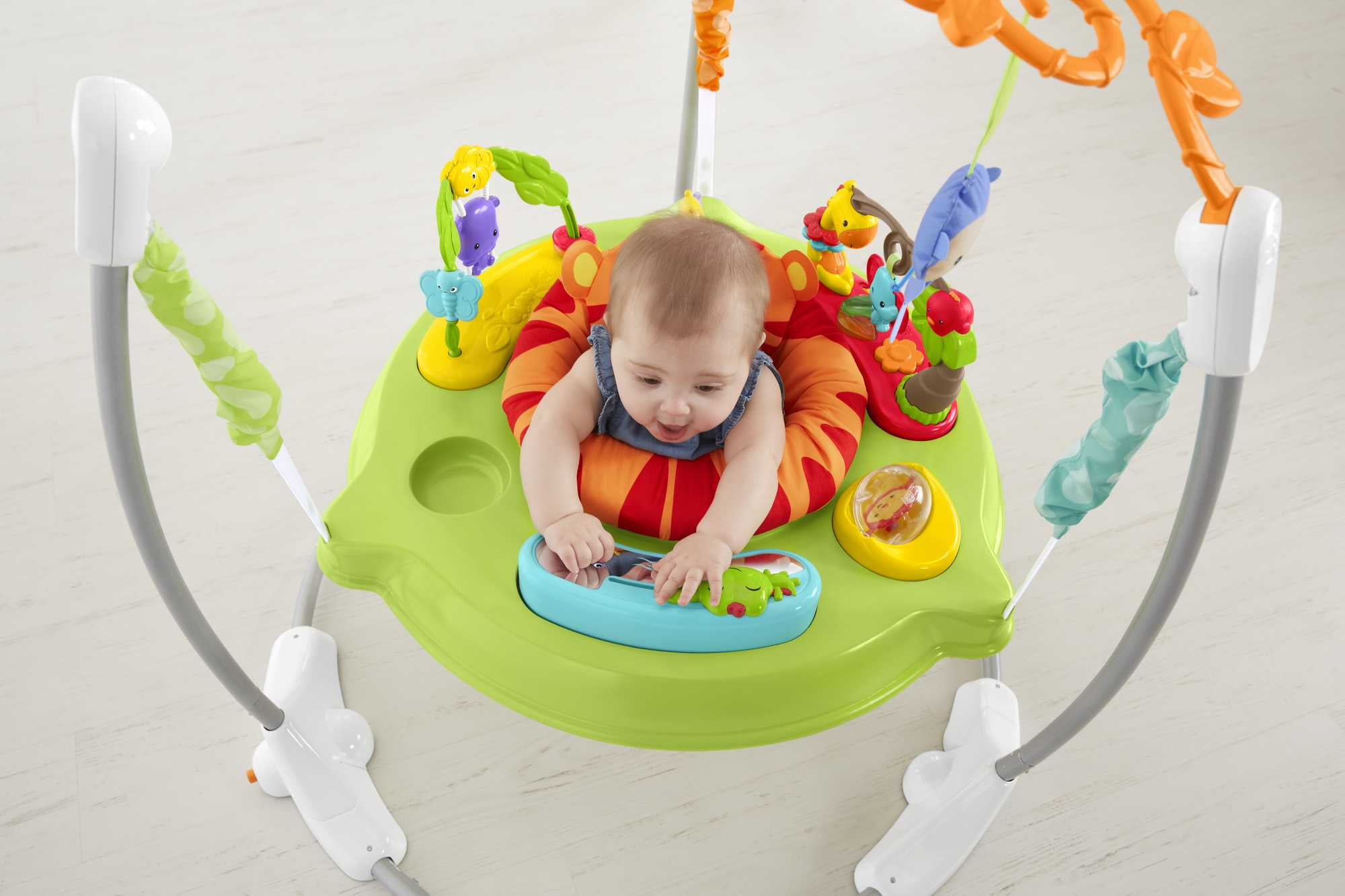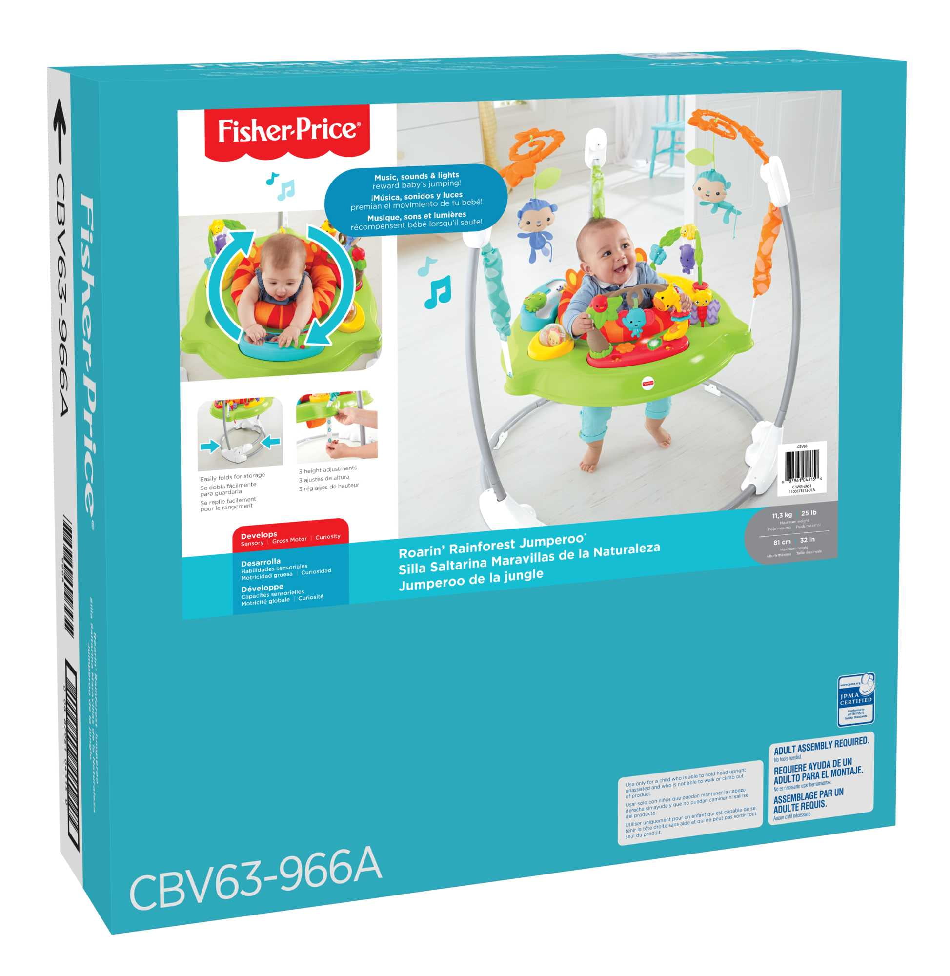 Music, lights & sounds reward and encourage every bounce & jump Wheee! Seat spins 360 degrees so baby can discover busy activities all around Sturdy, free-standing steel frame lets baby jump safely no doorway required Easily adjusts to three different heights as baby grows Easy-fold frame for portability and storage