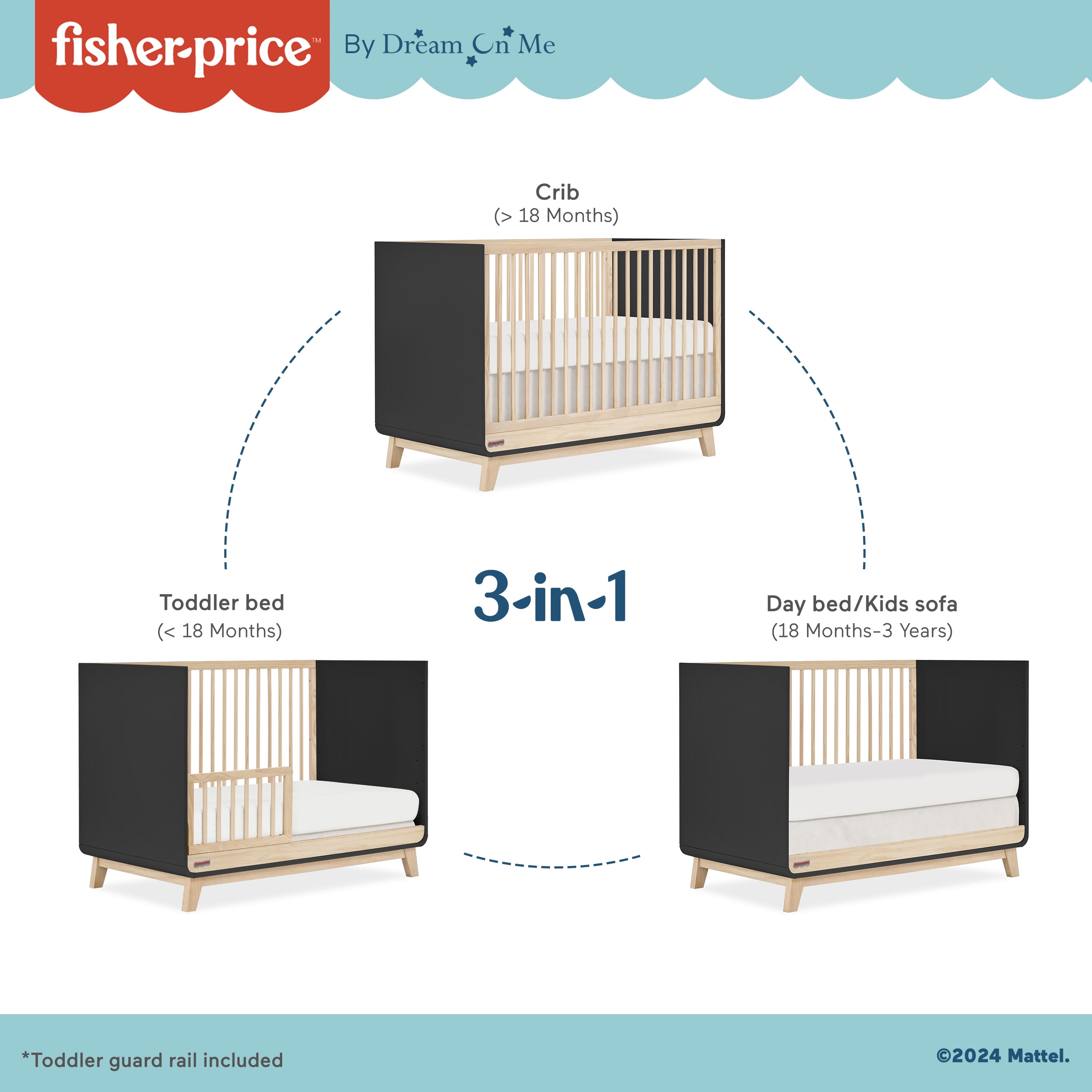 Introducing the Fisher Price Siesta 3-in-1 Convertible Crib by Dream On Me – where fun and Imagination meet sleep time! Designed for versatility, it seamlessly transforms from a crib to a toddler bed and even a full-size bed as your little one grows (Guard rail included). The Fisher- Price Siesta 3-in-1 Convertible Crib ensures your Childs’s safety with JPMA certification and a Commitment to non-toxic materials. Bring playfulness for your little one & convenience for you, As this crib is easy to assemble & super easy to maintain! Available in 3 delightful finishes – Blush Pink Vintage Oak, Weathered Vintage Oak, and Matte Black Vintage Oak, the Fisher-Price Siesta 3-in-1 Convertible Crib is where siestas & adventures begin! Product dimensions are 53.7” L x 30” W x 36” H, with a weight of 78 Lbs.