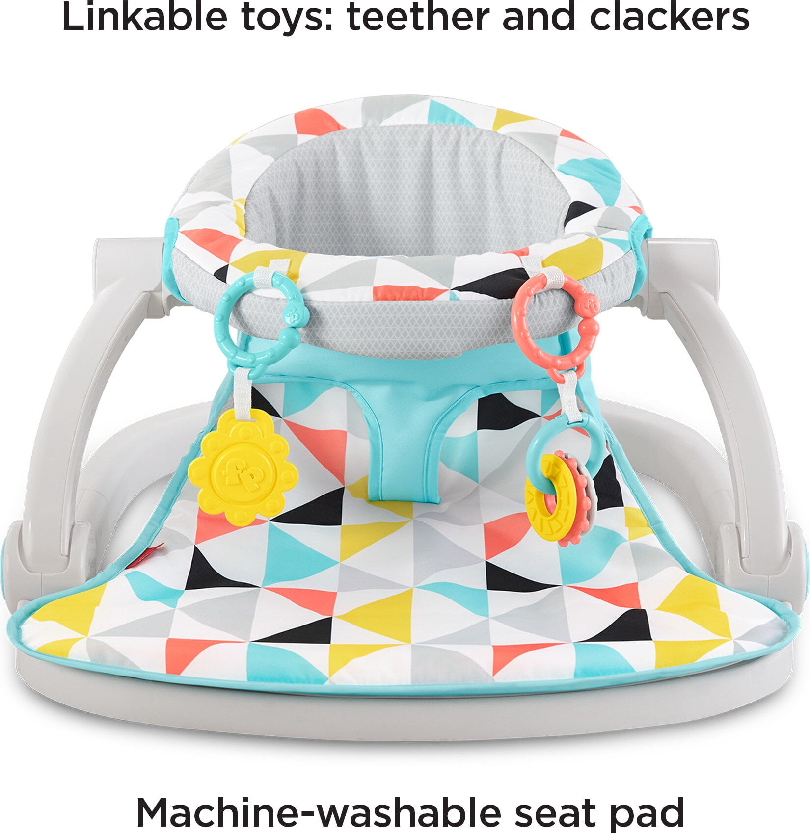 Soft, portable infant seat that provides a comfortable spot for baby to sit up and play! Helps support unsteady sitters in an upright position with a wide, sturdy base 2 linkable sensory activity toys help keep baby entertained – clacker and BPA-free teether Folds flat for space-saving storage or travel seating Seat pad is removable and machine washable