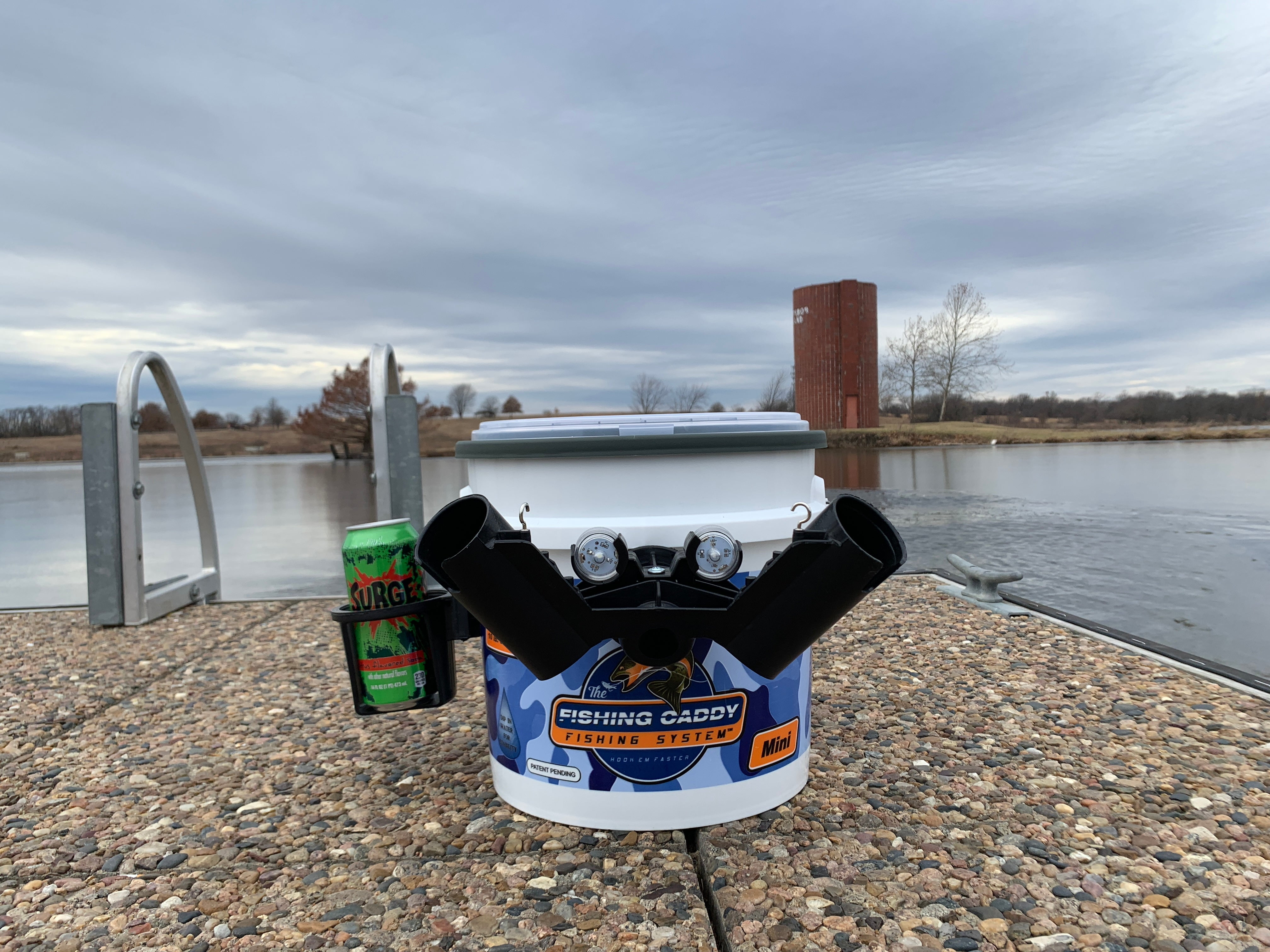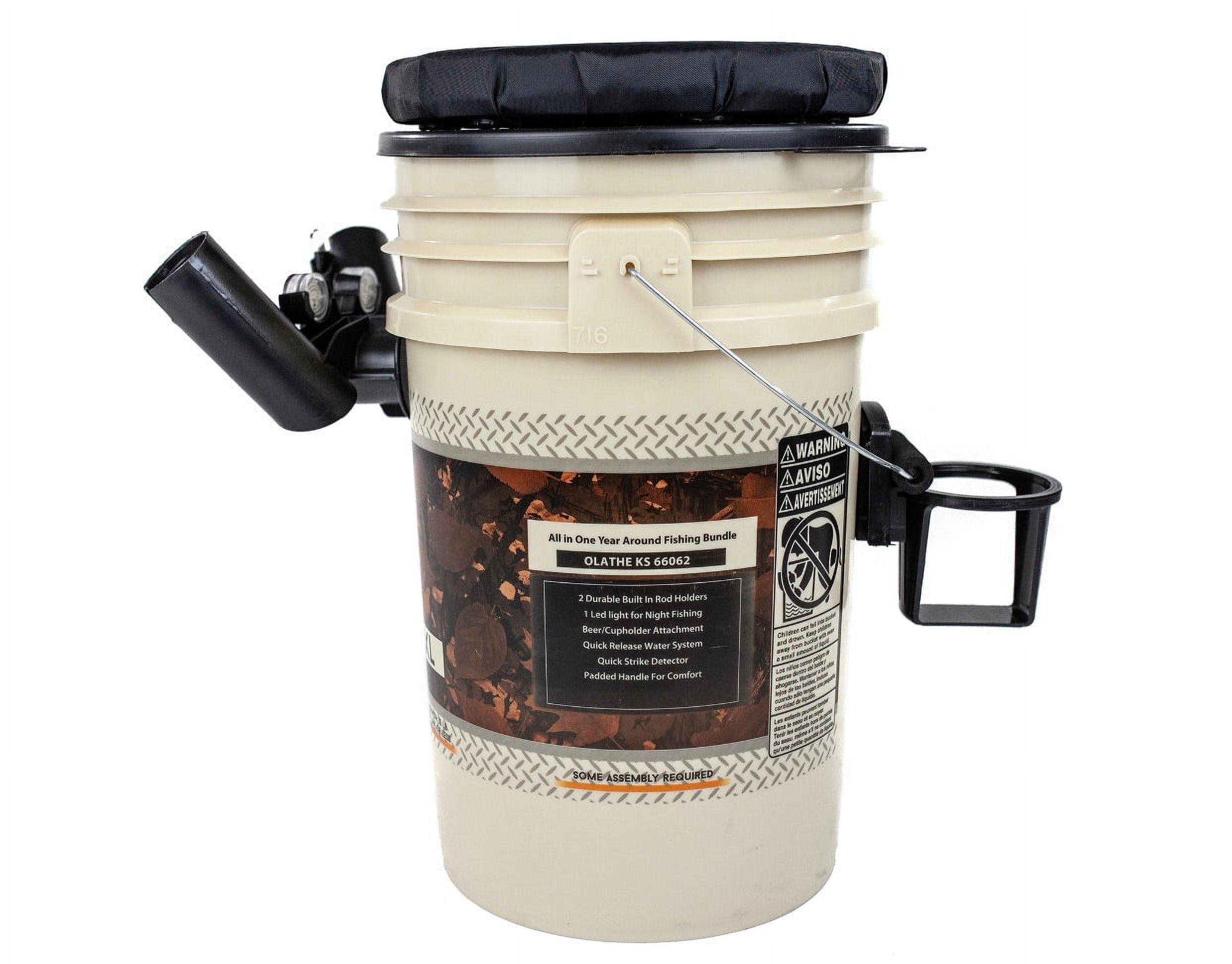 Relax and stay organized on the ice with the Fishing Caddy XL. This combination fishing seat, storage bucket, dual rod holder, beverage holder, and area light adds a level of efficiency to your ice fishing. Made of super-tough, extreme high-density plastic, the Fishing Caddy XL can support up to 400 lbs., and withstands extreme temperatures. Simply fill with water or snow for extra stability, or use the spacious interior for tackle storage or fish transport. Plush padded swivel seat with lid. Comes with a dual rod holder attachment for fishing 2 rods hands-free; a light system with 2 bright LEDs (batteries included); a cup holder attachment; and a quick-release water spigot.