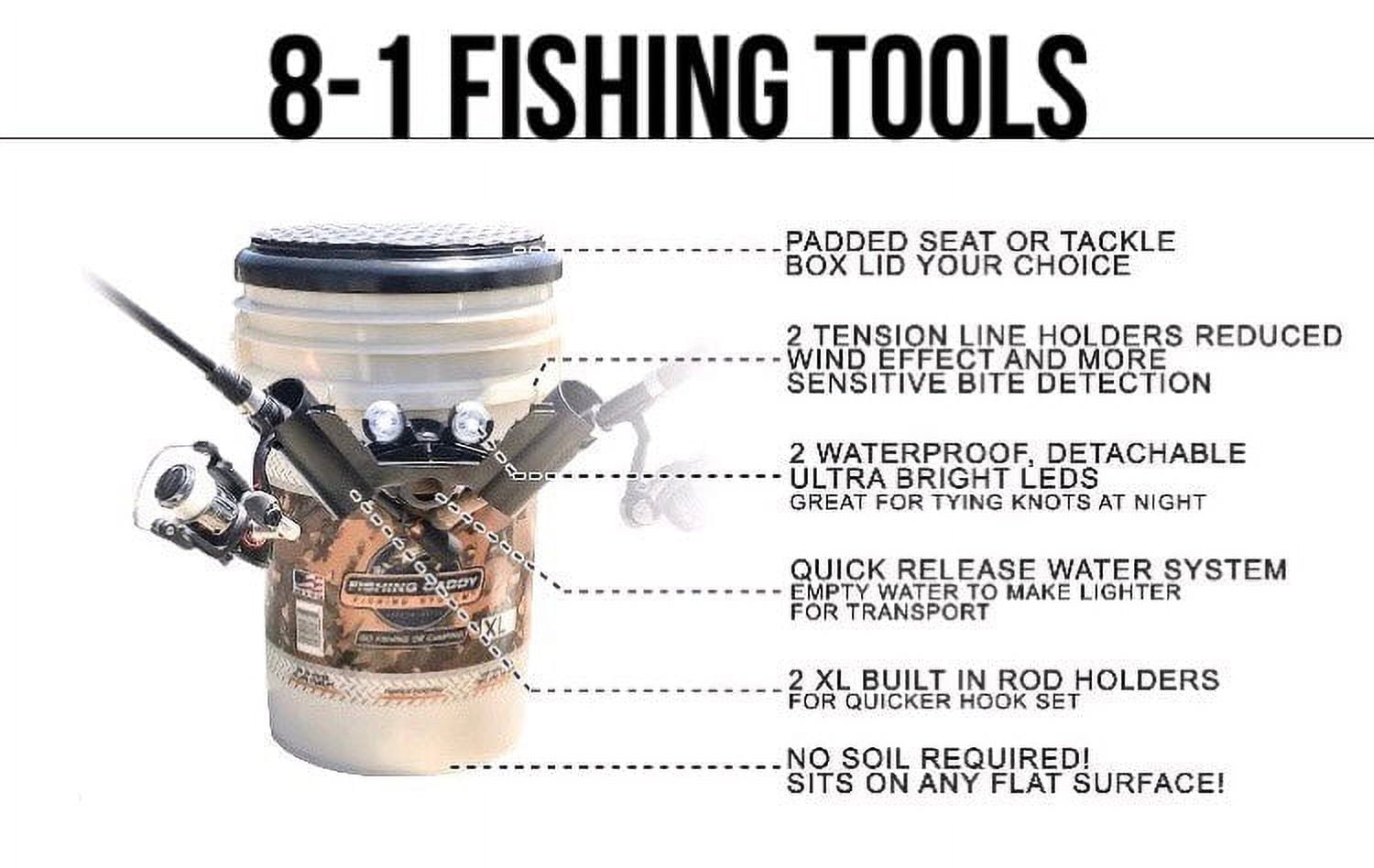 Fishing Caddy Camo Extra Large-Plush Padded Swivel Seat: Making your next fishing trip more organized & relaxing 1 Fishing caddy (Holds up to 30 lbs of water weight for stability) 1 LED light attachment 2 bright LED lights (Batteries included) 1 universal bracket 1 padded handle 1 quick release water spigot 1 thick padded swivel seat 360 degrees (Camo) 1 XL detachable cup holder Light assembly required