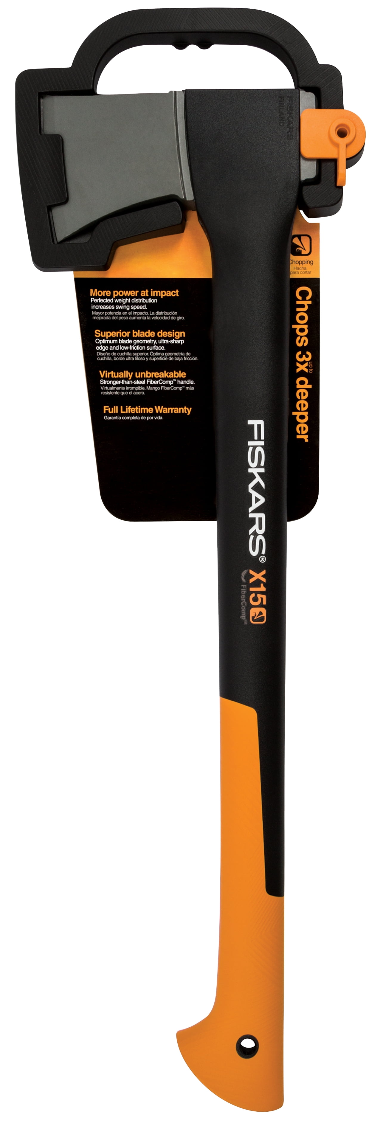 Fiskars X15 Chopping Axe is the ideal axe for felling trees Fiskars X15 Chopping Axe chops deeper with each swing to get more done faster Perfected balance and power-to-weight ratio increases swing speed to multiply power, much like an aluminum baseball bat Shock-absorbing Fiber Comp handle is lightweight yet stronger than steel to prevent overstrike damage Color – Black and Orange Lifetime warranty