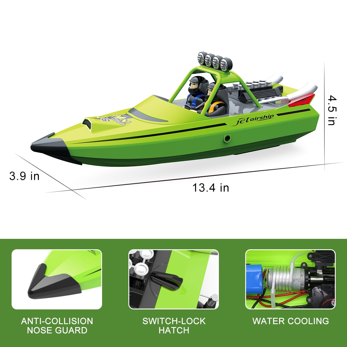 The Racing Speed Boat offers the best racing action for outdoor recreational fun. The Remote Controlled Boat races across the water up to 30 MPH, 2.4GHZ remote control with a 600 Ft signal range. The Non-Capsize Hull System can flip the boat quickly from wave. The turbojet provides the power to sail the sea like a real jet boat.. LED lights allow you identify the position and direction of the boat in the Pools and Lakes at night. Press the autopilot mode button, the hull will automatically move back and forth, bring more fun to children.