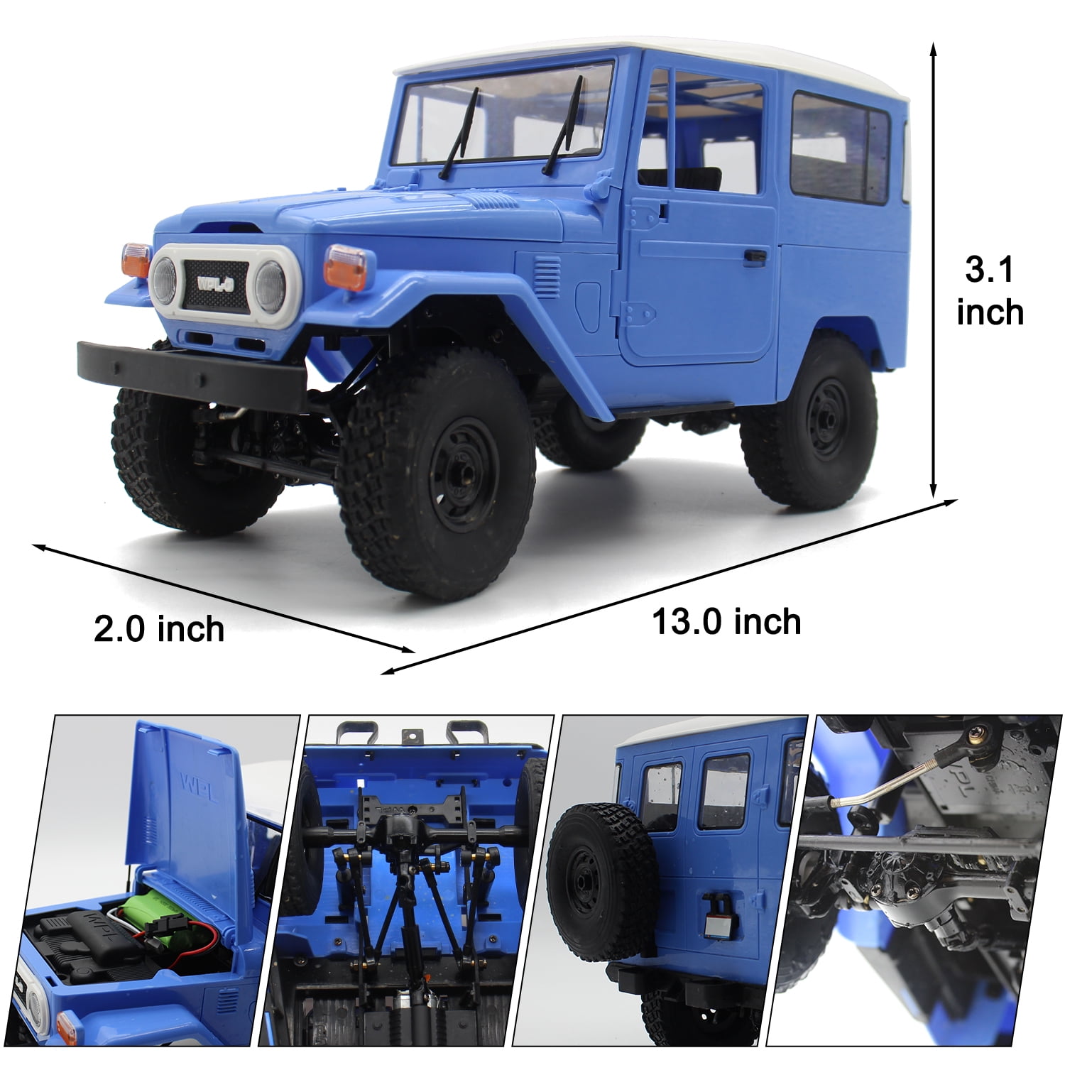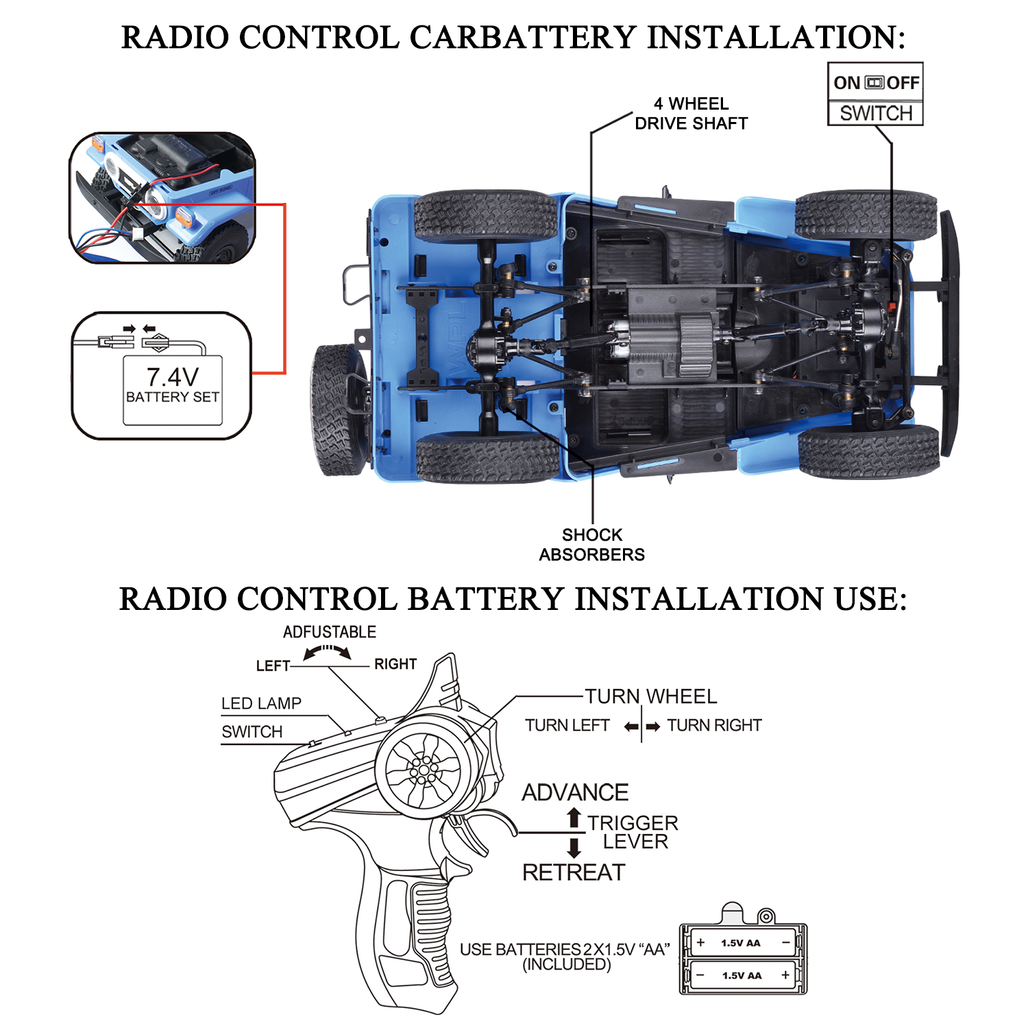 This rc car can transforms between Jeep and Pickup. The hood, doors on both sides and the tailgate can be opened. More movable model details await your discovery and creativity. Four-wheel drive system, excellent off-road performance. The whole vehicle adopts ball bearings, making for a more efficient transmission. With just one press of the acceleration, making it an unbeatable force on the track! The 2.4G Frequency provides a quick-responsive control, allow you to race alongside with other vehicles without any interference. The Remote control car equipped with 7.4V 500mAh high-quality rechargeable battery. You can enjoy the fun of driving for about 30 mins a time which depends on the operation. The professional transmitter of the remote control car brings you a far superior experience.