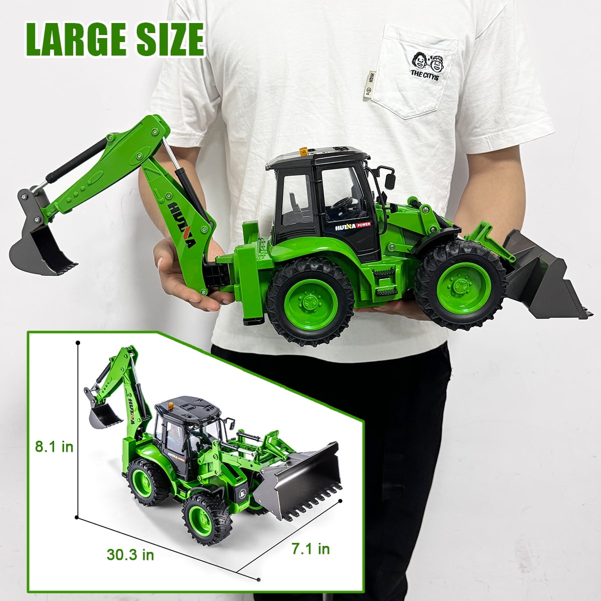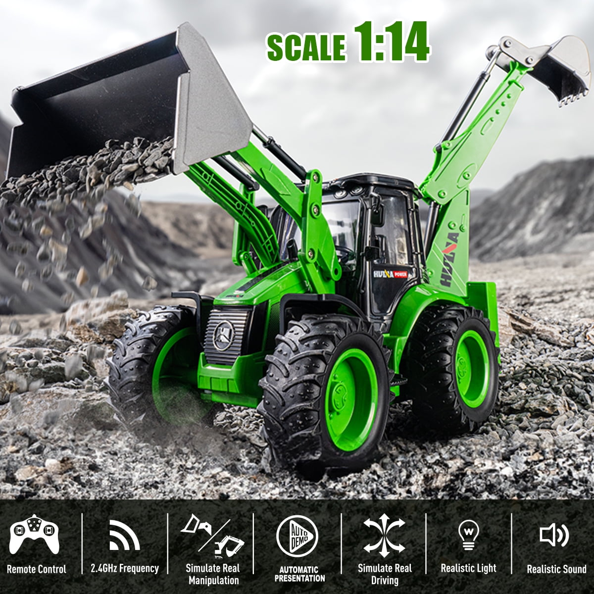 Fistone 1/14 Remote Control Backhoe Loader is designed as a highly detailed imitation of a real construction vehicle for kids ages 8 years and up. As a 2 in 1 rc loader excavator, this rc construction vehicle covers functions of both excavator and loader in digging, loading and unloading materials like loose earth, light snow and sand. Fully Functional Construction Tractor Excavator, Forward, Backward, Left, Right, Arm Up and Down, Shovel up and Down with simulated light and sound work like a real excavator. Please note, the excavator is not controlled remotely. Plus, to provide players with sense of real vehicle, simulated light and sound, even two stretchable outriggers are also equipped. This 2.4GHz rc excavator toys would offer kids fantastic game experiences without electronic signal interferences.