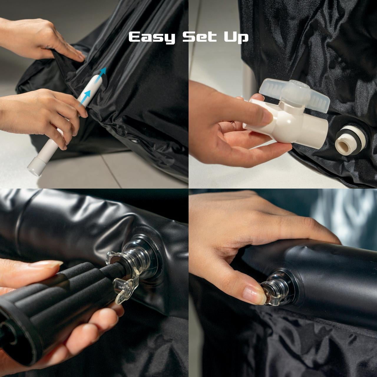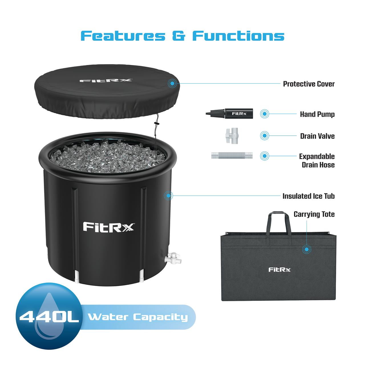 116-gallon (440L) ice bath cold plunge tub with drain hose and carry tote Easy to set up ice plunge with 8-leg support system and a hand pump Built-in drain valve for effortless emptying and easy maintenance Included cover helps maintain water temperature and keeps the tub clean between uses Made from durable nylon and PVC