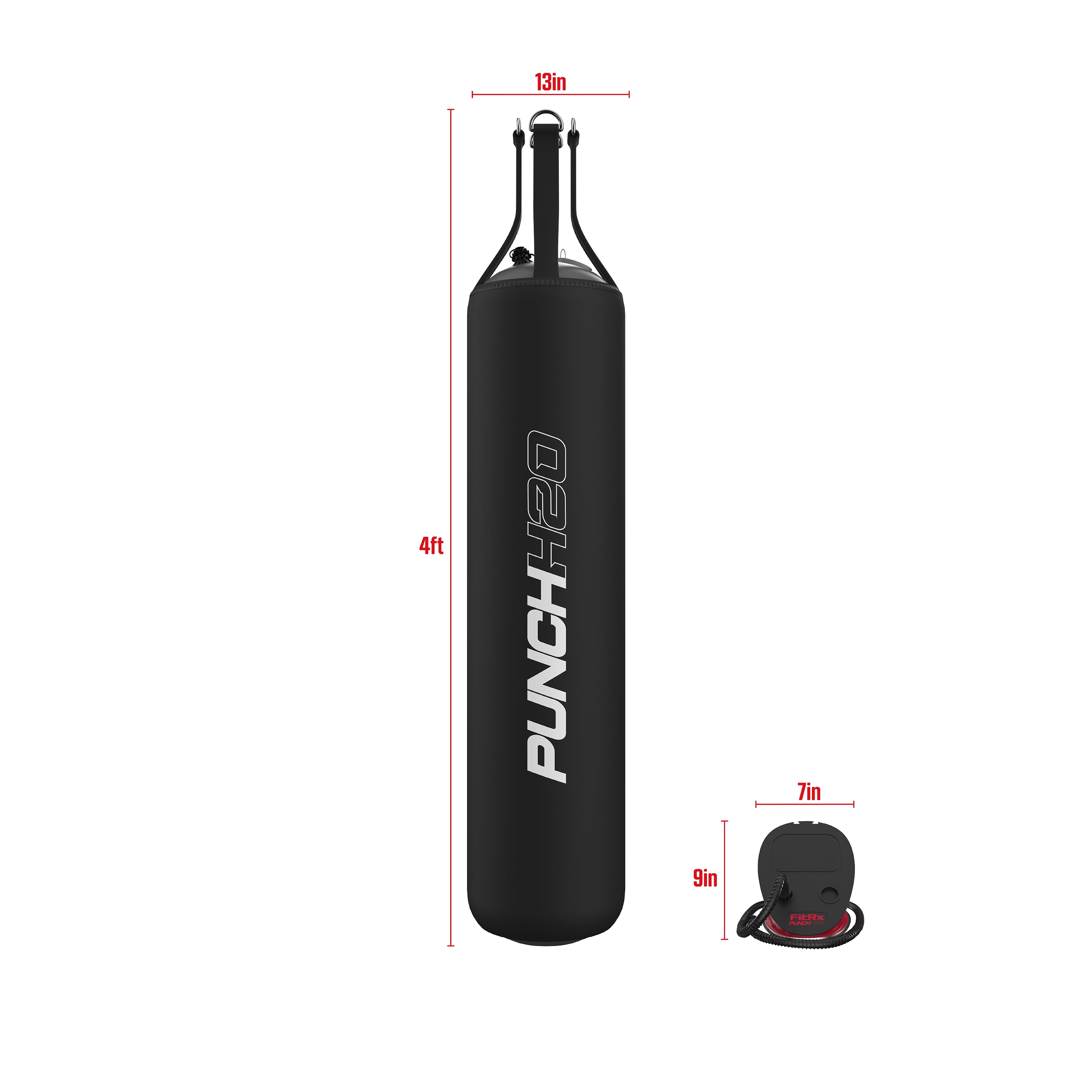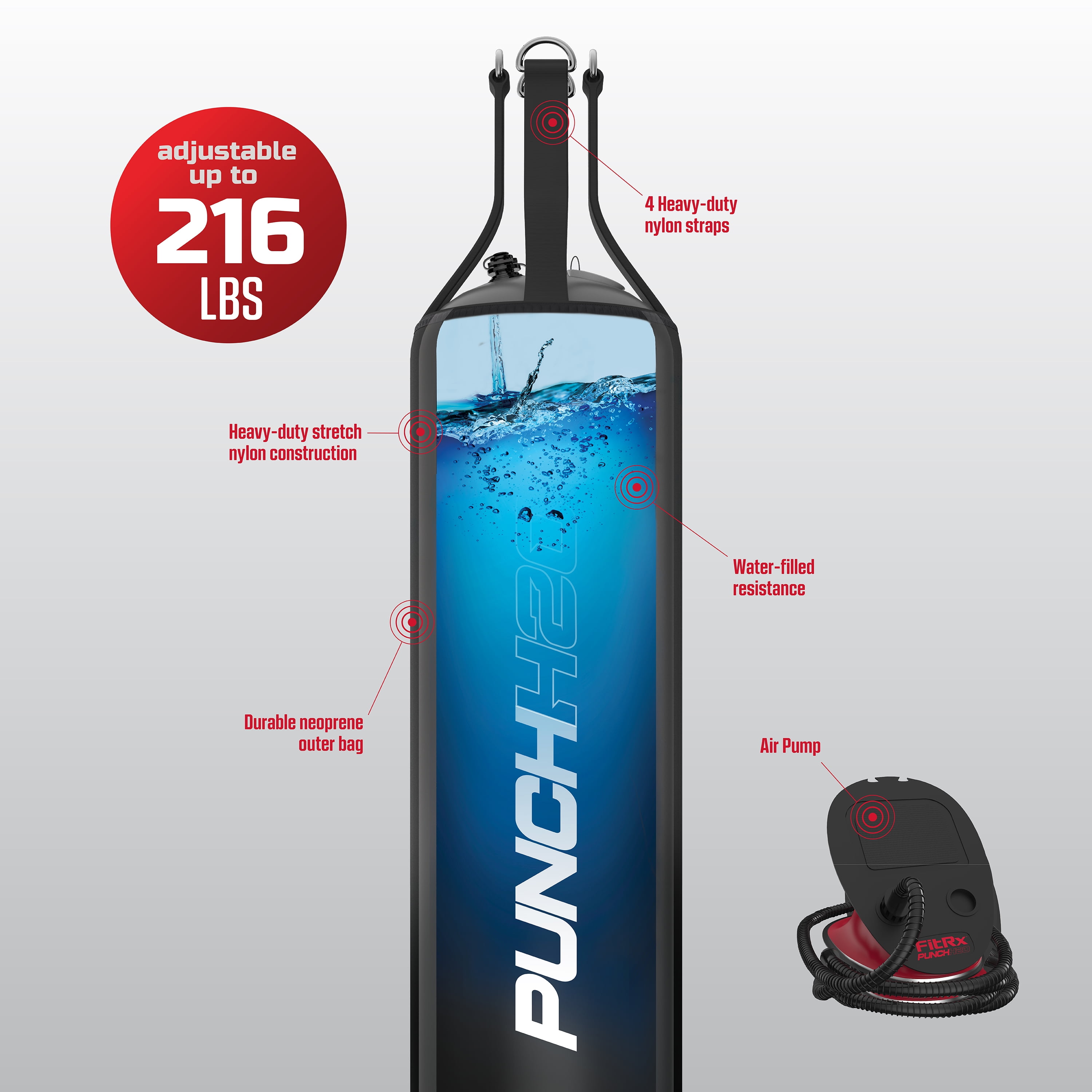216 lbs. water-filled punching bag with a height of 4 ft. With 4 nylon straps and metal D-rings Adjustable water-filled resistance up to 216 pounds Durable stretch nylon construction Comes with a water bladder, neoprene outer bag, air pump, and PVC water pipe