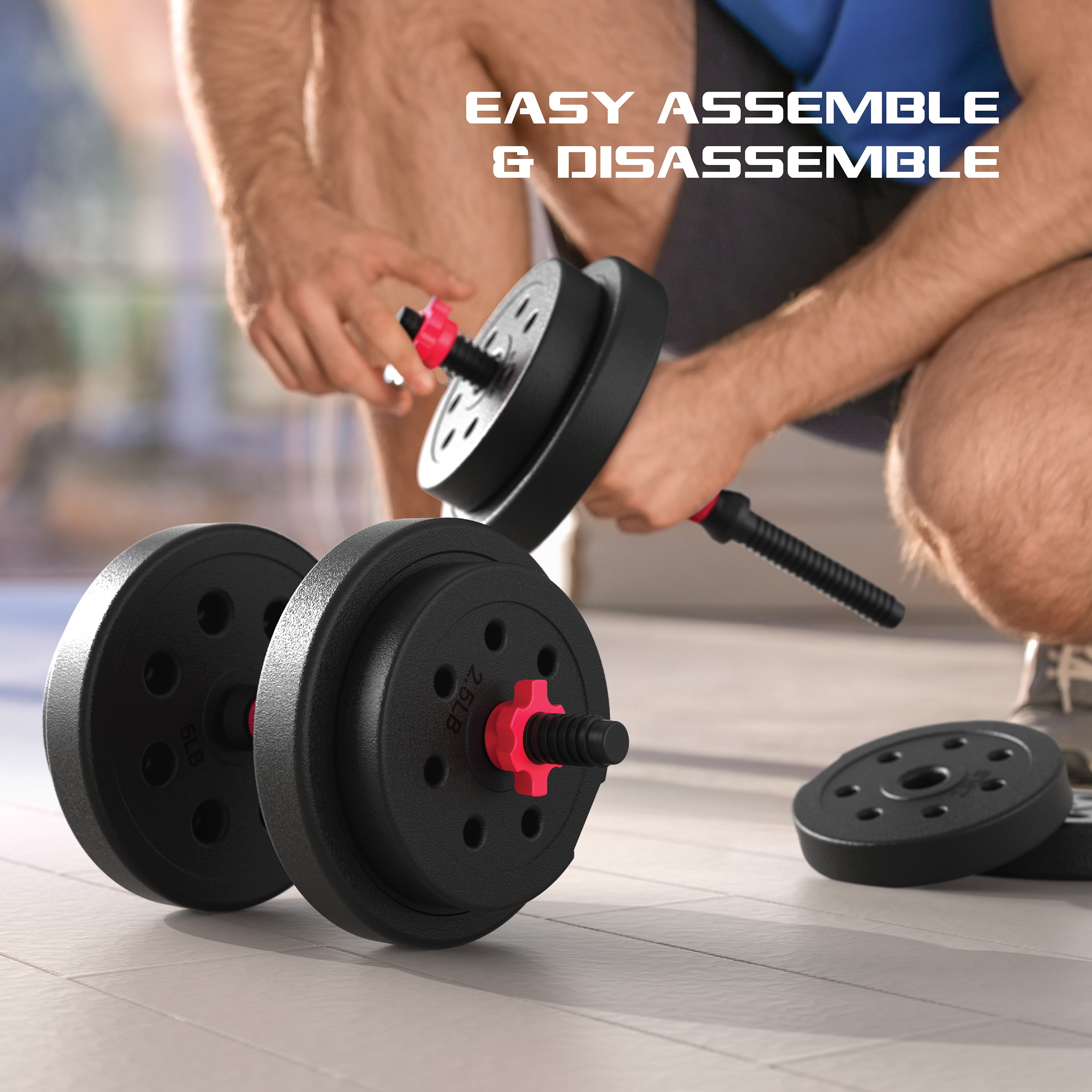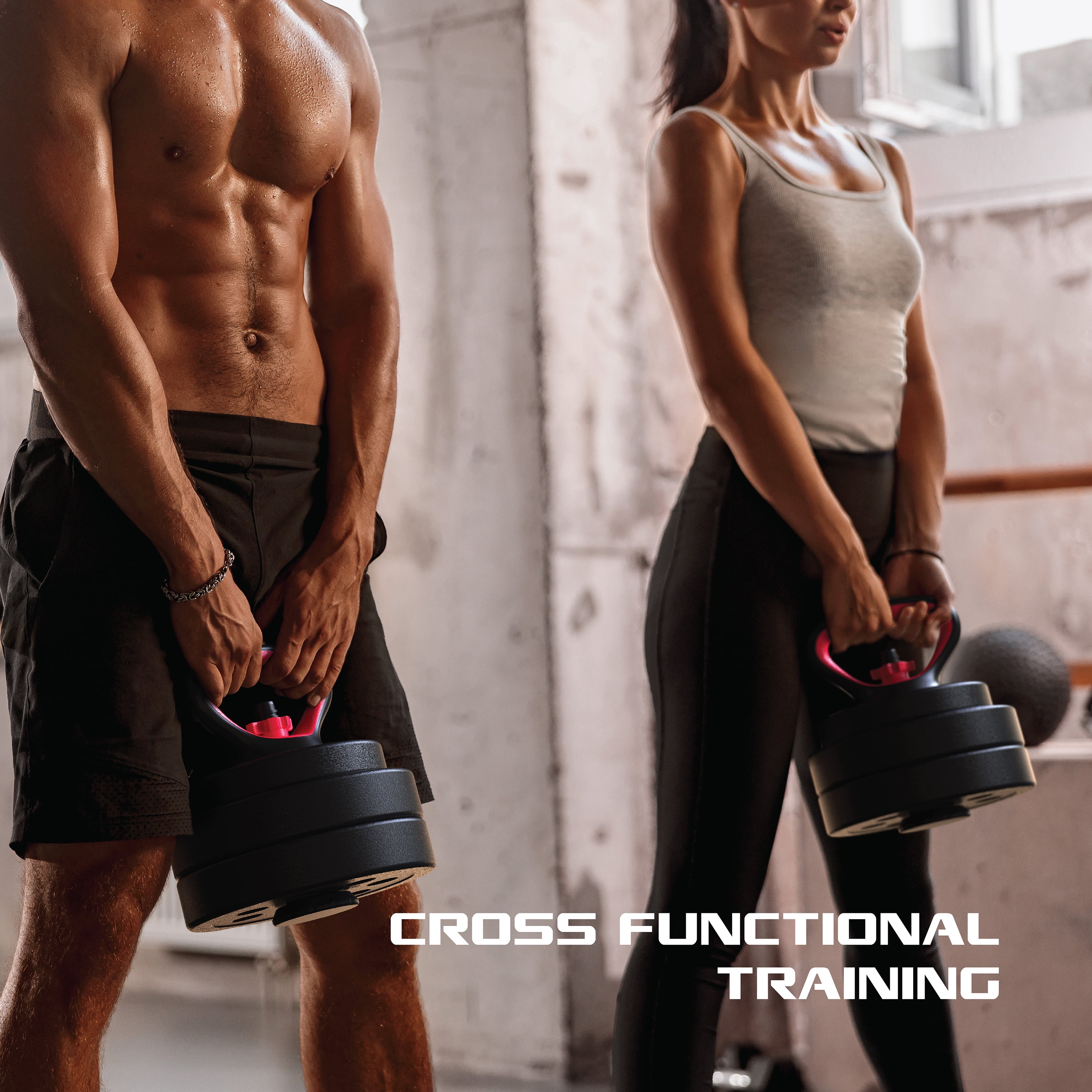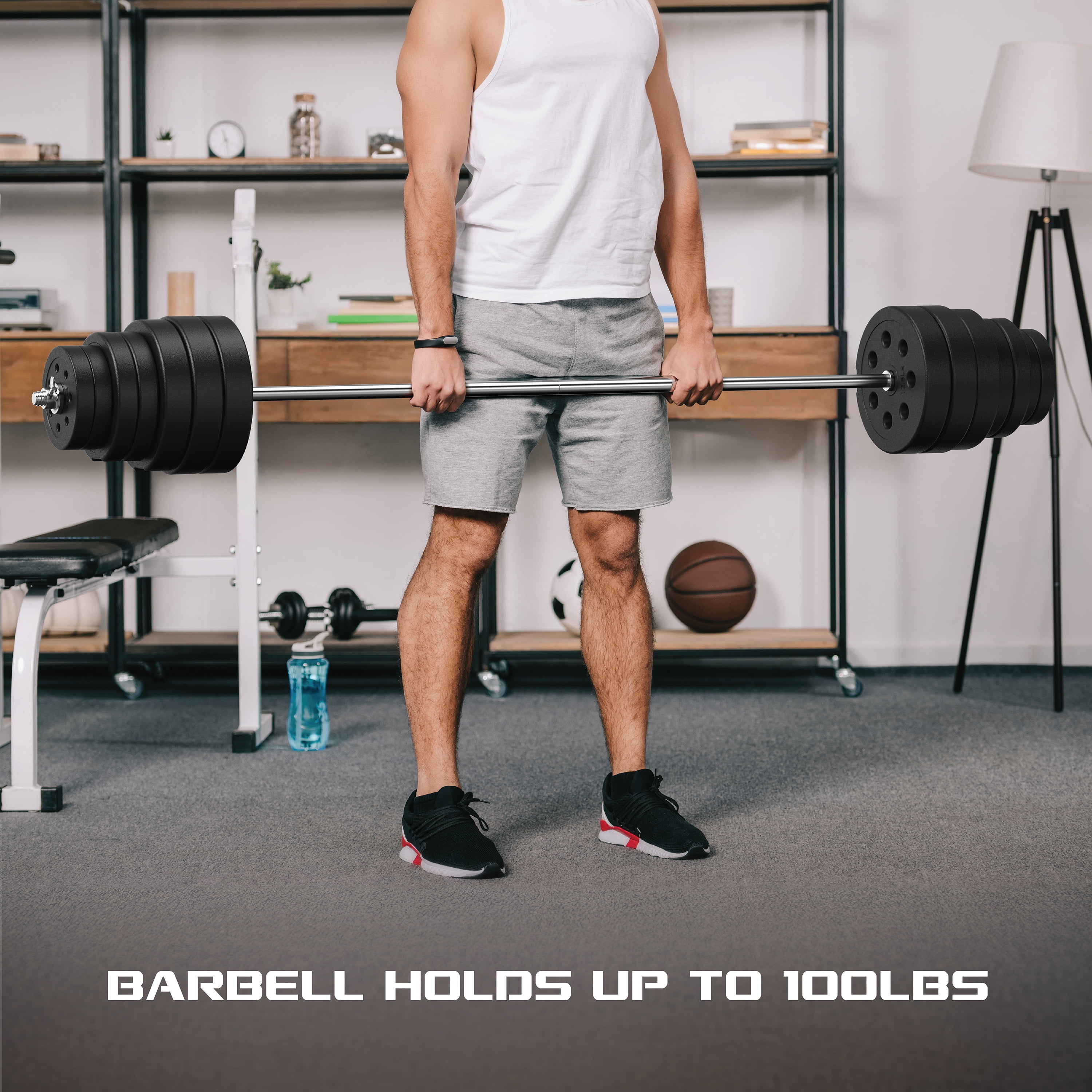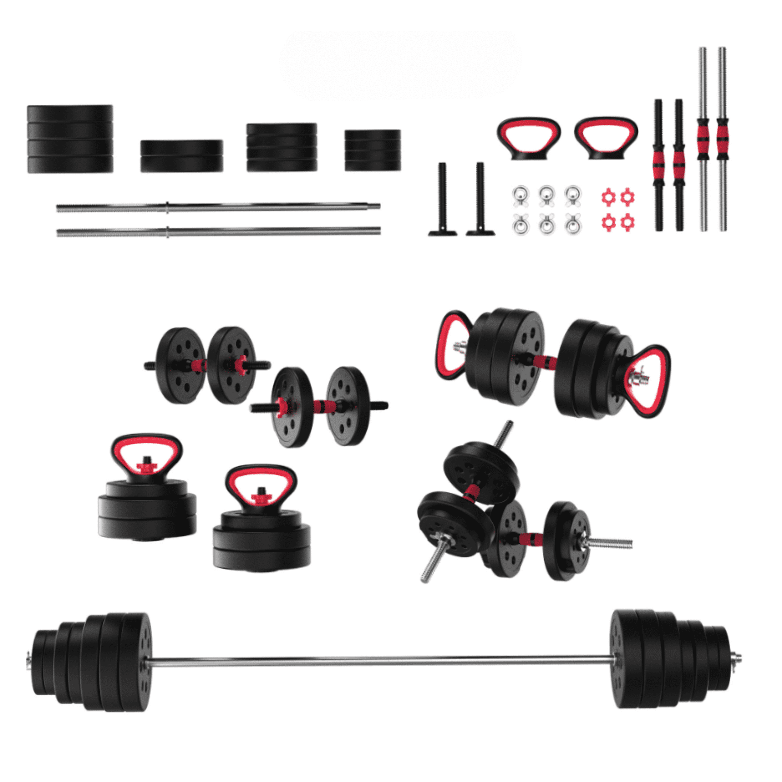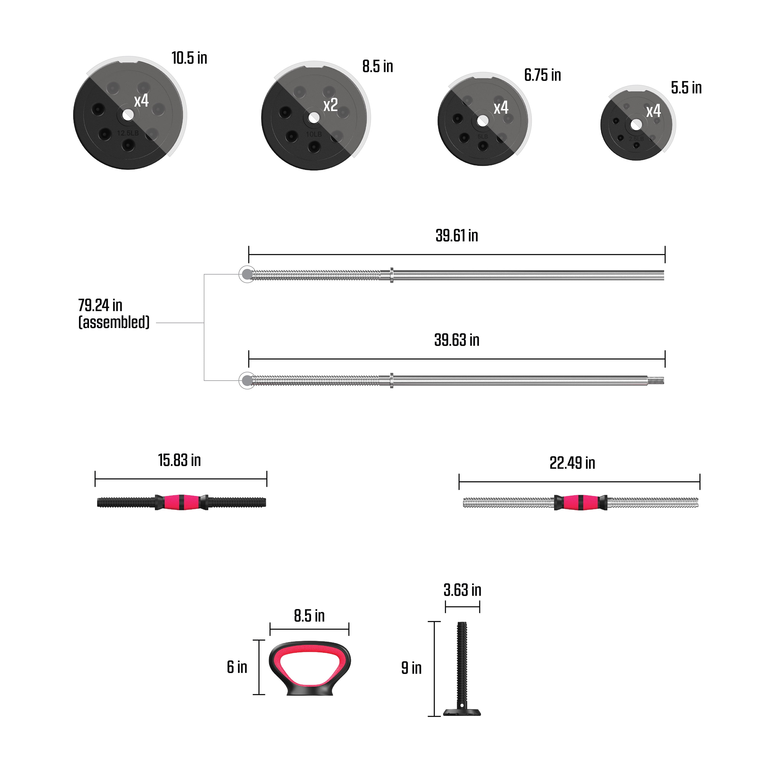 Two sets of adjustable dumbbells: Metal dumbbells can hold up to 100lbs; Plastic dumbbells and kettlebells hold up to 50lbs Customizable weight configurations totaling 100 lbs 32-piece black interchangeable weight system can be used as four dumbbells, a barbell, two kettlebells, and push up handles 10 collar locks (6 metal, 4 plastic) so there’s no need to constantly disassemble and reconfigure different weight systems Includes 4 x 12.5lbs plates, 2 x 10lbs plates, 4 x 5lbs plates, 4 x 2.5lbs plates, 2 x kettlebell bases, 2 x push-up / kettlebell handles, 10 x collar locks, 1 x barbell, 2 x metal dumbbell bars, 2 x plastic dumbbell bars
