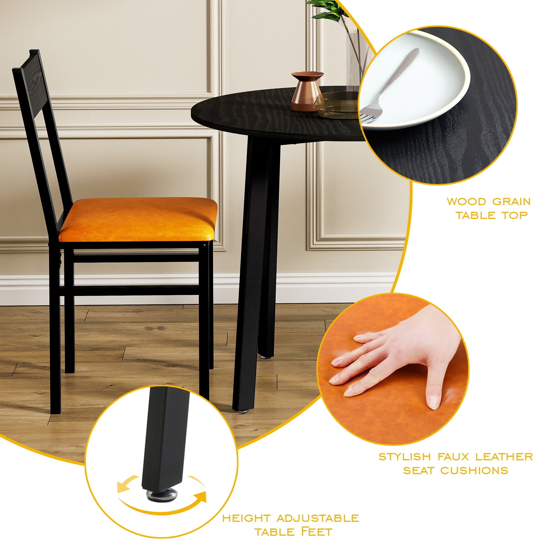 FITUEYES 3 Piece Modern Dining Table Set, Black/Vintage Orange Modern Design: Features a sleek black wood grain tabletop that adds a touch of elegance to any living space Durable Construction: Built with high-quality steel and P1 grade plate for stability and long-lasting use Compact and Versatile: Ideal for kitchens, apartments, or balconies, suitable for breakfast, tea, or casual dining Comfortable Seating: Accommodates up to four diners comfortably, making it perfect for family meals or intimate gatherings Refined Appearance: Blends seamlessly into your home decor while offering practical and stylish seating solutions
