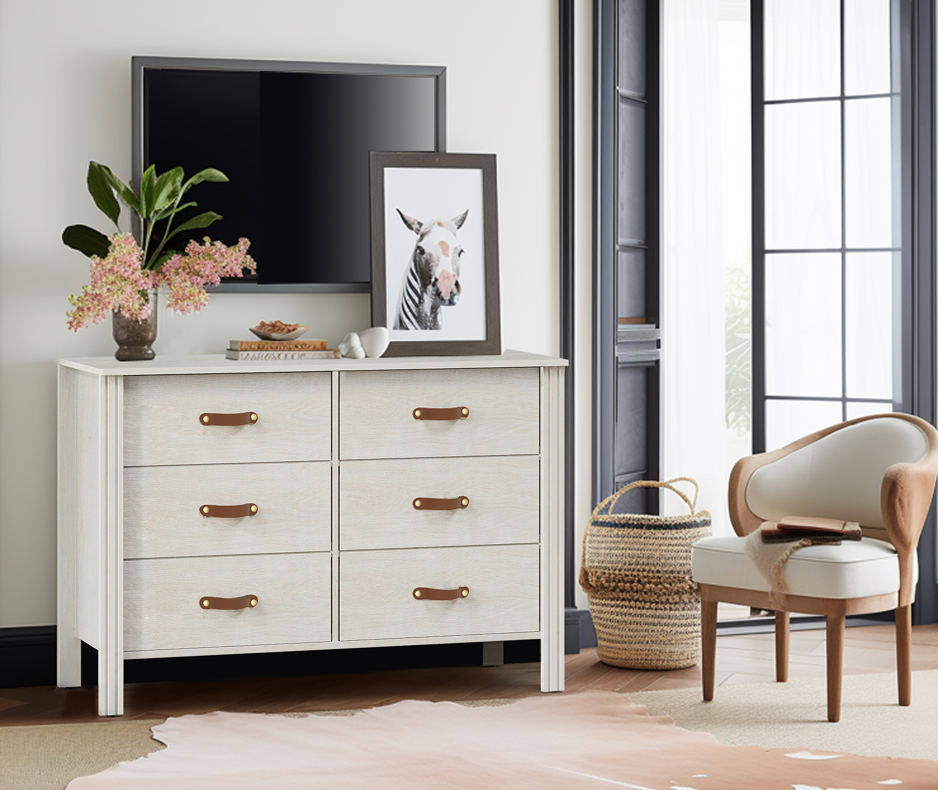 FITUEYES Classic White Wooden Dresser, 6 Drawer Storage Modern design complements various room styles and decorations Made of high-quality MDF material, waterproof and scratch-resistant Sturdy frame supports up to 44 lbs on top and 6.6 lbs per drawer Versatile usage as a dresser, storage cabinet, or console table Suitable for living rooms, bedrooms, hallways, entryways, and small spaces Features 6 deep drawers and a wide tabletop for ample storage Easy assembly with included screws and detailed instructions