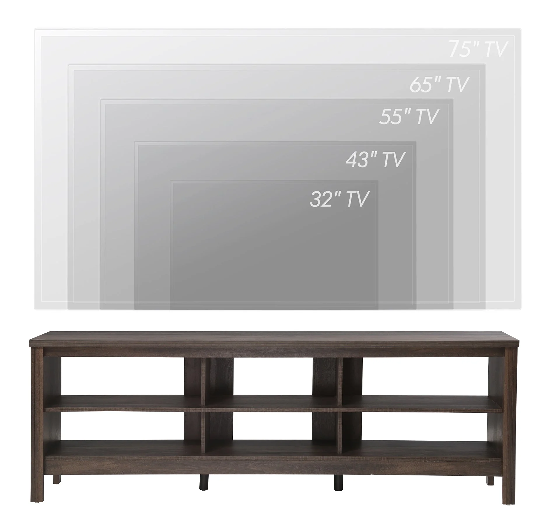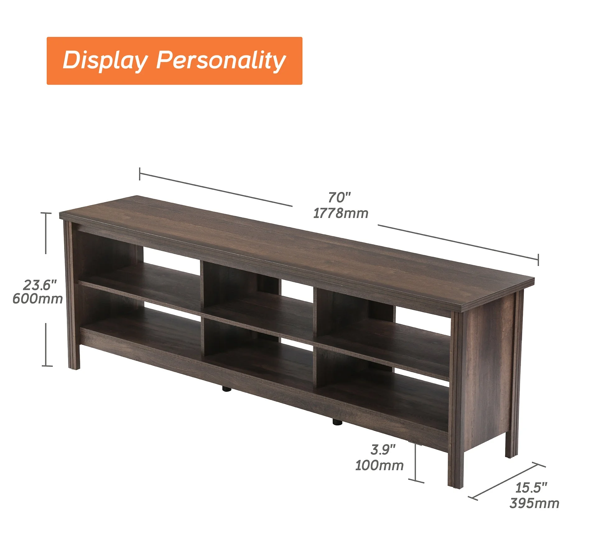 【6 Open Storage】This 70 inch long tv console is perfect for TVs up to 75 inch Flat Screen.6 open shelves with big capacity allow you to storage the books, magazines, CDs and any other media or gaming devices. 【Farmhouse TV Stands】The black wood grain and simple lines on this entertainment stand make it look classic and elegant. It can be not only used as TV stand, also perfect for sofa table, entertainment center, media stand, storage console table, etc. 【Stable Structure& Easy To Clean】The entertainment center made from high-grade certified MDF for long-lasting construction.Its smooth surface is waterproof and easy to keep clean with a damp cloth.