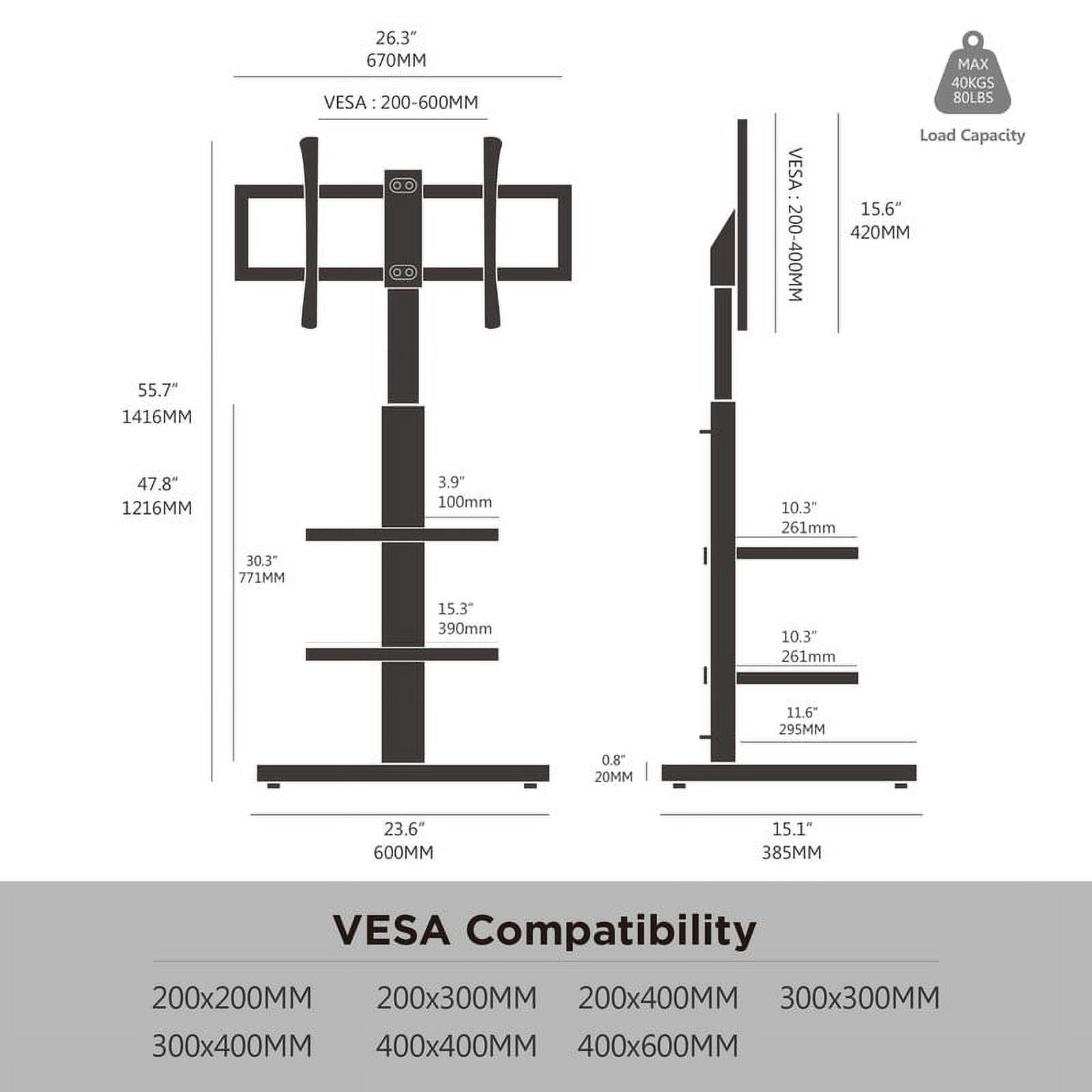 This universal floor TV stand fits most 32 -70 inch flat and curved LCD/LED/Plasma TVs up to 88lbs. Make sure your VESA (mounting hole pattern) falls between: 200(w)x200(h)-400(w)x600(h)mm Cable management: Integrated cable pass through port and collect the messy cables allows you to tidy your room clean and no longer disorderly with a clasp. Safe and Stable: The wood base of this TV stand is 23.6” wide x 15.1” deep for a stable stand and can carry up to 88 lbs, 4-coner non-slip rubbers pad,more stable. Multiple layers: This TV stand adds 2 layers to the classic base, loads up to 11 lbs which increases the storage space while being beautiful. Adjustable and Swivel: You can adjust the height you want in a range of 47.8”-55.7”, and allows you to pivot TV 30° left/ right, getting better viewing.