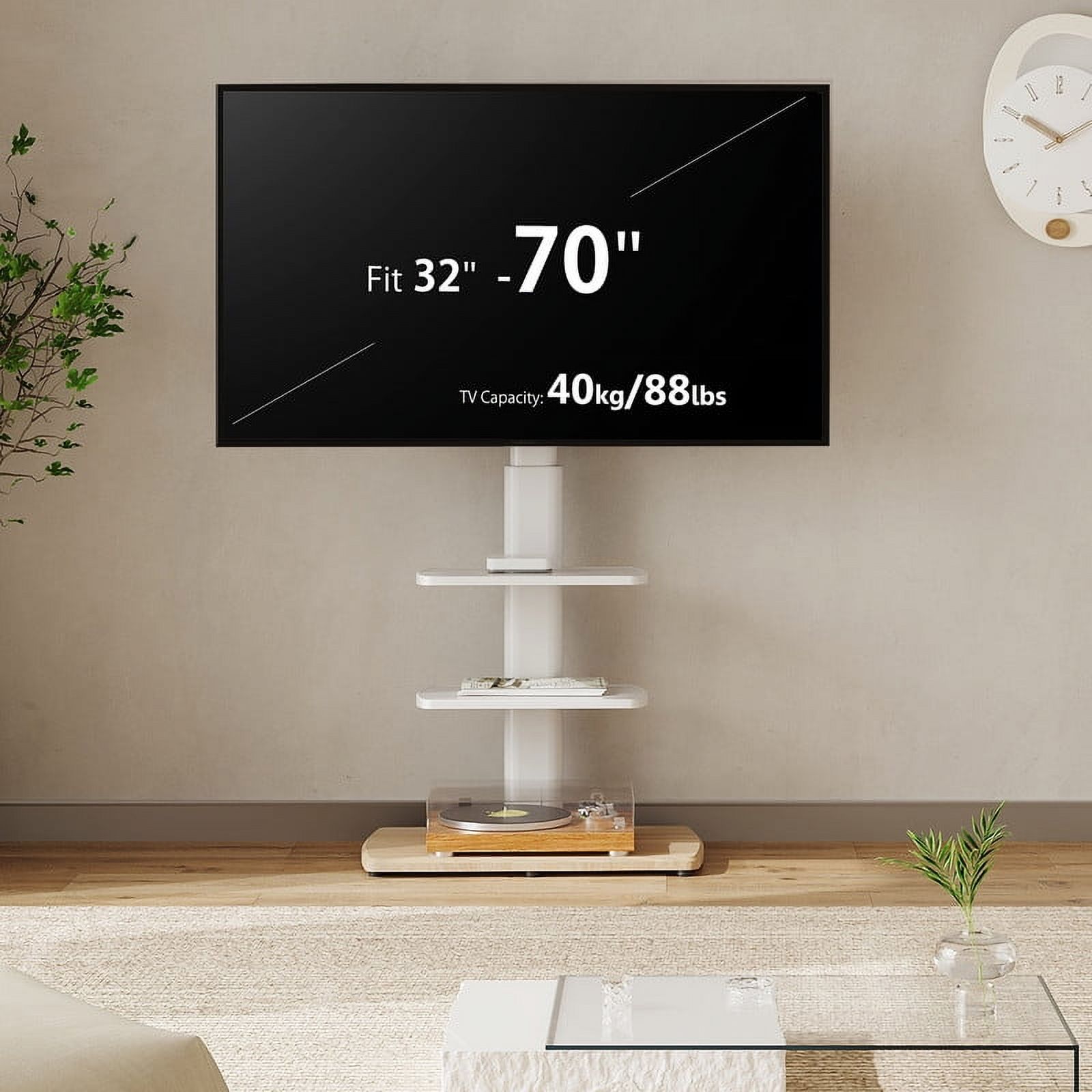 FITUEYES Floor TV Stand for 32 – 70 Inch TVs with Sturdy Wood Base Hold up to 88lbs, Swivel TV Mount Stand with Height Adjustable and Multiple layer board, White