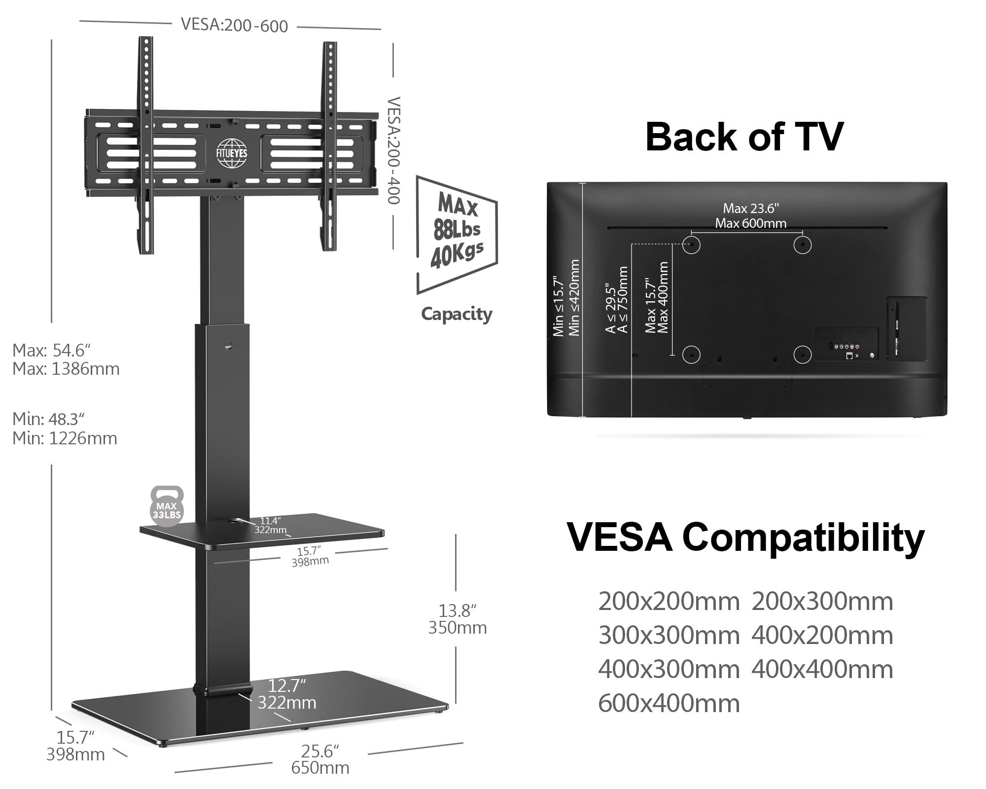 More Detailed Information: VESA available: 200(h) x 200(w) – 400(h)x600(w)mm, 200×200, 200×300, 300×200, 200×400, 300×300, 300×400, 400×400, 400x600mm, TV compatibility: 32″ – 65″ This Universal Swivel Floor TV Stand fits most 32 37 42 47 50 55 60 65 inches TVs Weight Capability: up to 88LBS. Height adjustment: 48.3″-54.6″ Base: 8mm solid tempered glass UNIVERSAL DESIGN: This universal TV mounting with large bracket fitting 32″ to 65″ LCD/LED TVs, iron pole and 8mm tempered glass base is solid and stable enough to bear 88LBS TV. Adapting to TV’s VESA with bolt drop pattern between 200 (w) mm x 200 (h) mm and 600 (w) mm x 400 (h) mm, suitable for most LCD/LED TVs. ADJUSTABLE HEIGHT & SWIVEL: Two LEV CABLE MANAGEMENT & SPACE SAVER: This corner TV stand will open up floor space, make your bedroom or living room or meeting room larger. With wire-collecting rings at the back of the pole, you can easily keep cables neat and organized.els of different heights can be adjusted on the bracket. This Universal Swivel TV stand with mount could swivel to left or right (-30 to +30 degrees), This sleek design allows you to easily choose the healthiest viewing position and watch TV no matter where you are in your room.