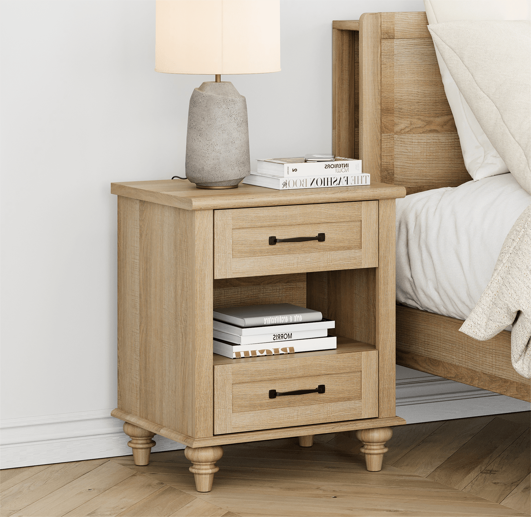 FITUEYES Indoor Medium Density Fiberboard Rectangle End Table, Oak Nightstand with Charging Station Features built-in 2 outlets and 2 USB ports along with a 6.5 feet power cord for convenient charging of mobile phones Bluetooth earphones watches lamps and laptops Side Table with 2 Drawers Offers ample storage space for photos books lamps mobile phones alarm clocks and other daily necessities helping to keep your room organized Solid Structure Made from a combination of MDF and wood frame for stable support with 4 foot pads to maintain leveling and prevent floor scratches Easy to clean with a damp cloth Multipurpose Design Can be used as an end table in the living room for office supplies storage or placed inside a closet for extra storage enhancing organization and reducing clutter Easy Assembly Comes with clear step-by-step illustrated instructions and marked hardware for straightforward assembly in approximately 30-50 minutes