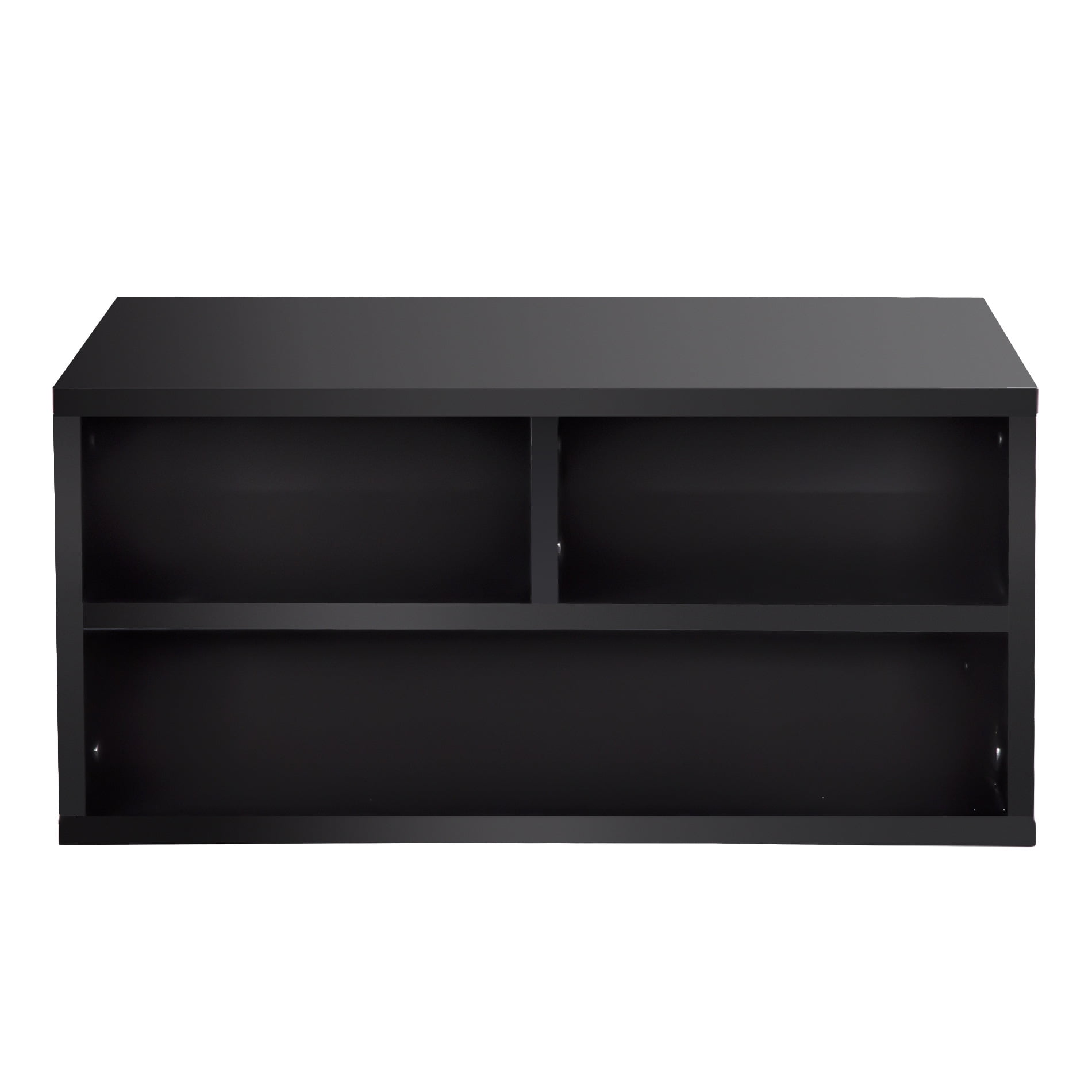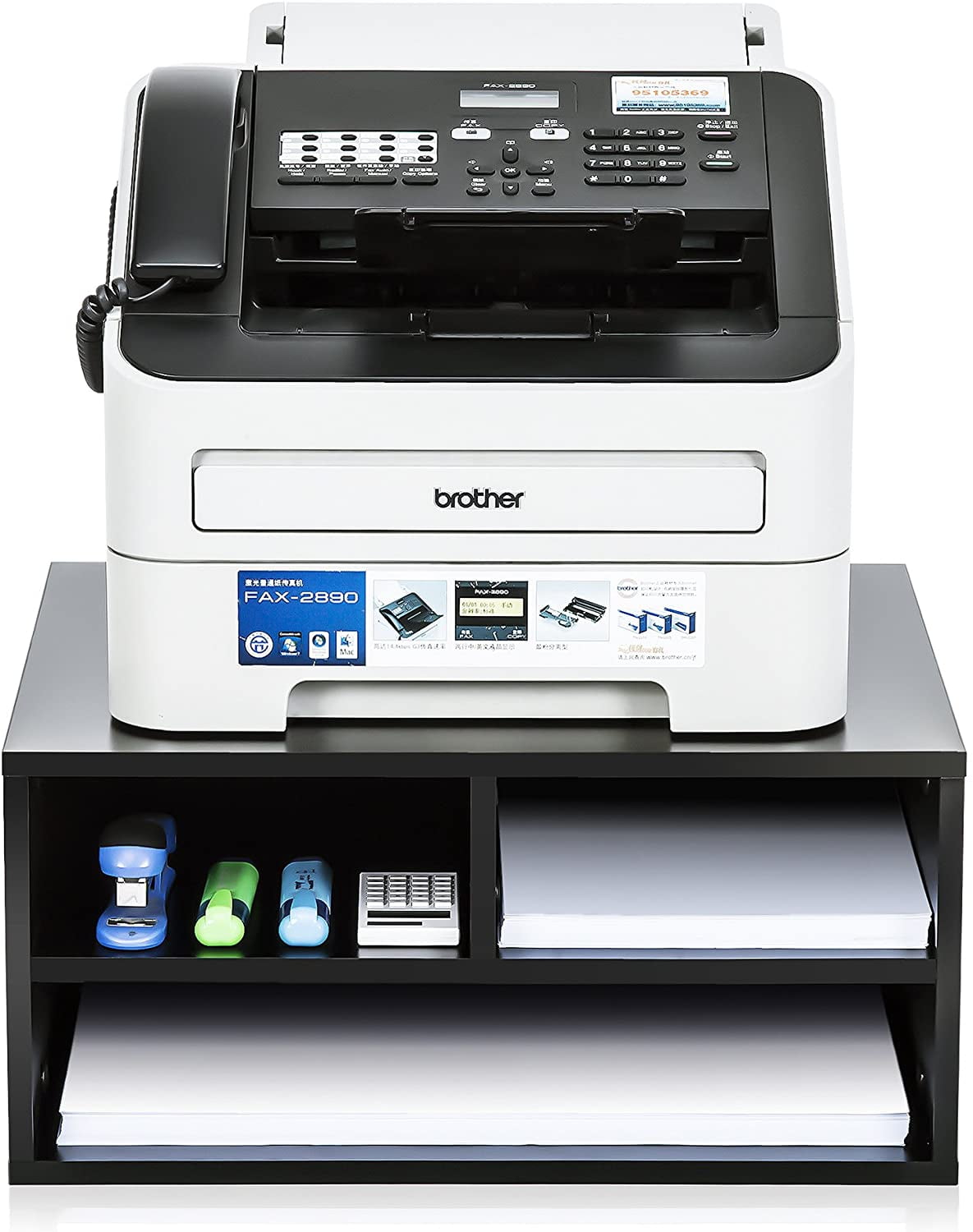This printer stand has two drawers that can be placed in any of the four locations for flexible storage of printer supplies. The design includes two shelves to fit paper reams or folders Rear access space helps manage cables and allows a flush positioning against the wall. Sturdy, wood construction features a double-coated, matte black finish for durability. Nonslip rubber feet reduce movement and protect your work surface from scratches and scuffs.