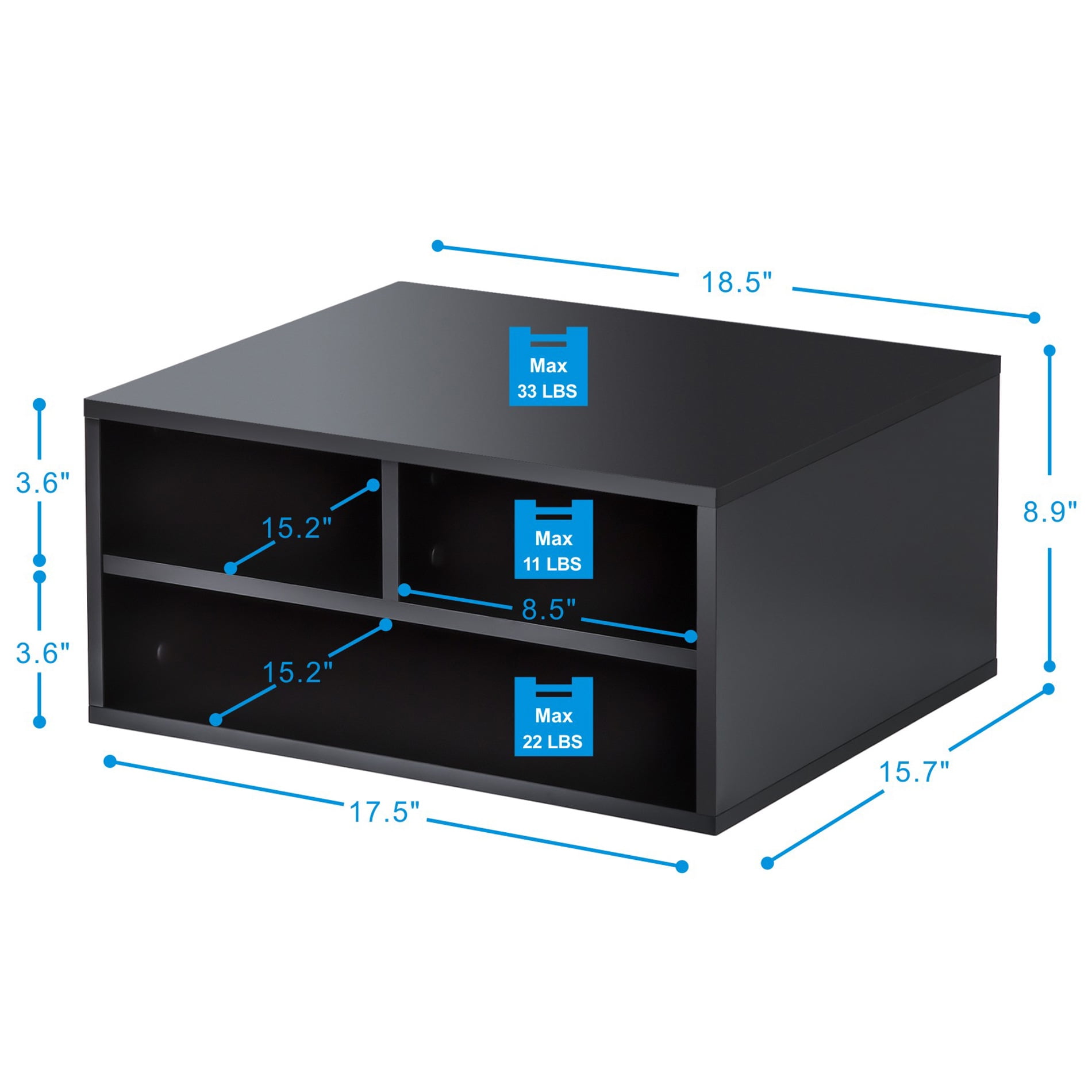 【Large Size】The assembled size of this printer shelf is 18.5″ W x 15.7″ D x 8.9″ H which provides much storage space and is great for placing a large printer.【Space Saving】This 2-tier printer stand with 3 compartments meets different storage needs. It can easily store a printer, files, standard size papers, documents, books, mails, letters, and other supplies, make the desktop organized.【User Friendly】Non-slip rubber feet reduce movement and protect your work surface from scratches and scuffs.