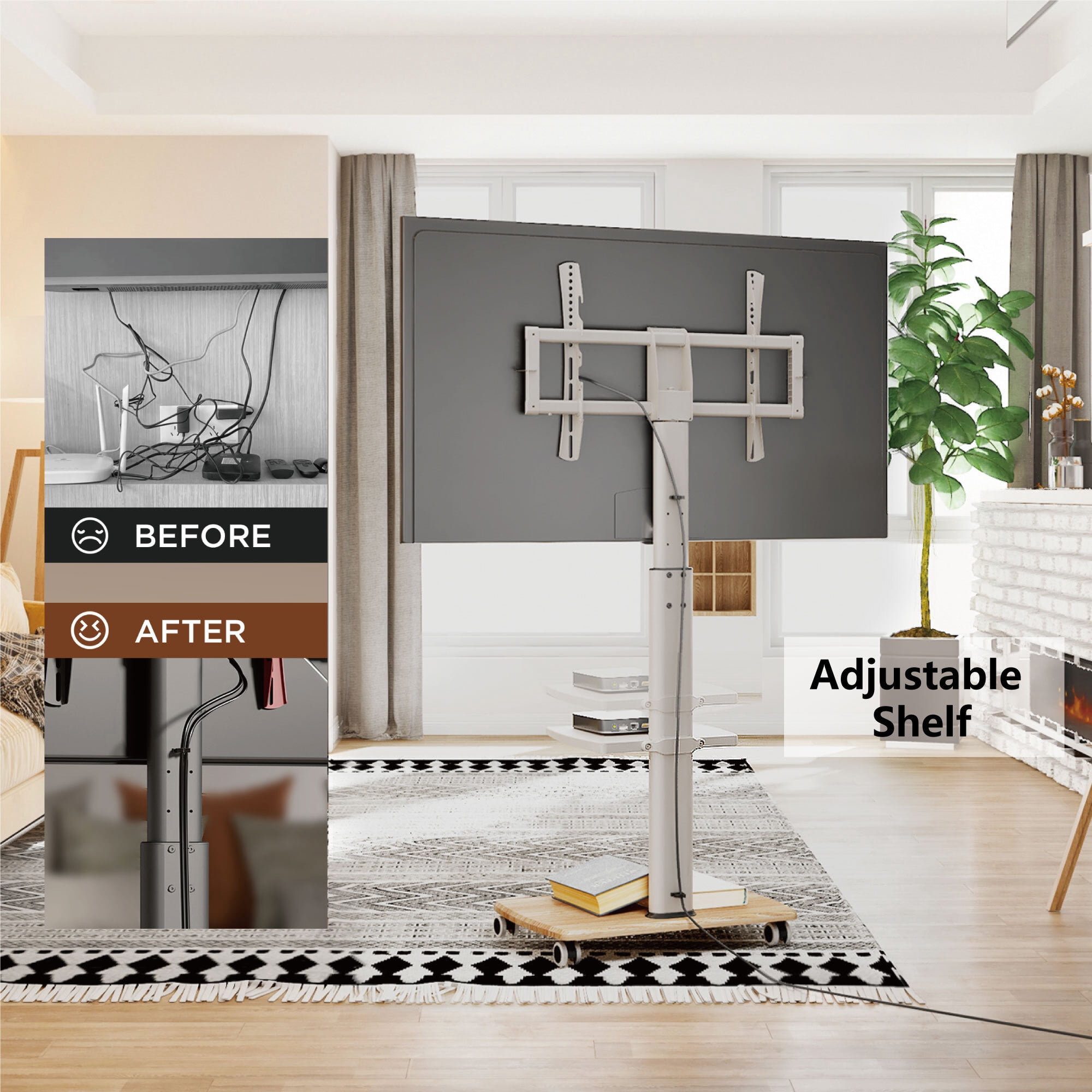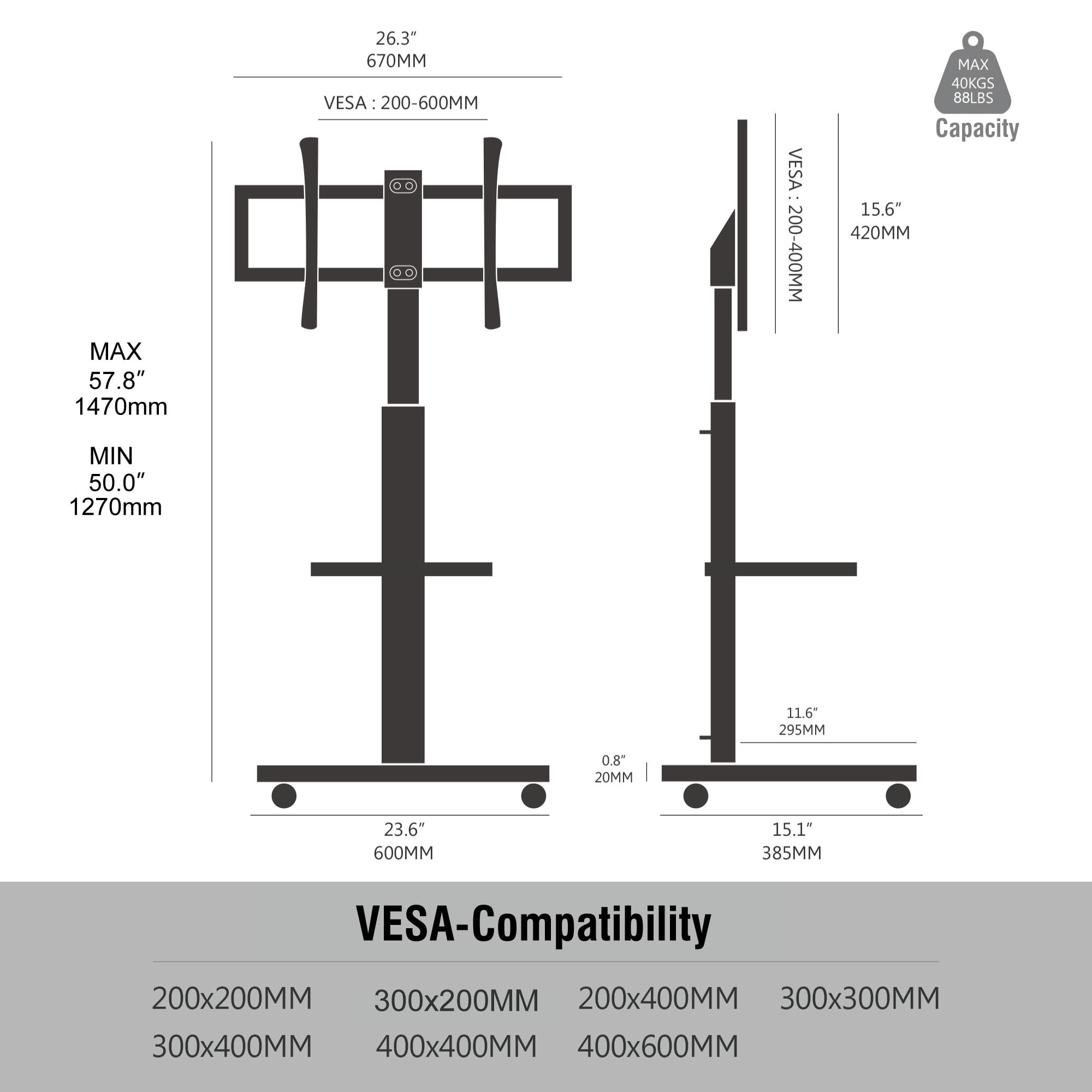 This universal floor TV stand fits most 32 -70 inch flat panel LCD/LED/Plasma TVs up to 88lbs. Make sure your VESA (mounting hole pattern) falls between: 200(w)x200(h)-600(w)x400(h)mm Adjustable and Swivel: You can adjust the height you want in a range of 50”-57.8”, and allows you to pivot TV 30° left/ right, getting better viewing. Mobile and more secure: This mobile TV stand with 360° rotating wheels allow you to move the TV more smoothly to where you want to go, and the added safety lock makes it easier to secure the TV bracket from random movement. Wood-textured base and upgrade brackets: Different from the fragile heavy glass base of similar floor TV mount. The wood-textured base gives you a sense of simplicity and sophistication, and provides stability for this mobile TV stand. Straightening out the wire: The buckle wire behind the support column is no longer disorderly with a clasp.