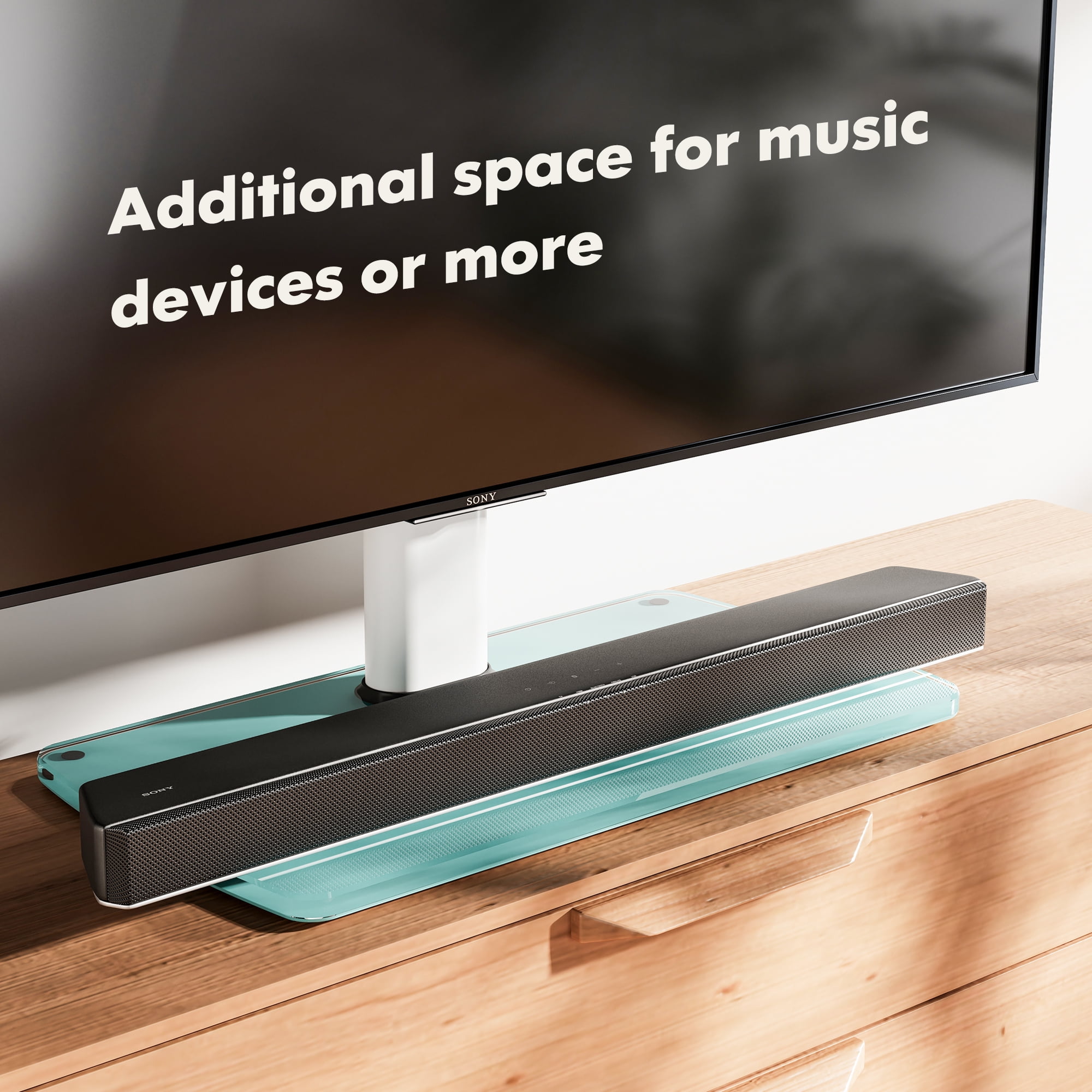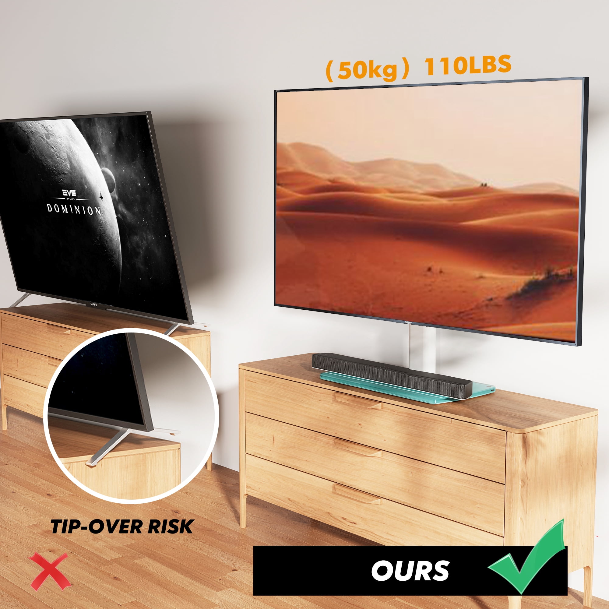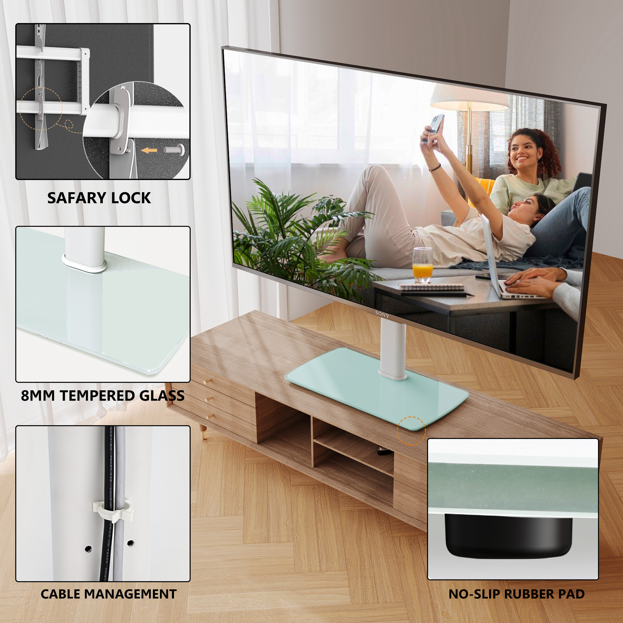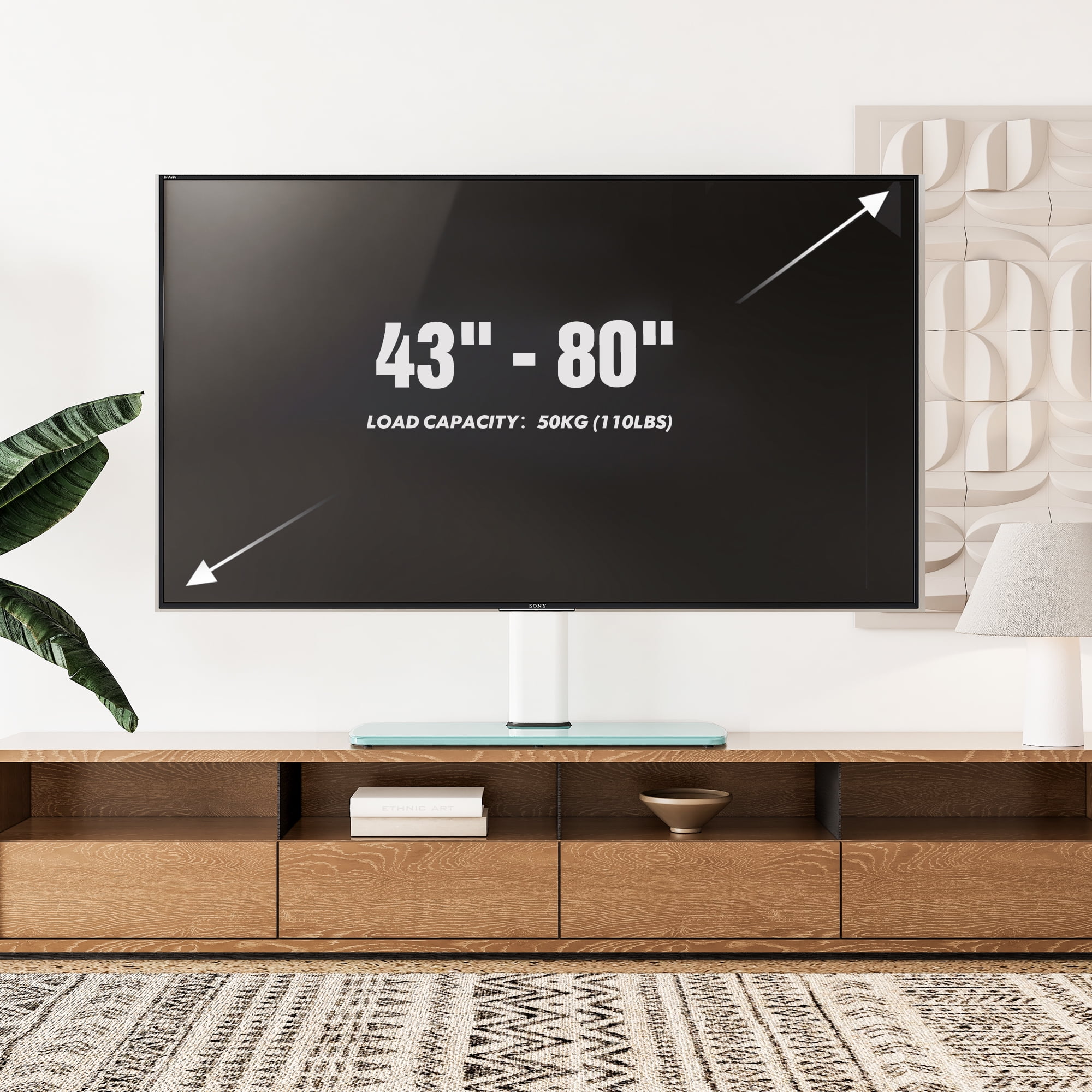 This universal table top TV stand fits most 43-80 inch flat or curved panel LCD/LED/Plasma TVs up to 110lbs. Make sure your VESA (mounting hole pattern) falls between: 200(w)x200(h)-400(w)x600(h)mm.The buckle cable behind the support column is no longer disorderly with a clasp. Adjustable and Swivel: You can adjust the height you want in a range of 34” to 43”, and allows you to pivot TV 30° left/ right, getting better viewing. Safe and stable: The 8mm thickness tempered glass base of this TV stand is 24.4” wide x 13” deep for a stable stand and can carry up to 110 lbs, and also bring you extra space for more music devices. 4-coner non-slip rubbers pad,more stable. Easy installation: Our universal table top TV stand comes with an easy to use instruction manual for quick and easy installation with fittings provided. Without drilling, avoid wall damage.