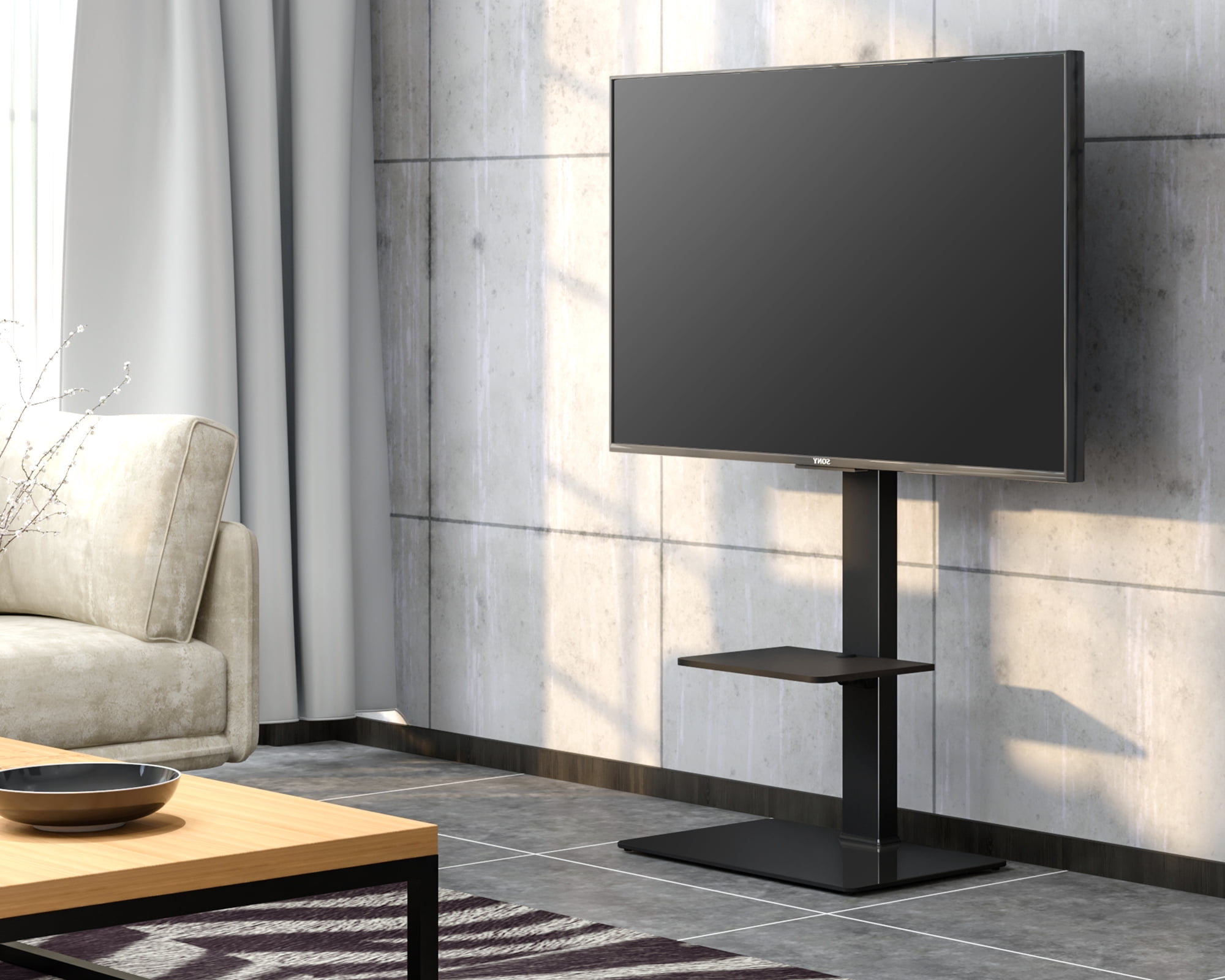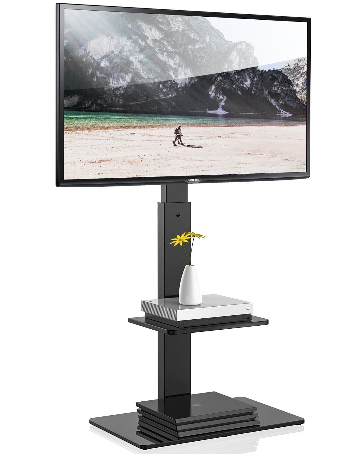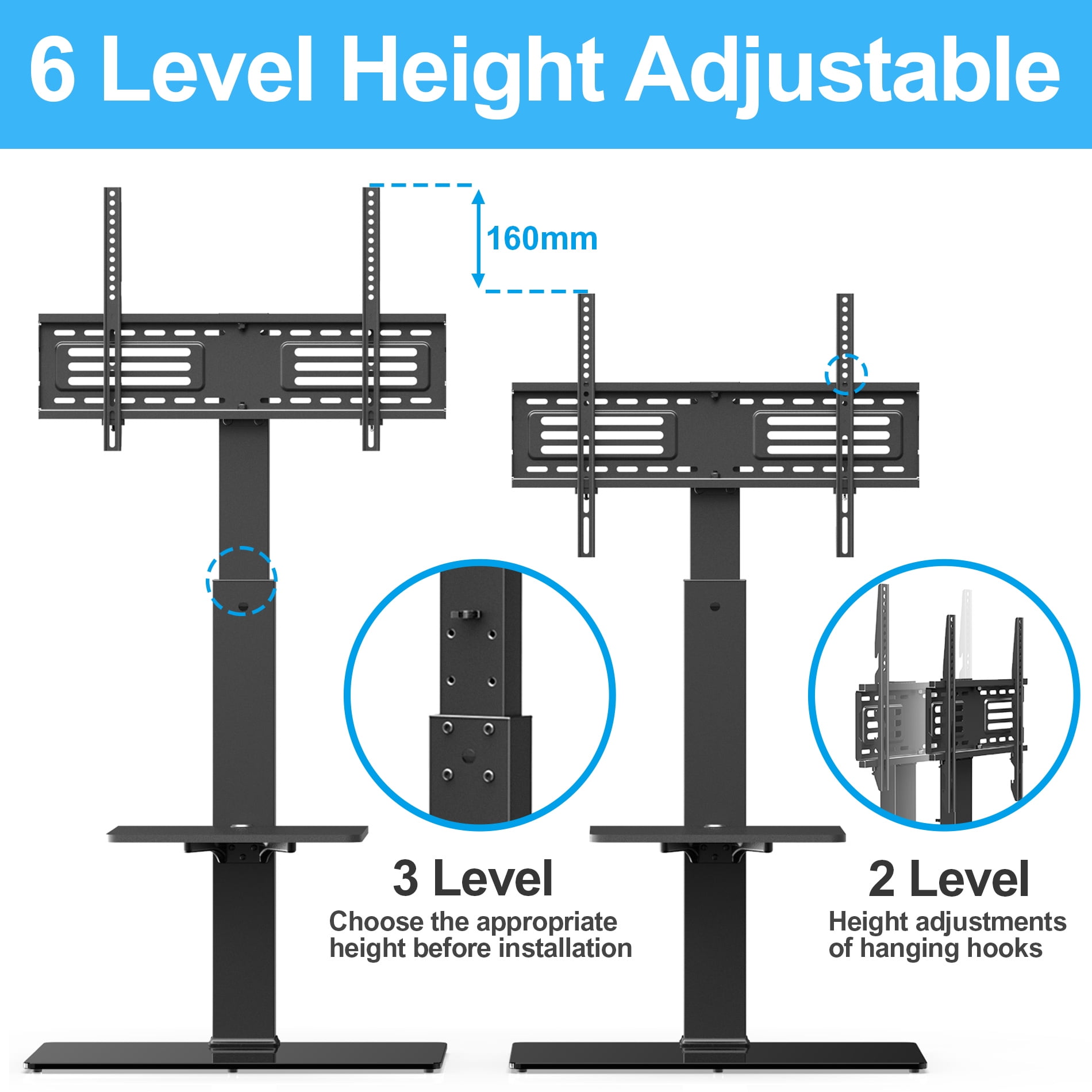 We are a professional business group that strives to offer the best quality products at great value prices. Our products are sourced directly from highly qualified manufacturers who meet our selection requirements. All our products go through a rigorous testing and product development phase before being offered for sale. More Info for this Fitueyes TV stand with shelf: VESA mounting standards: 200(h) x 200(w) – 400(h)x600(w)mm 200×200, 200×300, 300×200, 200×400, 300×300, 300×400, 400×400, 400x600mm This Fitueyes Universal Swivel Floor TV Stand fits most 32 37 42 47 50 55 60 65 inches flat panel TVs and curved TVs, weights up to 88 LBS. Like Sony / Samsung / Vizio / Sharp / TCL / Hisense / LG / Panasonic / Sharp. Features: Height adjustment: It can adjust the height from 48.3′-54.6’the bottom to the top of the hooks. Swivel: ± 30° Base: Solid tempered glass