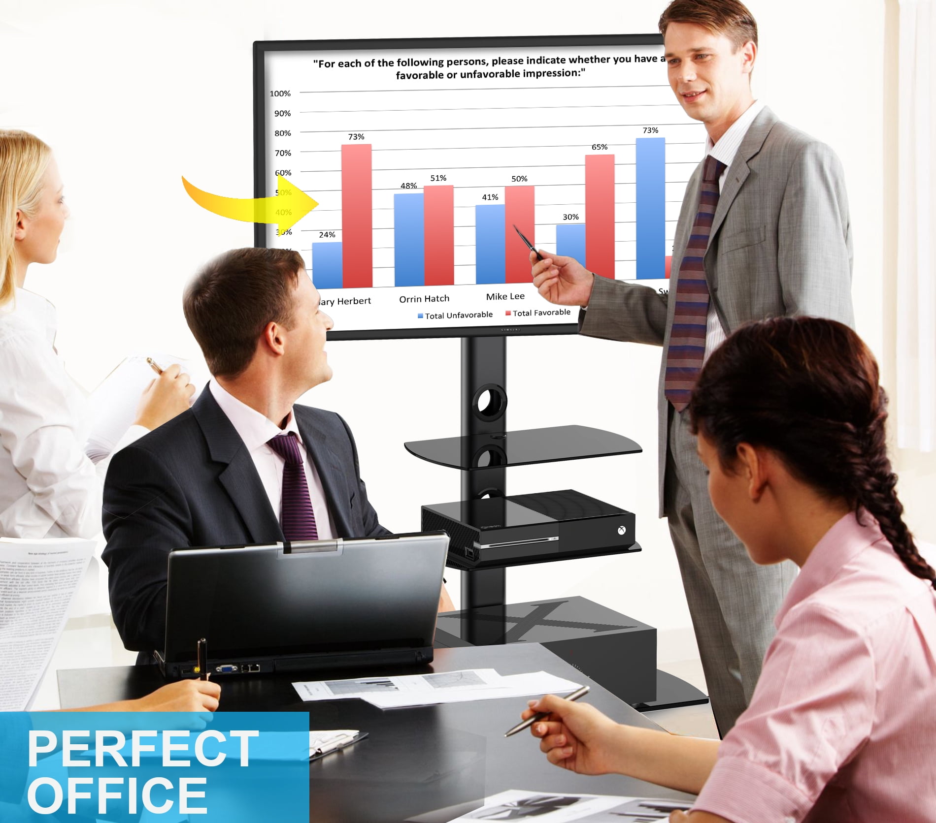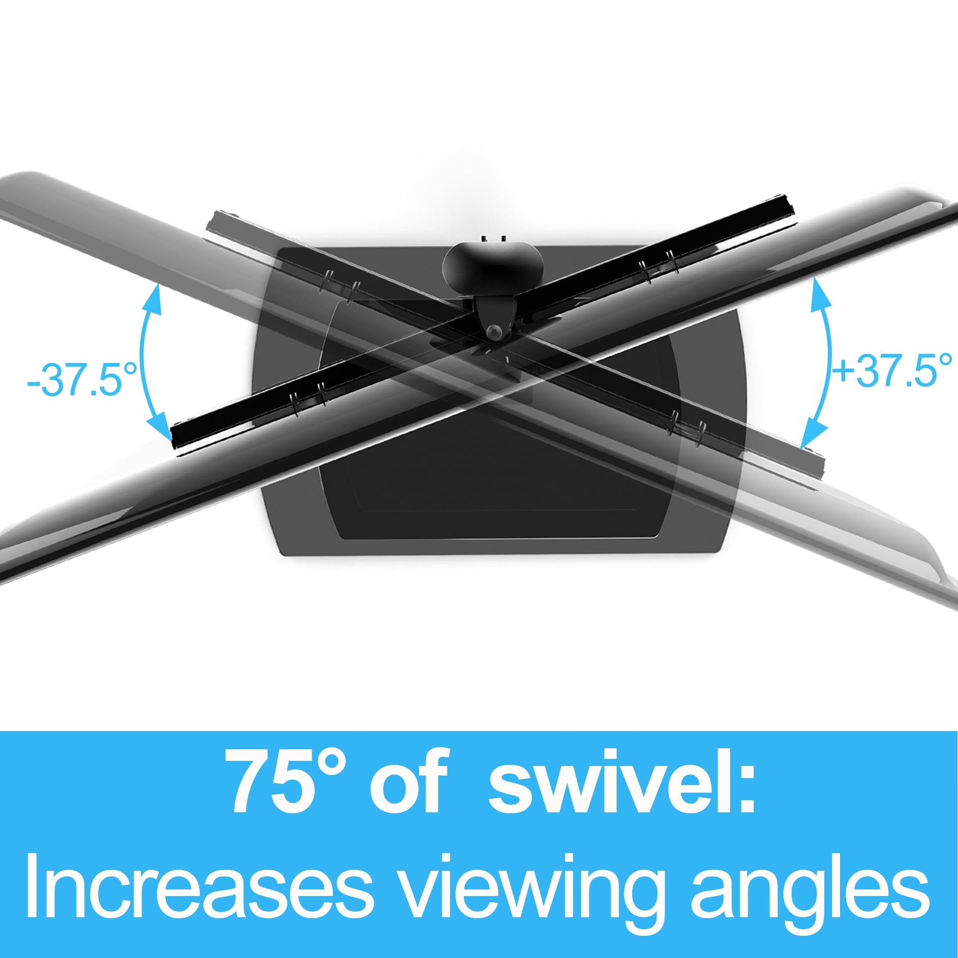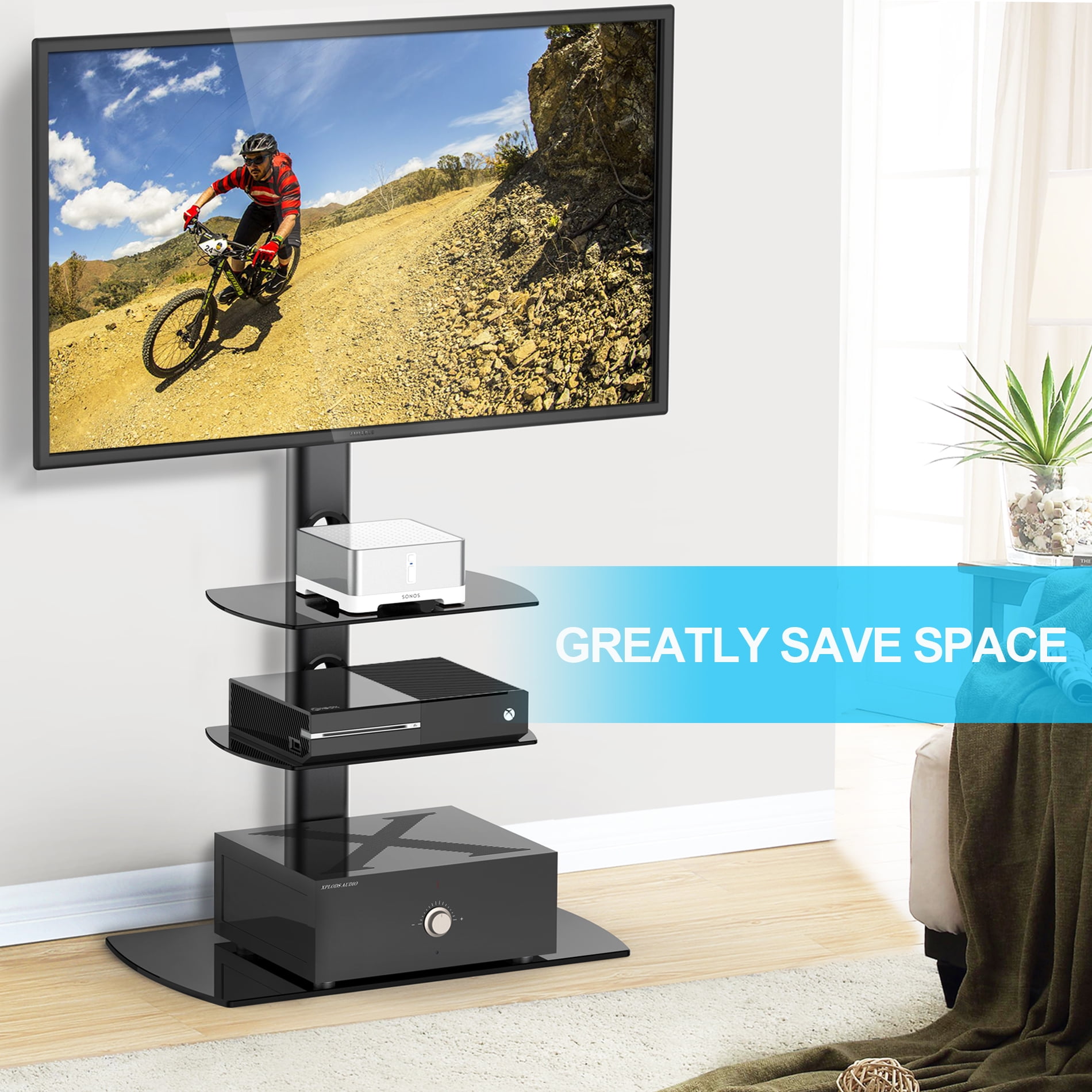 FITUEYES TV Stand with Swivel Mount and Glass Shelves for TVs up to 65″, Black