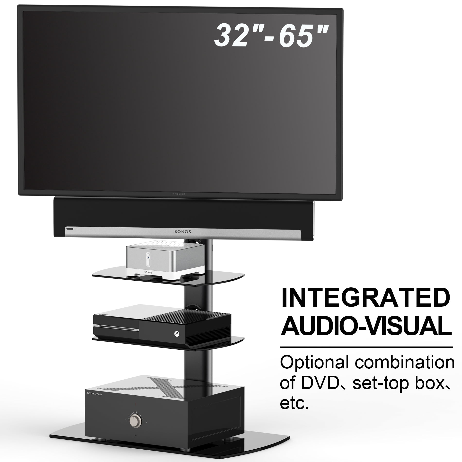 【TV Compatibility】–TV Stand for 32 37 39 40 43 50 55 60 65 inch flat or curved screen TV, make sure your VESA patterns fall between 200(w)x200(h) to 600(w)x400(h), 110 lbs weight loading capacity.【Cable/Wire Management】-A specially designed channel in the column is made to hide all your wires, which make your room neat and clean. Especially a good TV stand for bedroom/dorm/small room.【Tempered Glass Shelves】 Thick and black 10mm safety tempered glass shelf built up a strong TV stand base to support your TVs and audio/ video components. This floor TV stand with media shelf is wide enough to hold your entertainment such as DVR DVD Players Cable Boxes Consoles Satellite XBox PS3. Shelf weight capacity: 33 lbs.