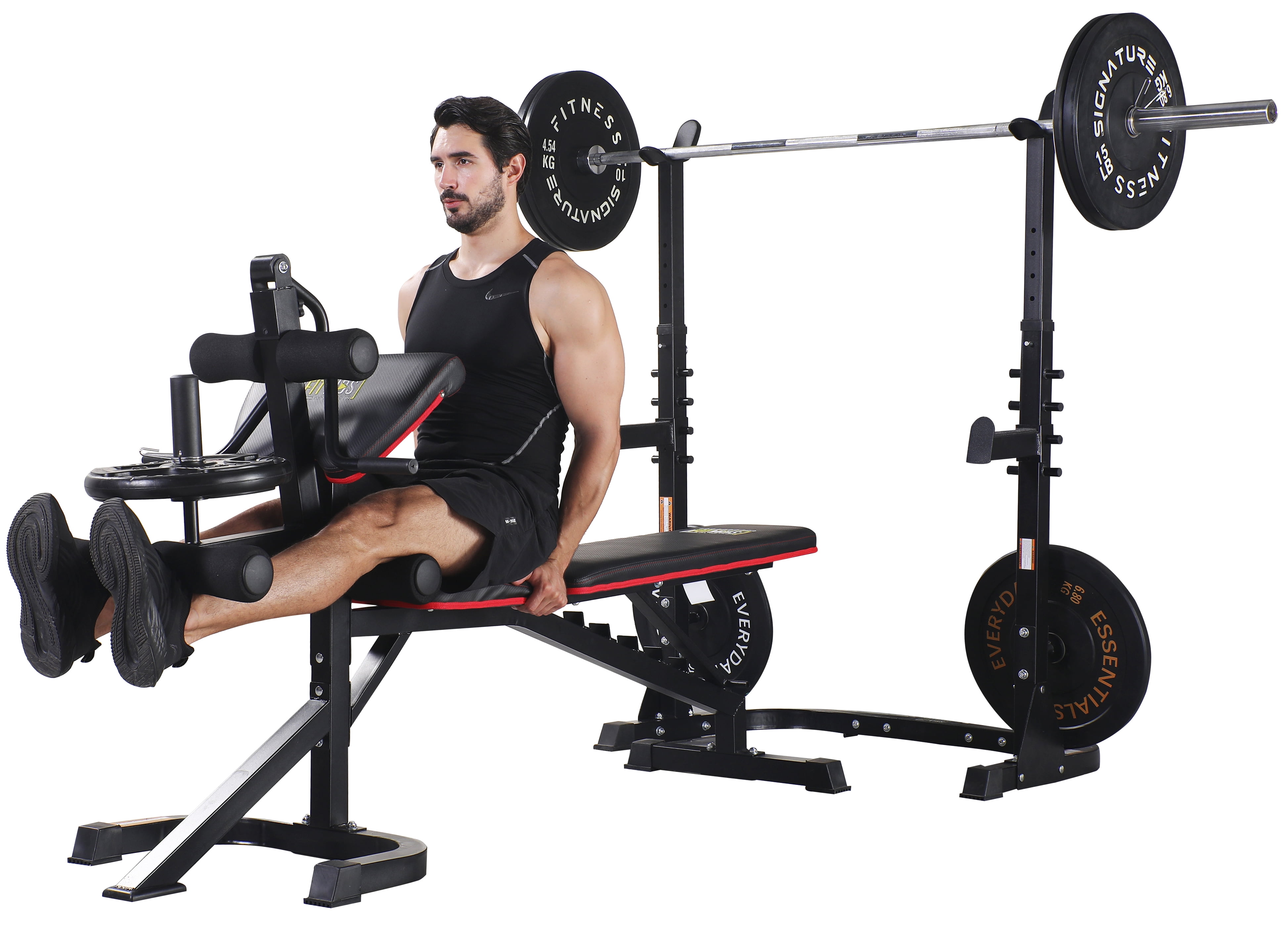 Fitvids LX600 Adjustable Olympic Workout Bench with Squat Rack, Leg Extension, Preacher Curl, and Weight Storage, 850-Pound Capacity (Barbell and weights not included) Elevate your home gym experience with the Fitvids EGZ-3000 Adjustable Olympic Workout Bench – a versatile powerhouse designed for serious fitness enthusiasts. This two-piece marvel seamlessly combines an adjustable Olympic bench and squat rack, offering a dynamic range of workout possibilities. The bench is your gateway to a diverse chest workout, easily transitioning between incline, flat, and decline press positions. Paired with a fully adjustable squat rack, you have the freedom to customize your workout heights, ensuring a tailored exercise experience. Crafted from high-quality alloy steel, this heavy-duty fitness companion boasts a remarkable 850-pound total weight capacity, providing stability and support for your most intense sessions. Adjustable spotting arms add an extra layer of safety, guarding against unnecessary injuries during your workout routines. What sets the Fitvids EGZ-3000 apart is its thoughtful design – the two-piece configuration allows for independent use or easy removal, offering unobstructed space for squats and other exercises. The inclusion of a Preacher curl pad and leg developer further enhances its versatility, targeting specific muscle groups with precision. Say goodbye to cluttered workout spaces. The built-in weight plate holders keep your gym neat and organized, adding a touch of convenience to your fitness routine. With dimensions of 73″ L x 46″ W x (50″-65″) H, the squat rack is adjustable to accommodate various workout heights. Designed in a sleek grey color and crafted with meticulous attention to detail, the Fitvids EGZ-3000 is not just a piece of equipment – it’s a statement of commitment to your fitness journey. Note that weight plates and a barbell are not included, allowing you the flexibility to personalize your equipment based on your preferences. Elevate your workout game with the Fitvids EGZ-3000 – where strength meets innovation.