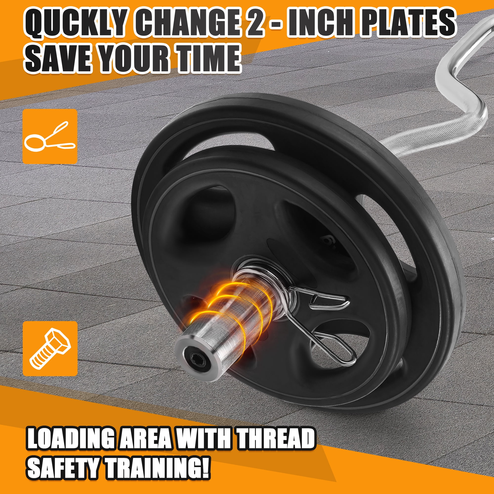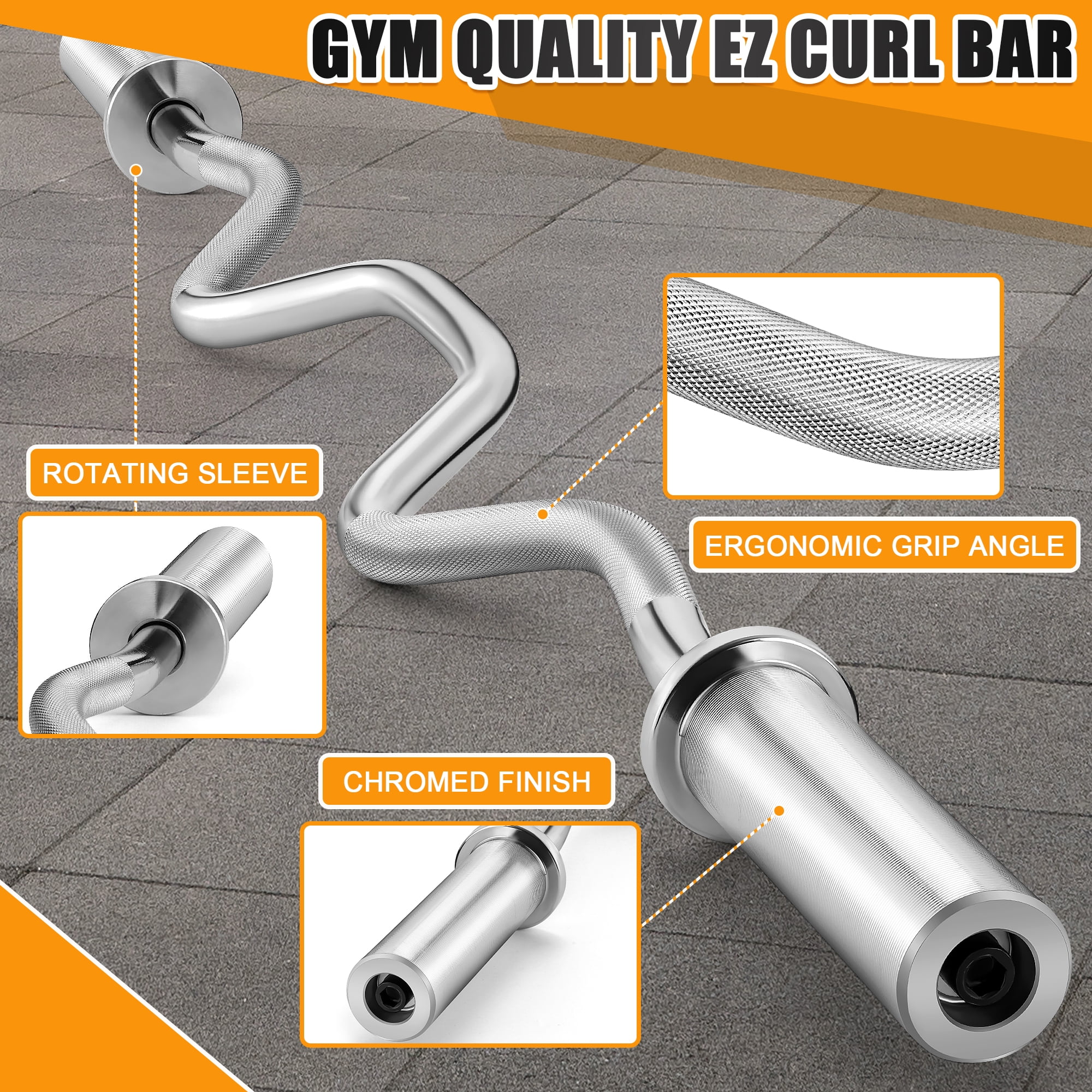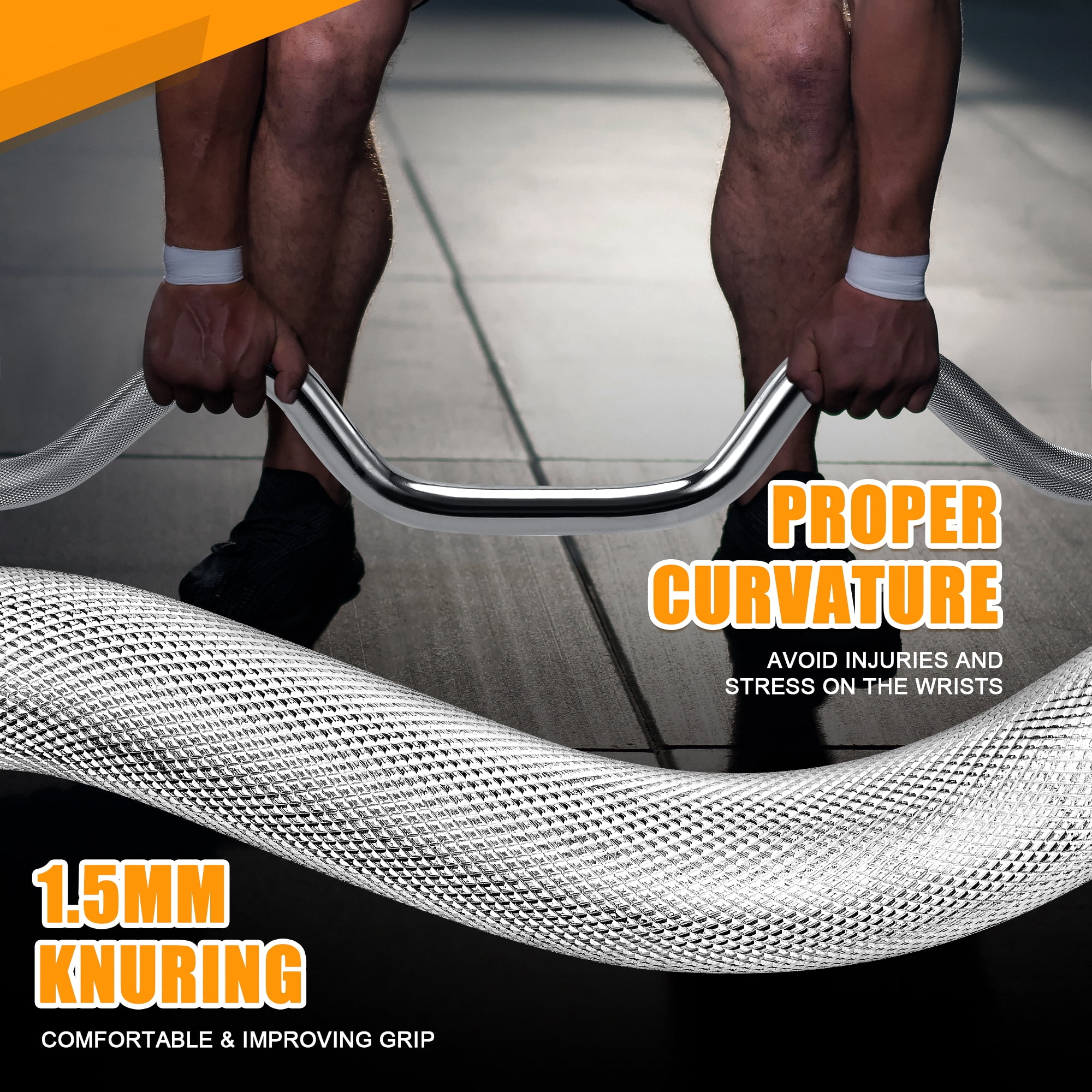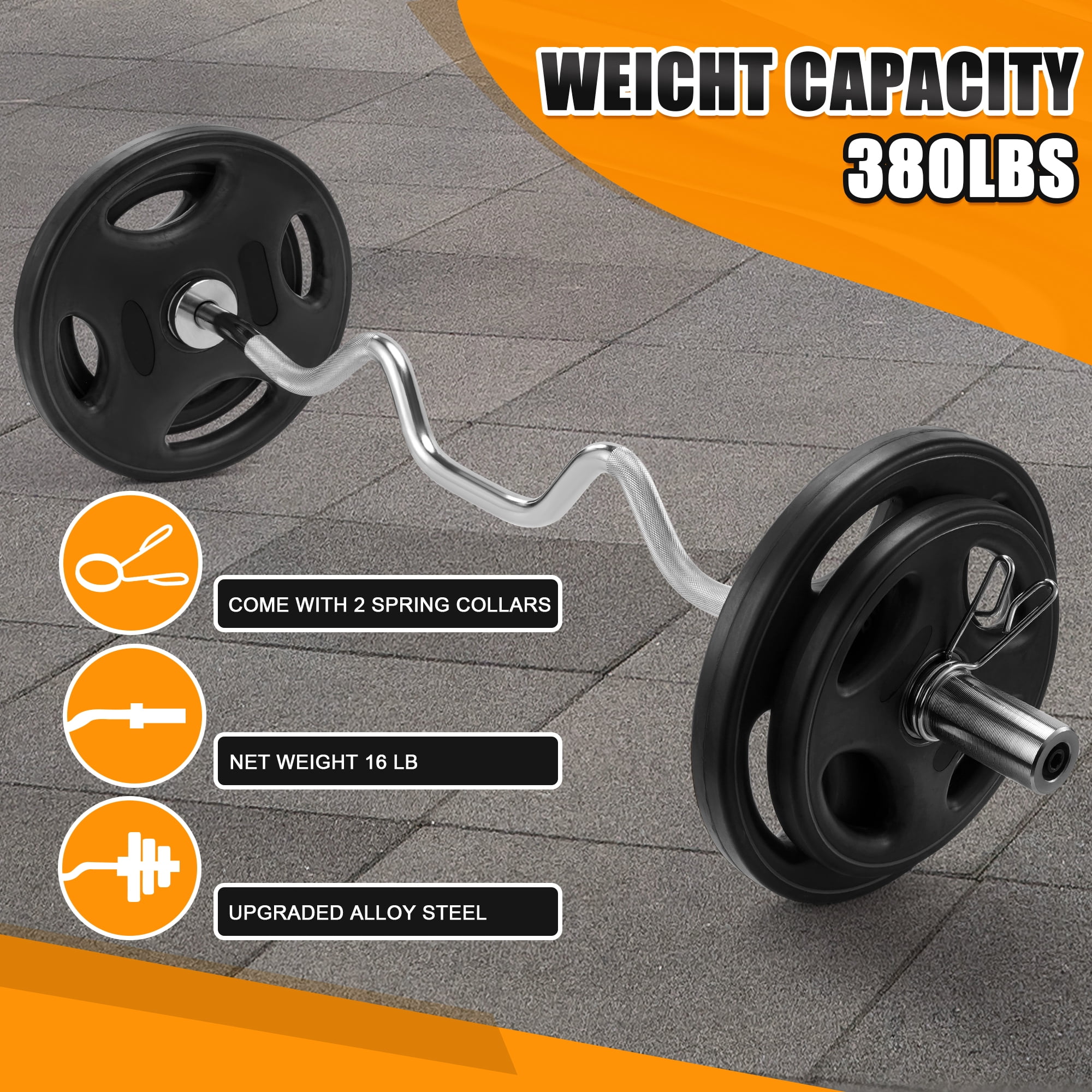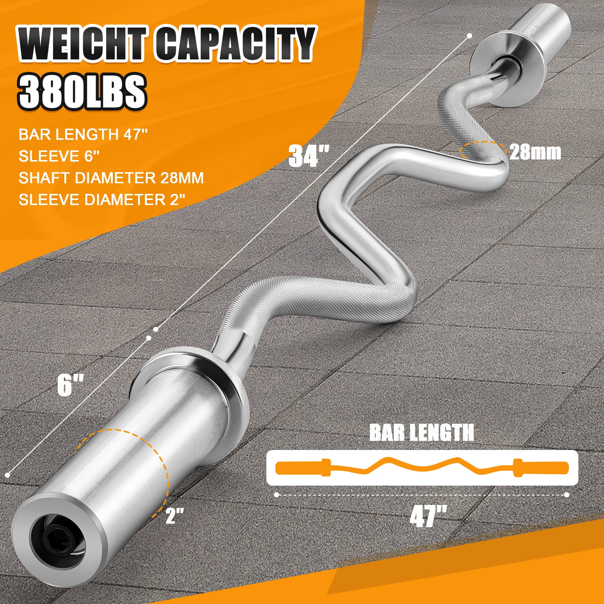 【380LBS weight capacity】16LBS Net weight, 380LBS weight capacity. Suitable for 2-inch Olympic weight plates. Very suitable for beginners and professionals. 【Durable】210,000PSI tensile strength of solid cold rolled steel and black phosphate coating give the curl bar good rust resistance. And the brass bearings in the sleeve and one-piece design will extend the life of the bar. 【Enhanced Safety】Our curl barbell is user friendly. The right grip angle and rotatable bearings at the sleeve can put you in a very comfortable position. 【Applicable Size】47″ curling bar length; 32.6″ shaft length (inside length between sleeves); 6.9″ loadable sleeve length; 7.3″ knurled length and 1.5MM knurled depth; Handle diameter 28MM. 【100% Quality Service】Customer service is online 24 hours a day. If you have a problem with your product for any reason within one year, we will send you a new one for free, no questions asked !