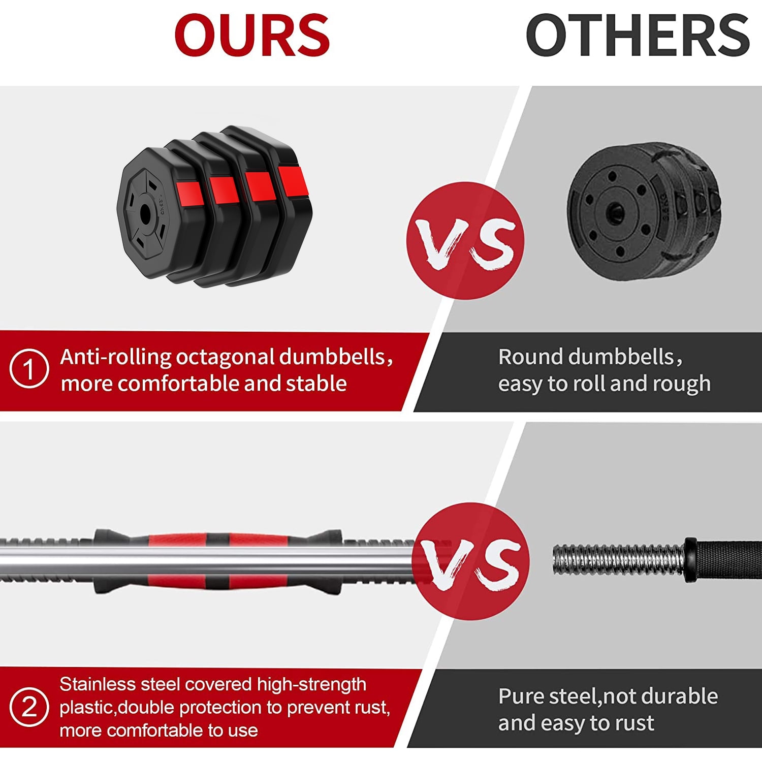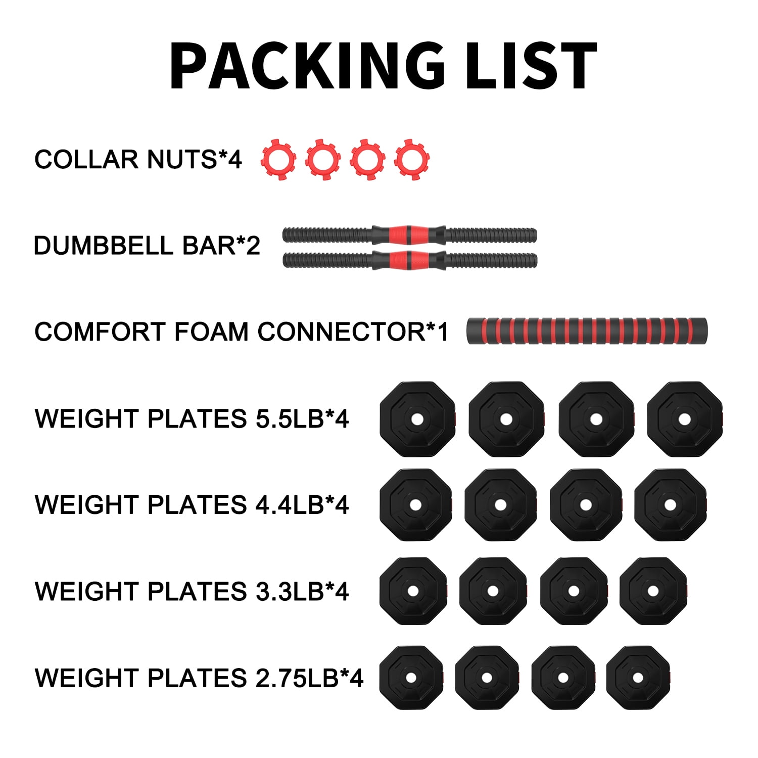 Octagonal design prevents the dumbbells from rolling, ensuring a safe and stable workout experience. Foam-covered connecting rod reduces neck compression and relieves fatigue, allowing for a more comfortable exercise session. Non-slip rubber-coated handle provides a firm grip, enhancing your control and grip strength during workouts. Durable construction with a combination of polyethylene, EVA resin, and cement mixture ensures the dumbbells are solid and sturdy. Elastic material increases the cushioning space and protects your floor from potential damage caused by the dumbbells. Adjustable weight settings allow you to customize the resistance from 2.75 lbs to 66 lbs, catering to your fitness level and training needs. Versatile design suitable for targeted exercises that engage multiple muscle groups, leading to improved overall fitness and strength. Portable and convenient for home workouts or on-the-go exercises, making it an excellent choice for a healthy gift.