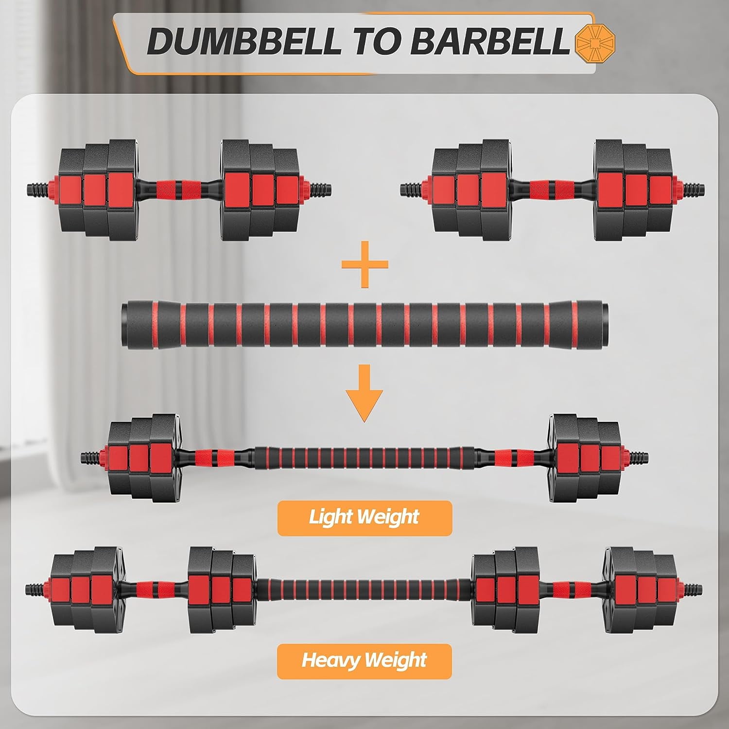 FIXTECH 66LB Adjustable Dumbbells Set, Weight Plate with Connector Used as Barbell, Fitness Strength Exercises for Home Gym, Red